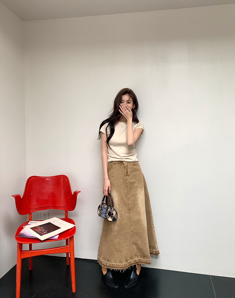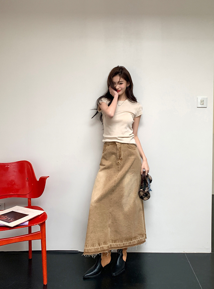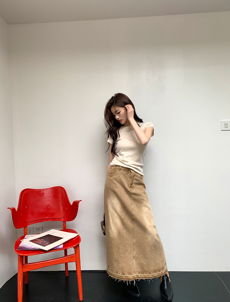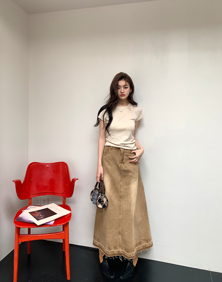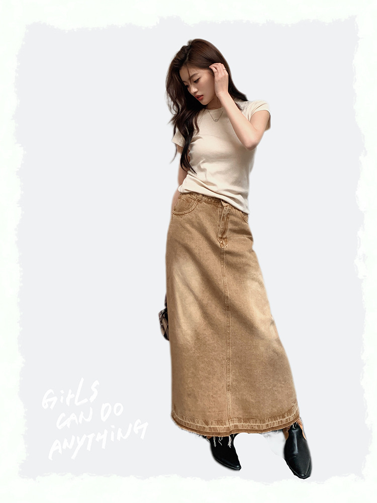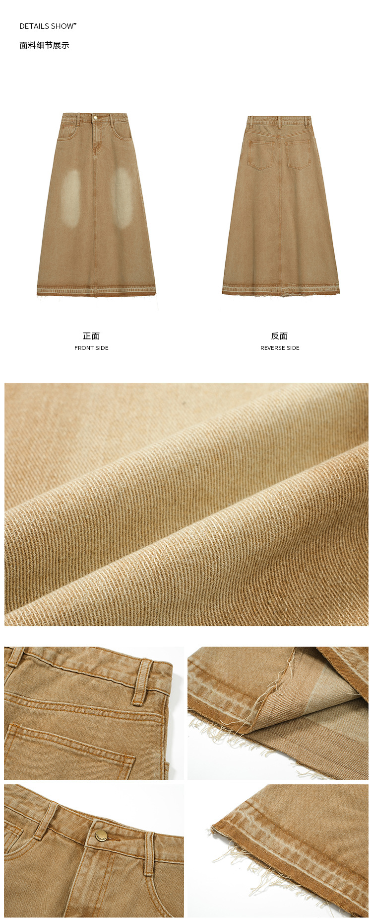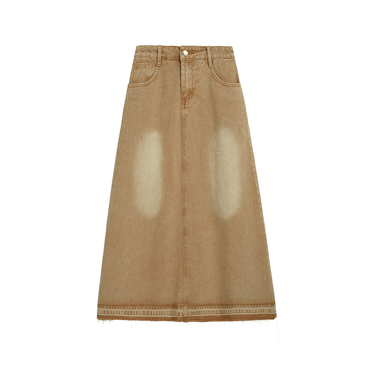 JMA-282 实拍 2023秋装韩版设计感姜黄色做旧牛仔半身裙女毛边a字裙长裙子