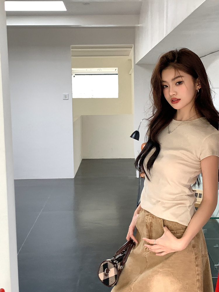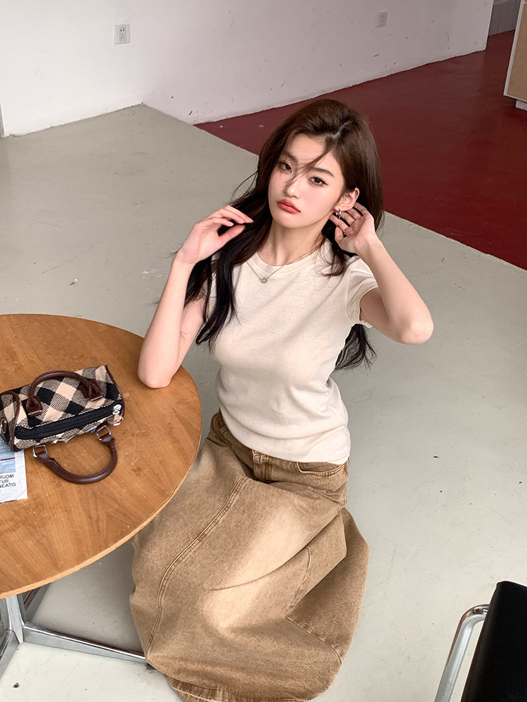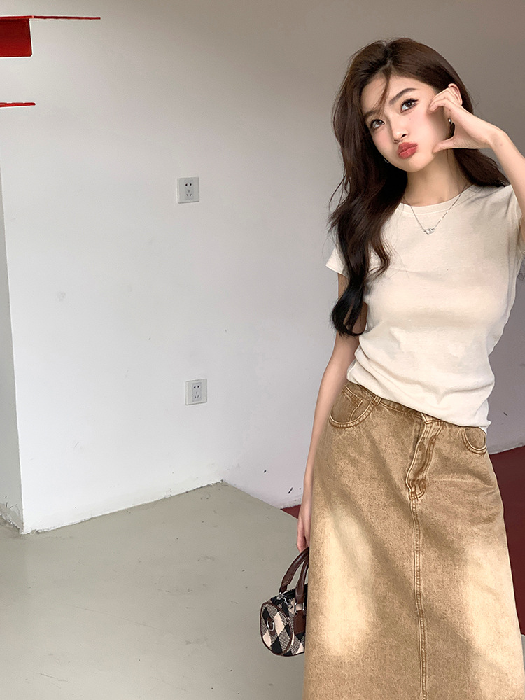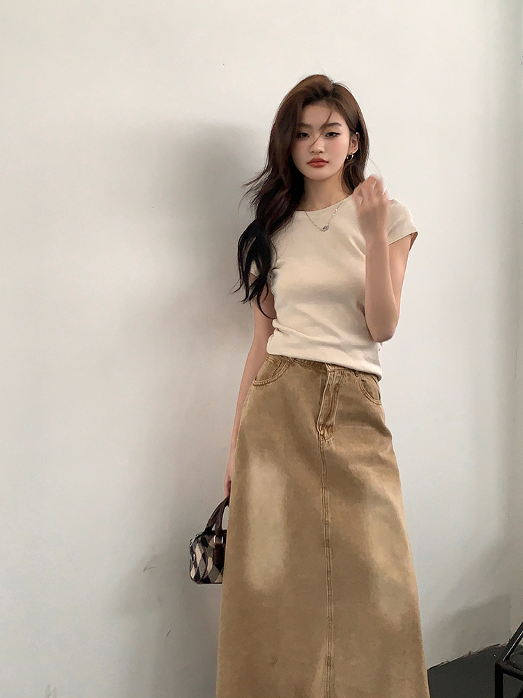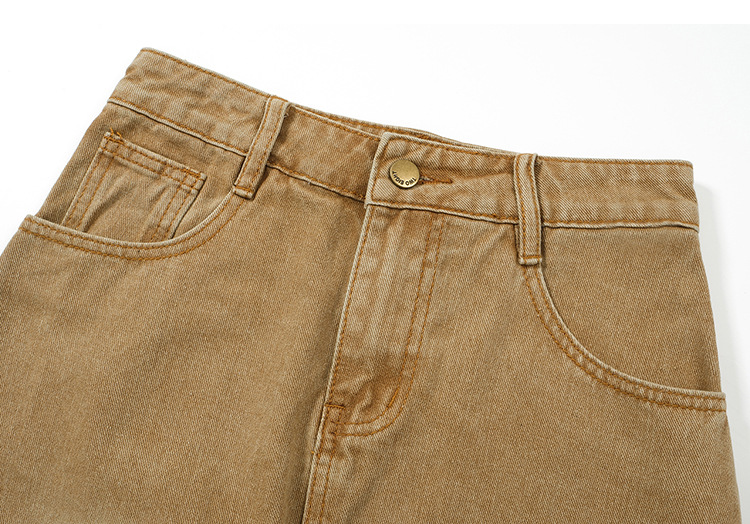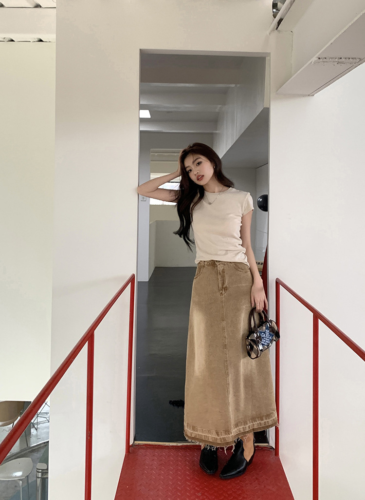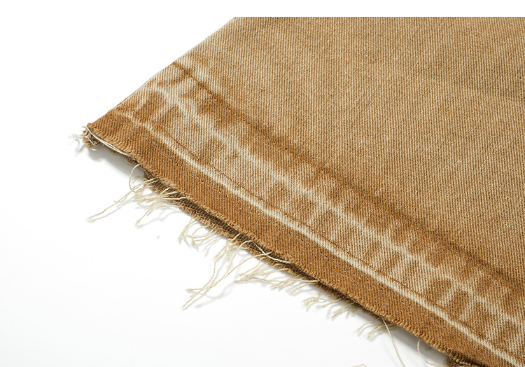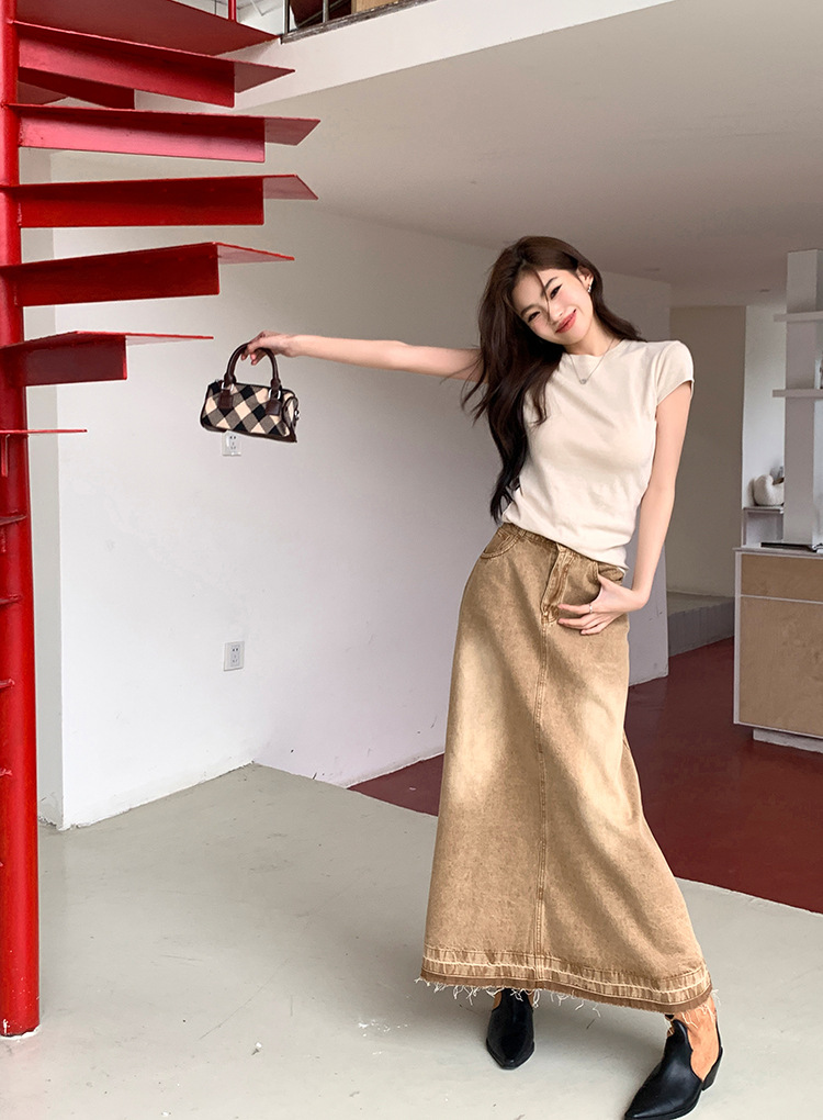JMA-282 实拍 2023秋装韩版设计感姜黄色做旧牛仔半身裙女毛边a字裙长裙子