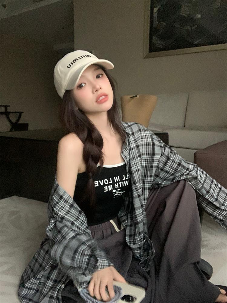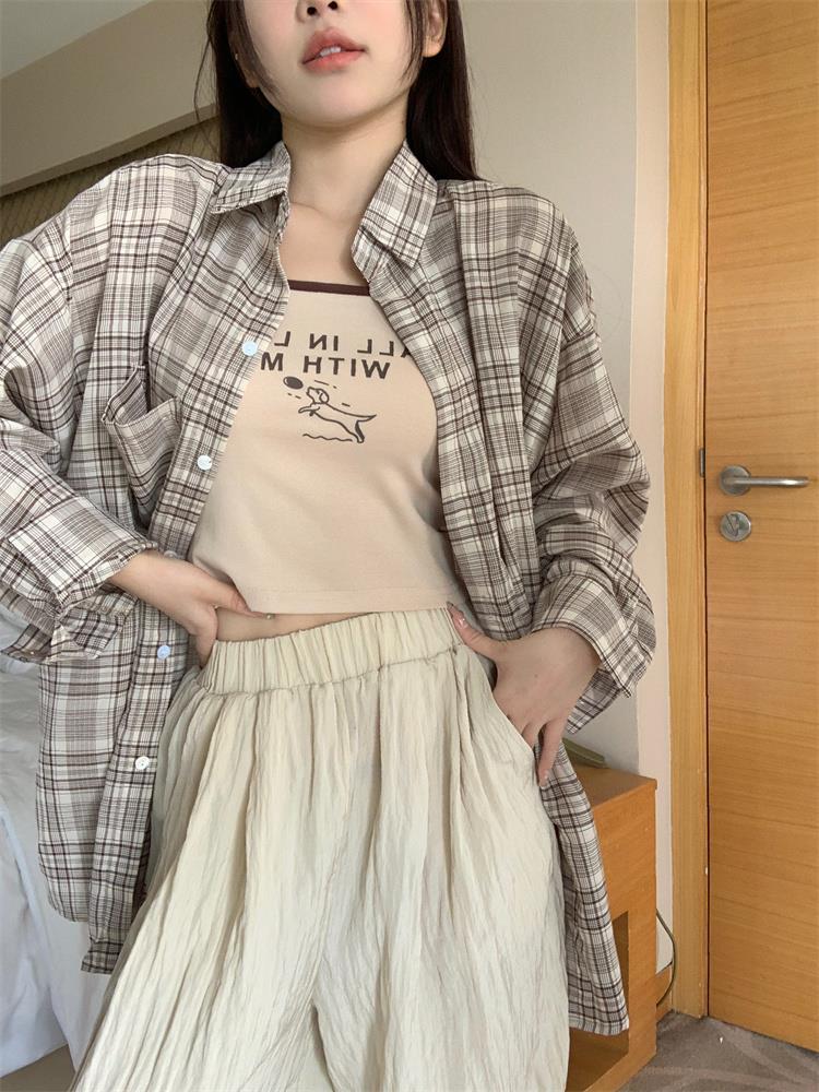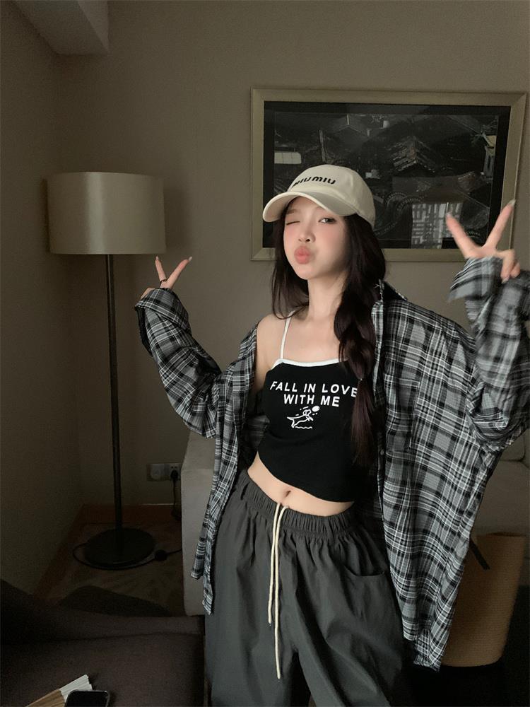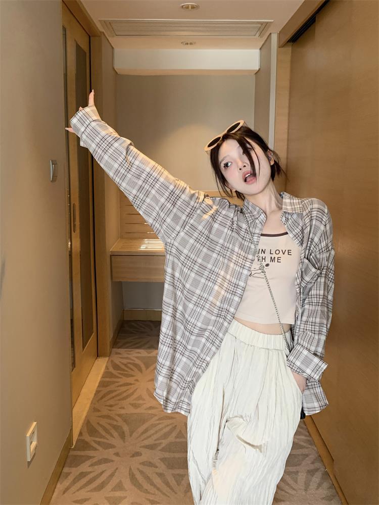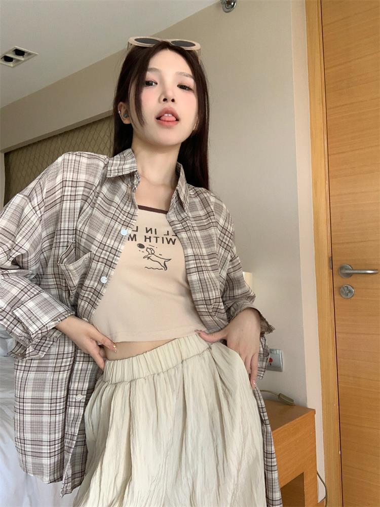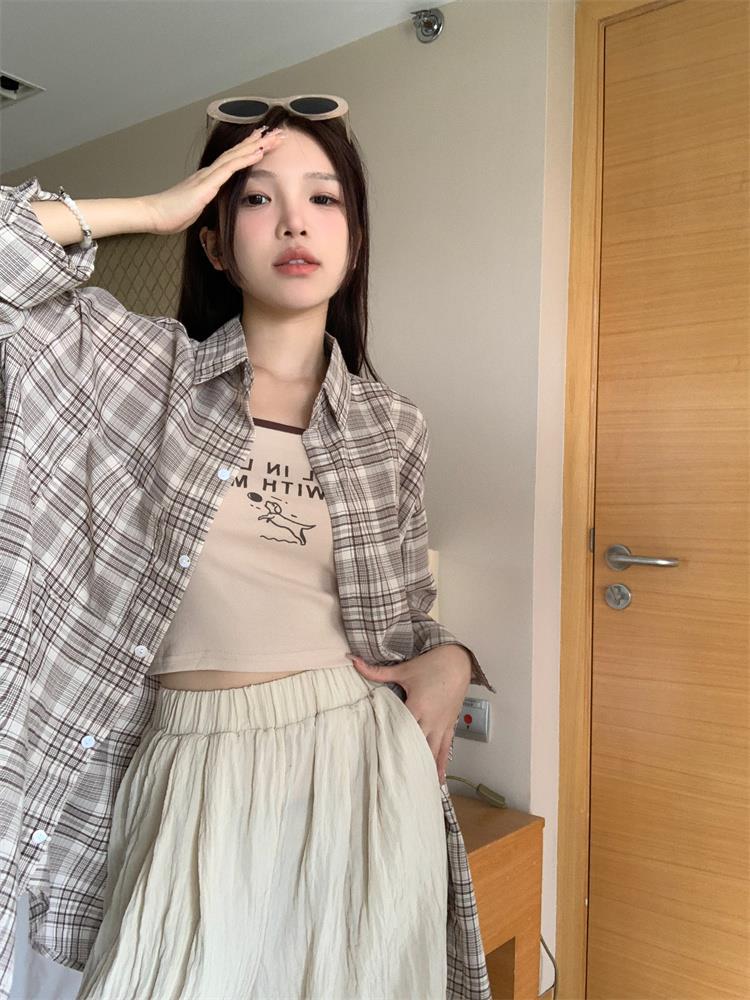 JMA-290 实拍 2023初秋季韩版复古格子防晒薄款长袖衬衫女+吊带背心两件套