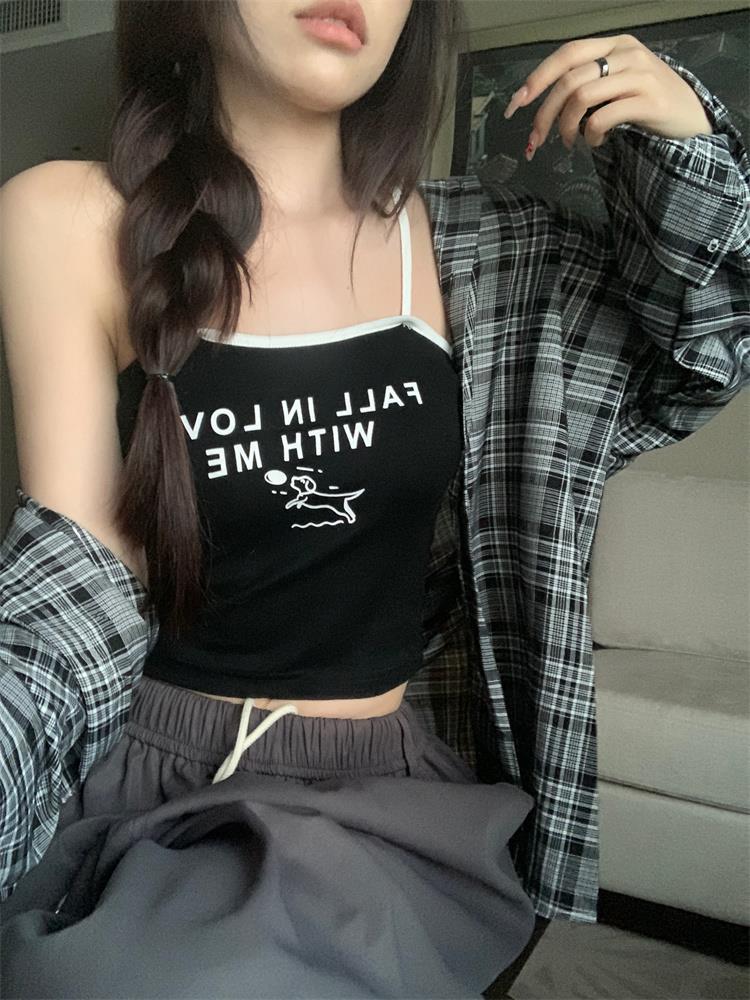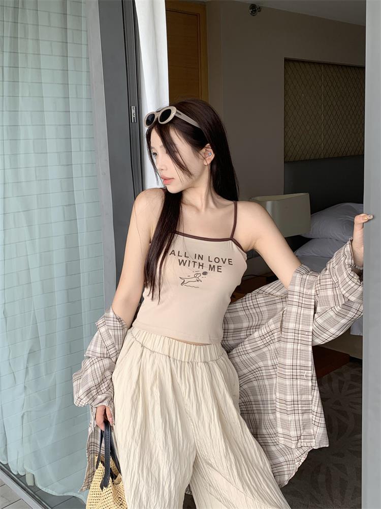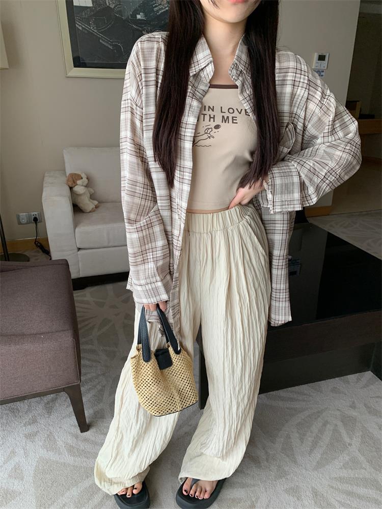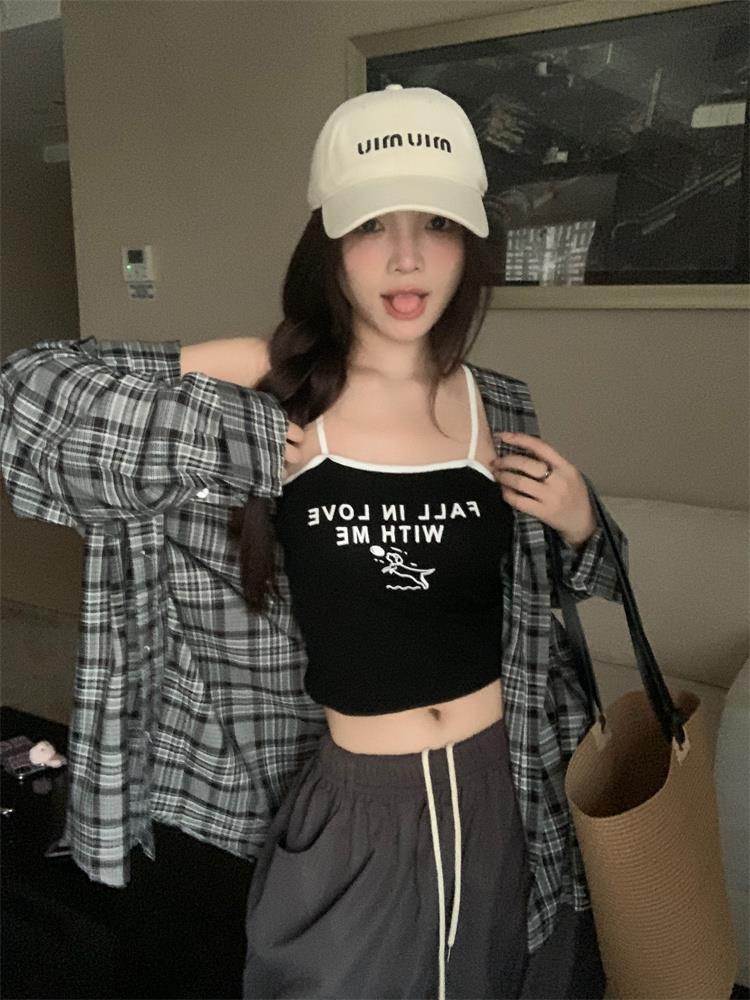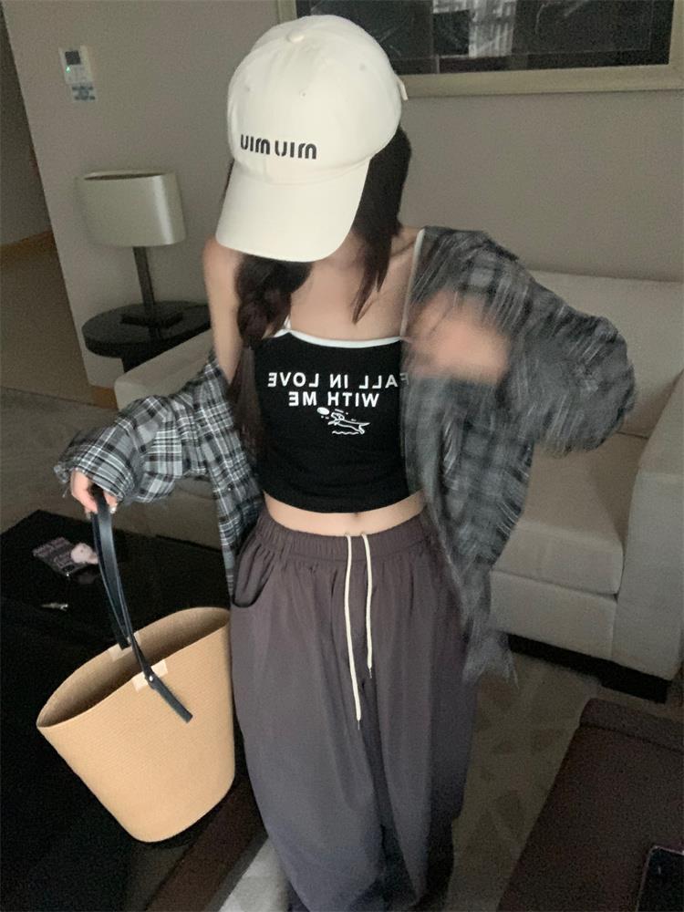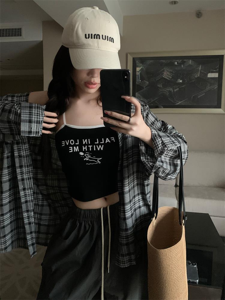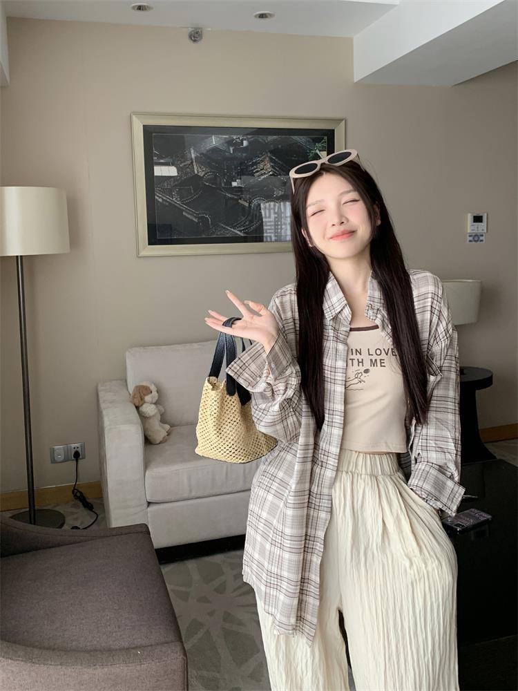 JMA-290 实拍 2023初秋季韩版复古格子防晒薄款长袖衬衫女+吊带背心两件套