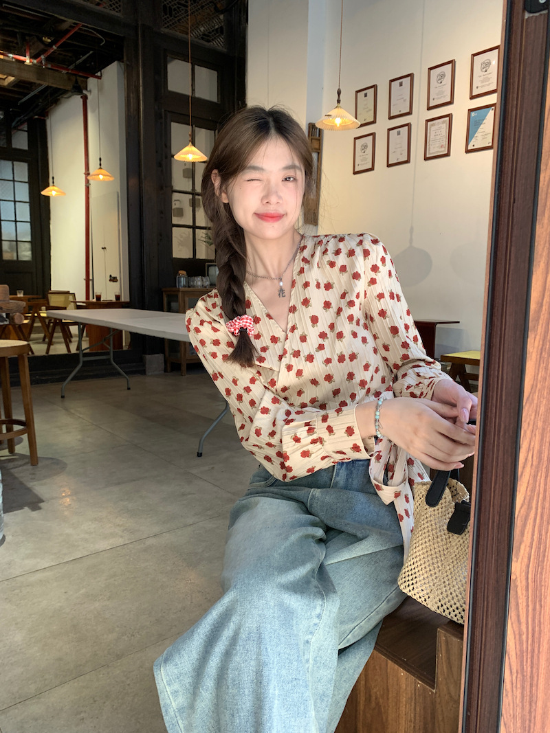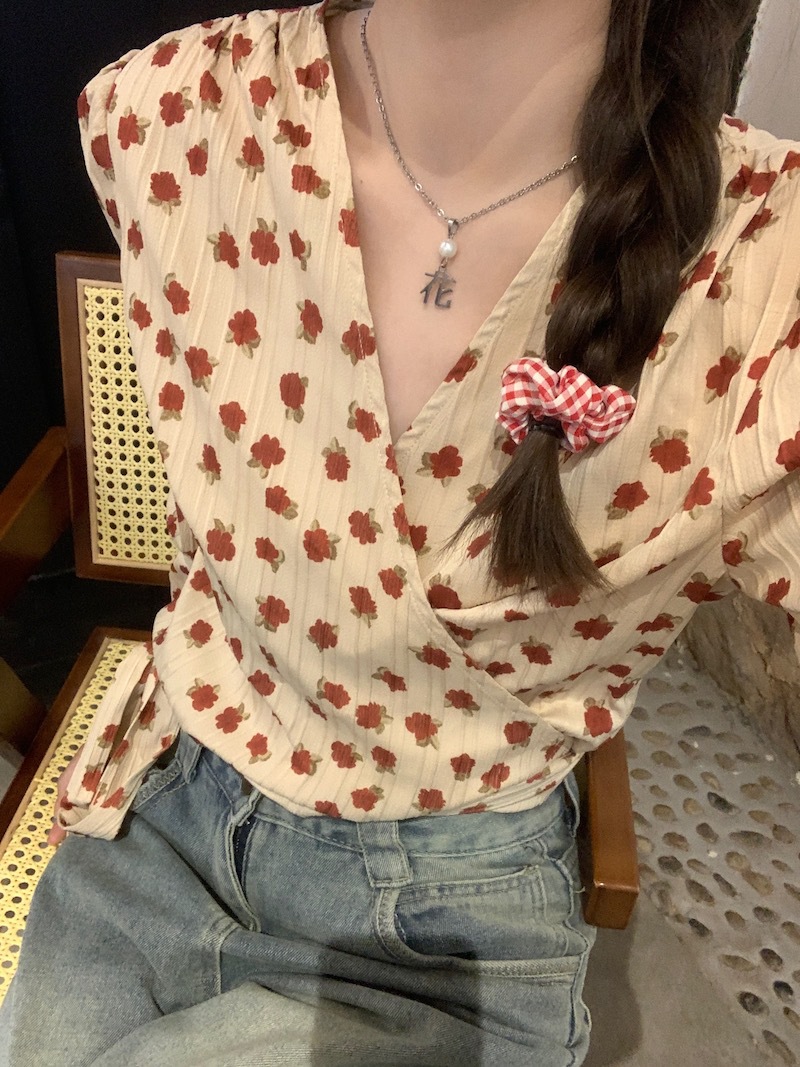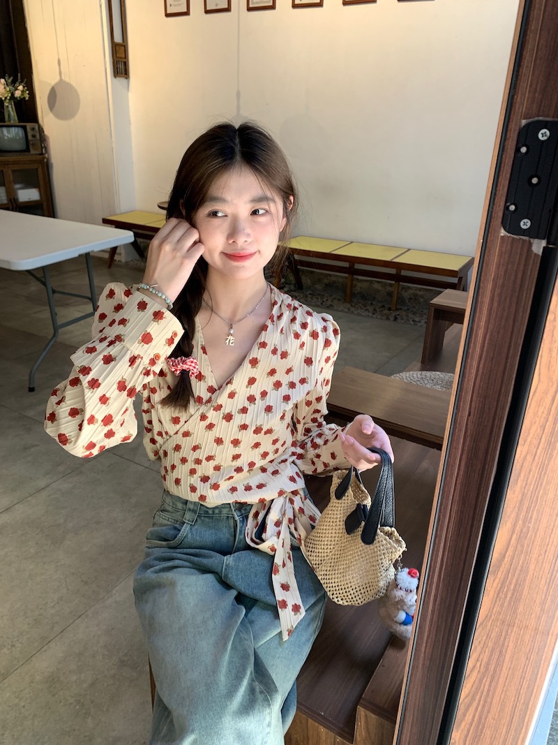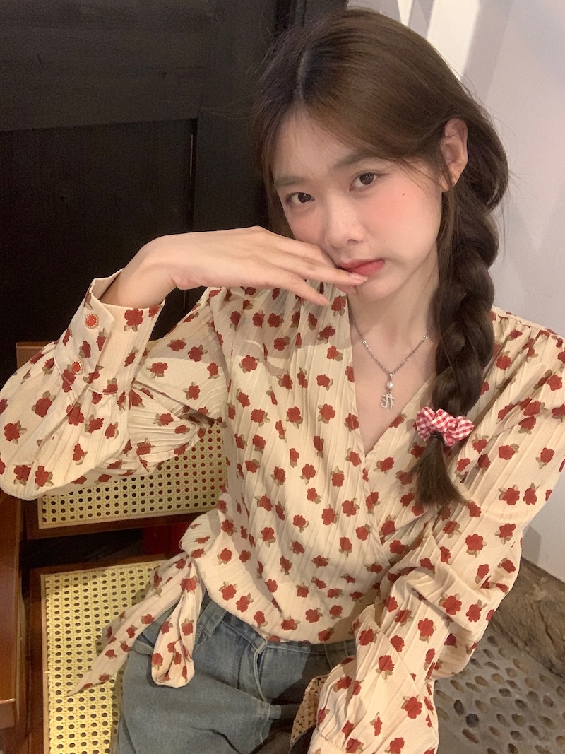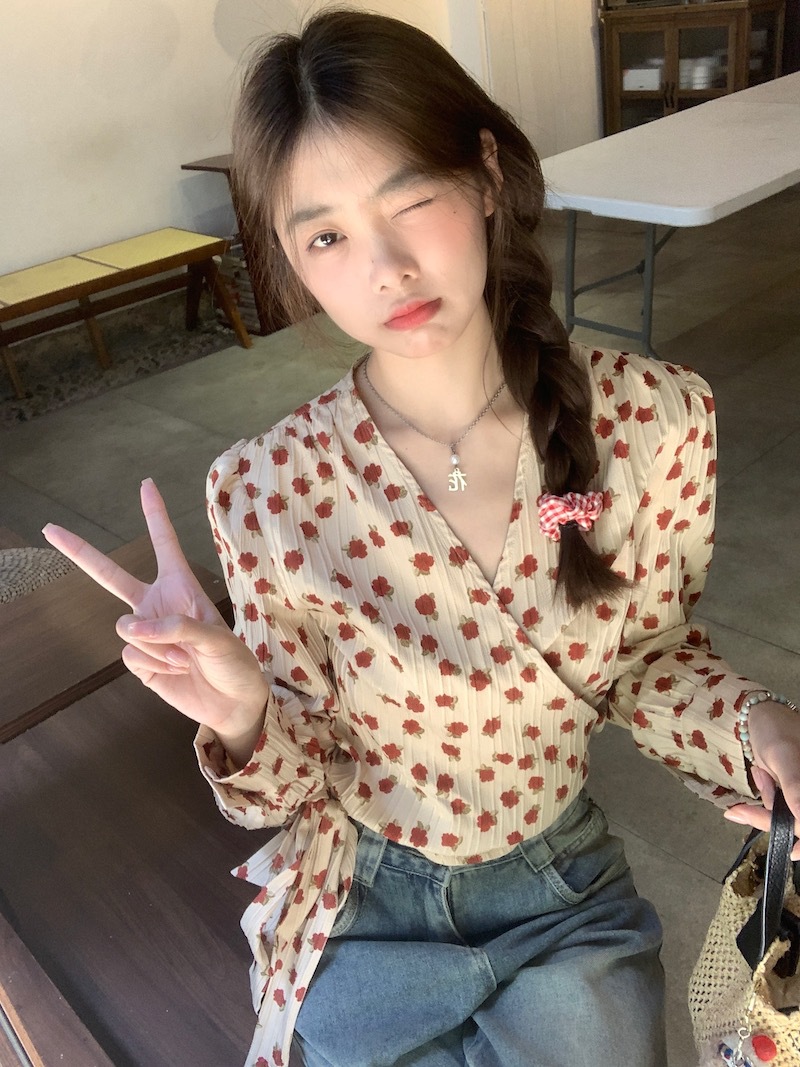 JMA-305 实拍 2023秋季新款法式复古绑带气质小众洋气碎花长袖衬衫女上衣