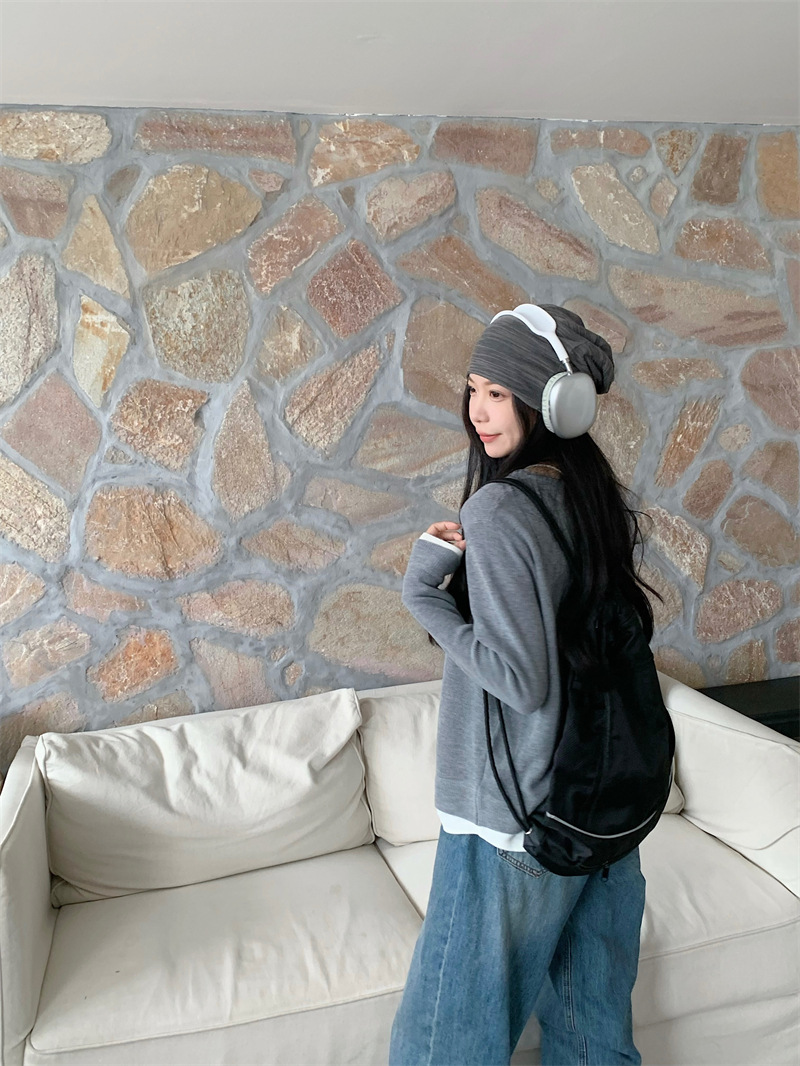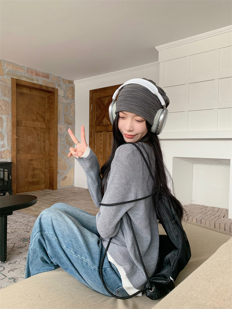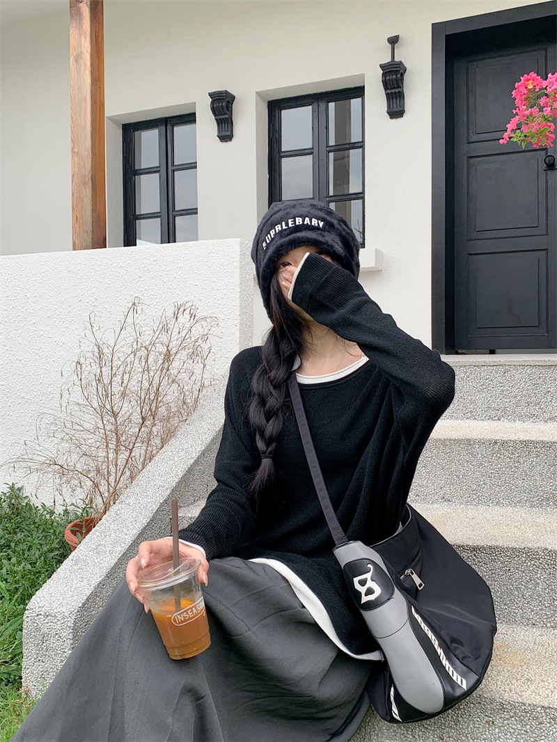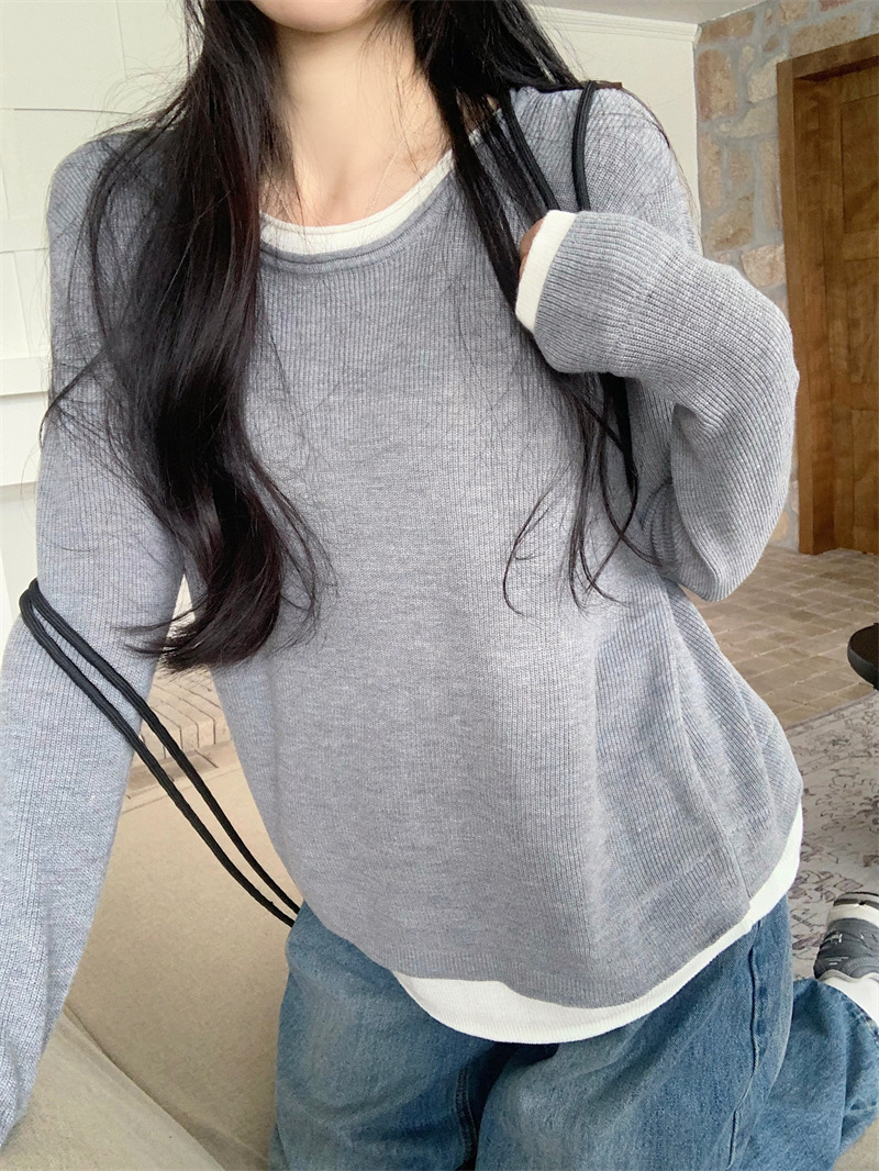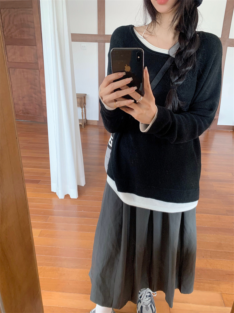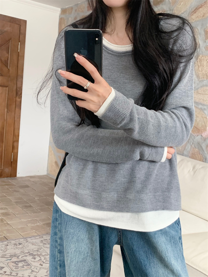 JMA-317 实拍 秋季韩系慵懒风宽松休闲显瘦长袖针织衫假两件圆领毛衣上衣