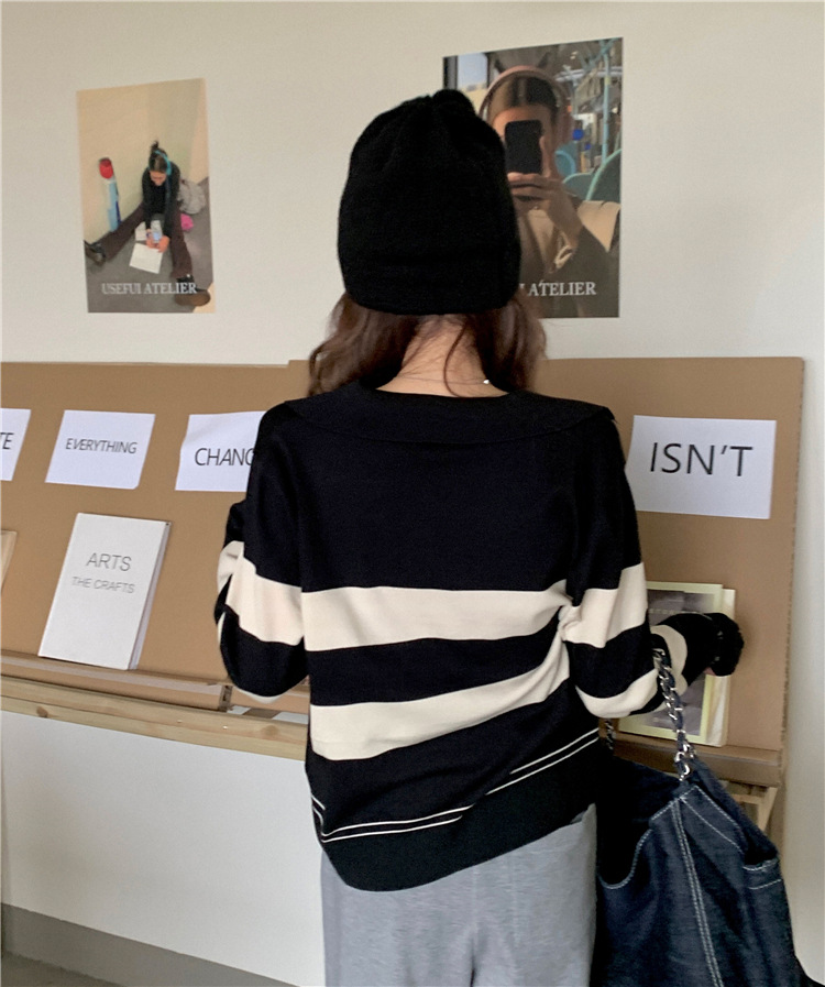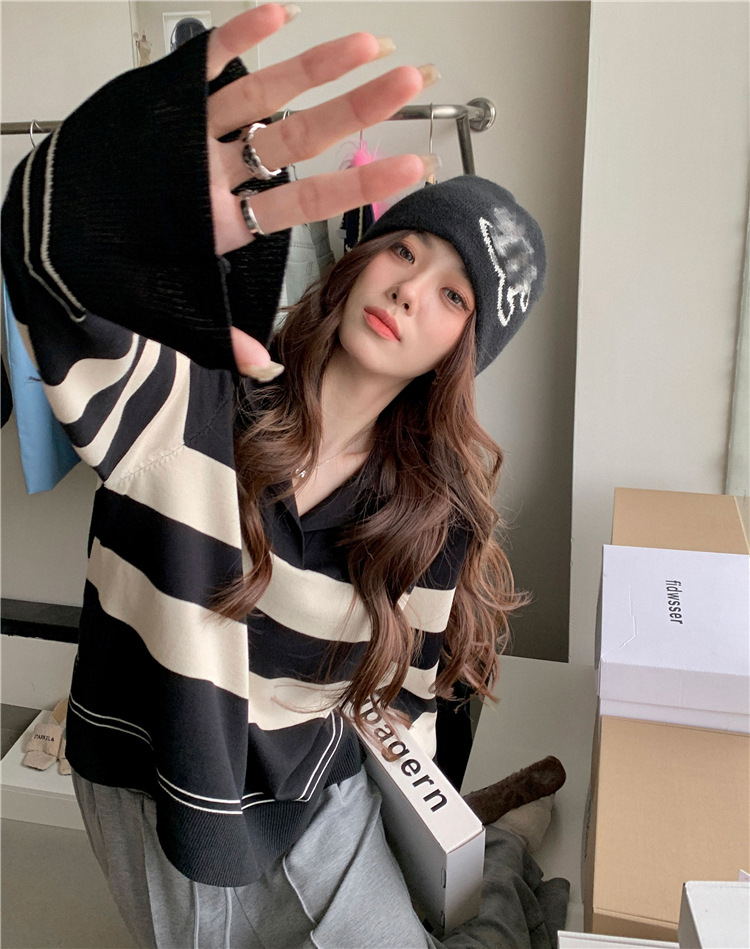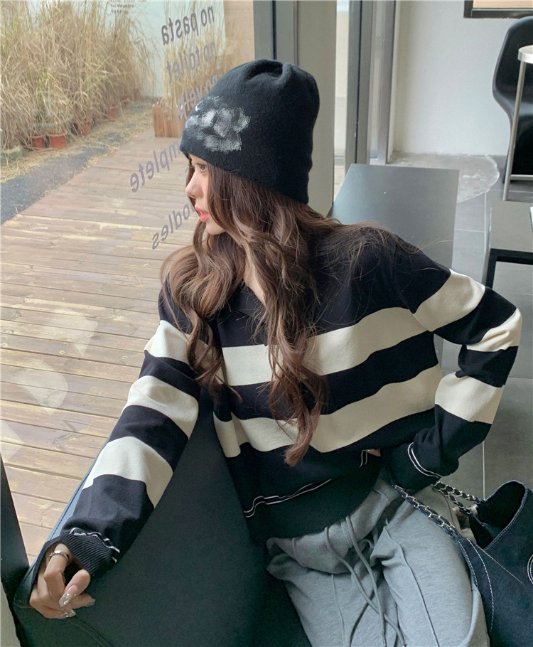 JMA-318 实拍 2023秋冬韩版复古宽松撞色条纹女韩系慵懒风针织衫毛衣上衣