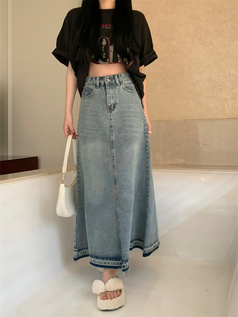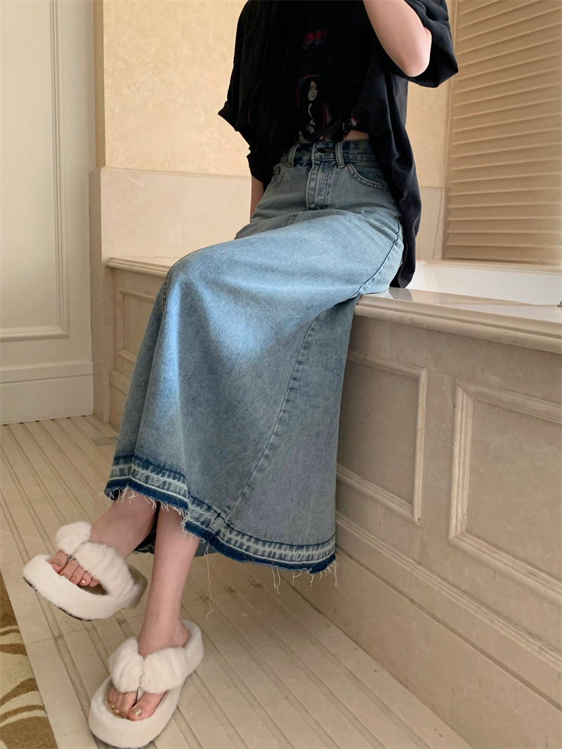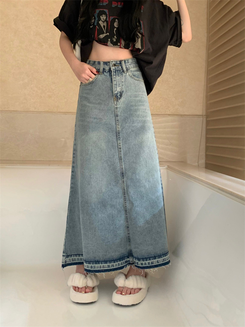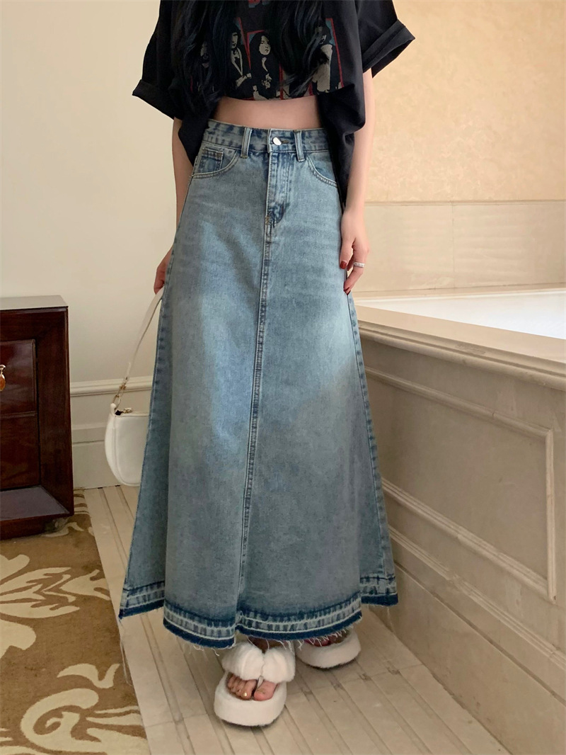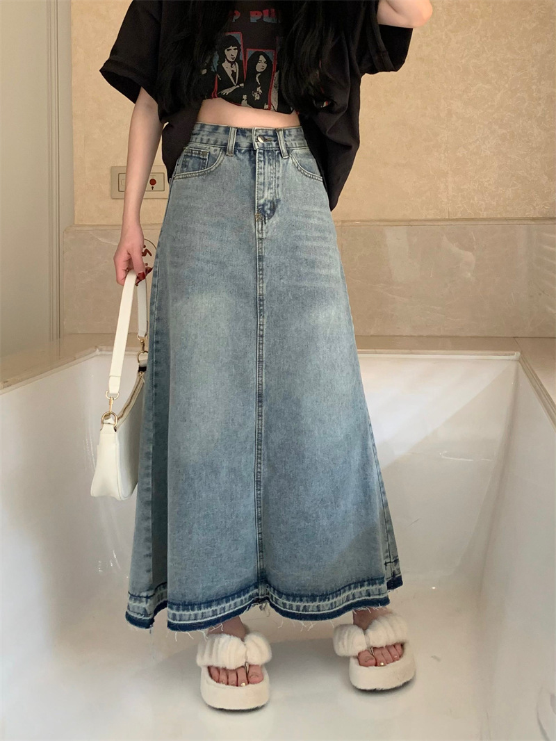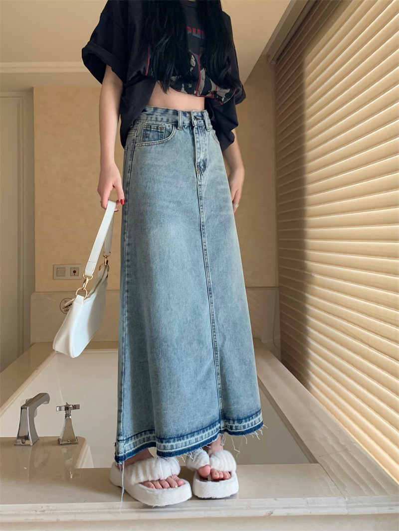 JMA-321 实拍 毛边设计感牛仔半身裙女夏季撞色高腰显瘦A字大裙摆牛仔长裙