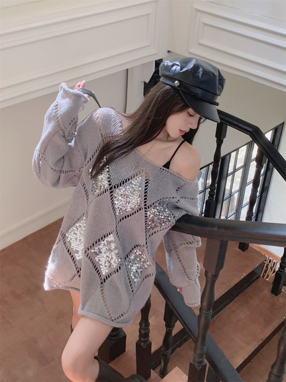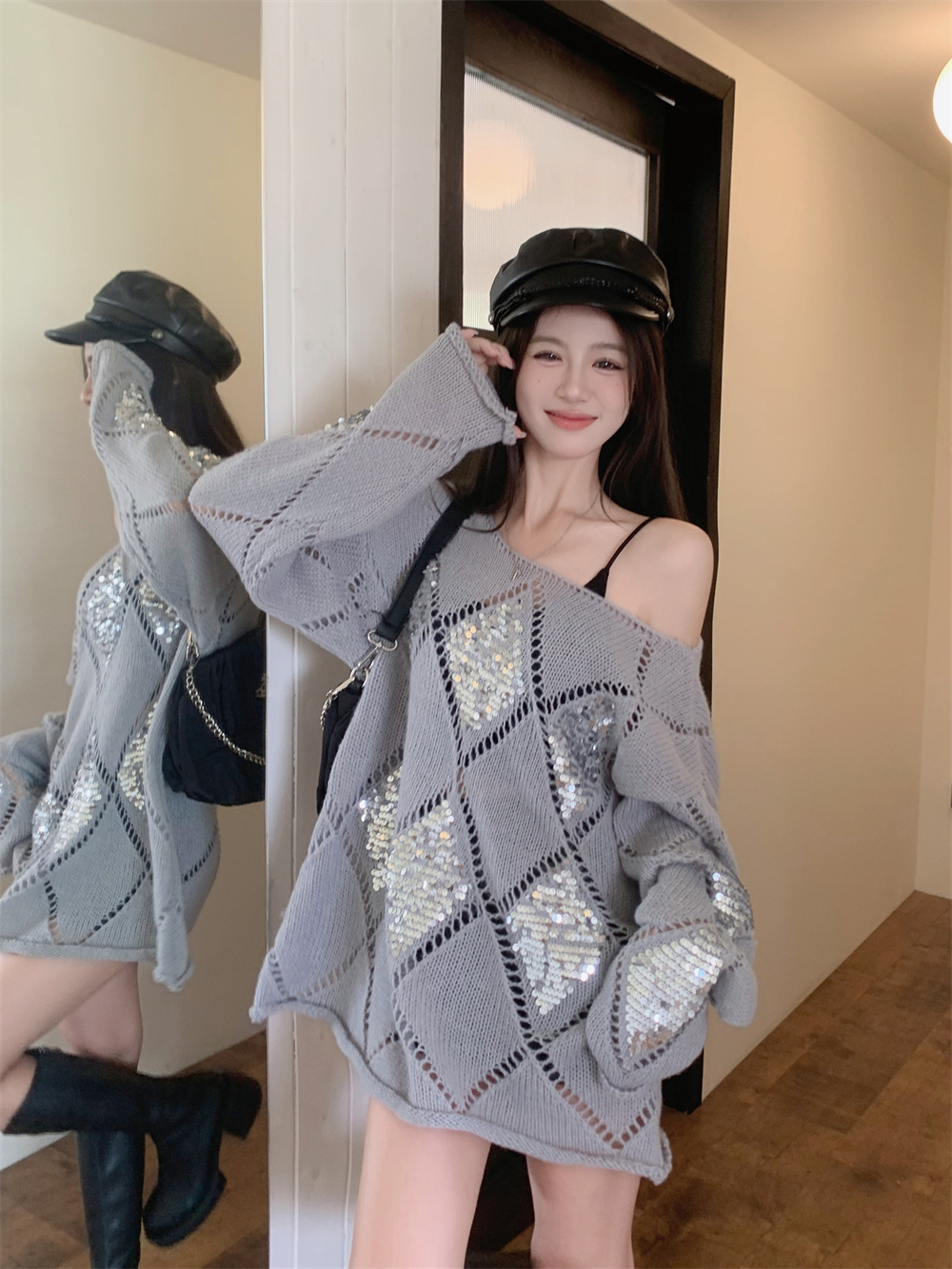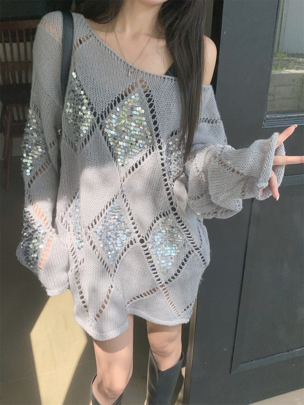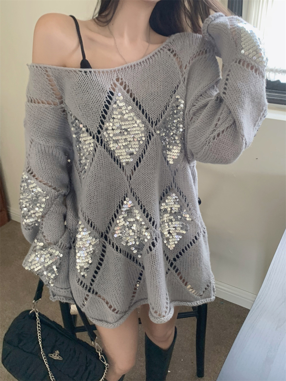 JMA-323 秋冬韩版设计感小众重工亮片菱形镂空慵懒风宽松显瘦长袖簿毛衣女