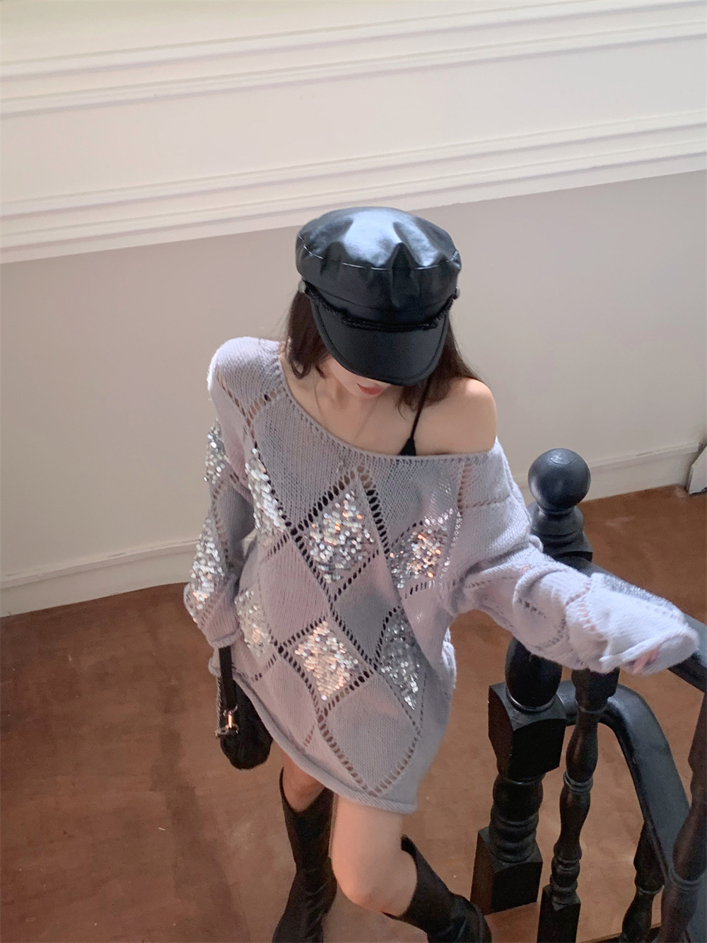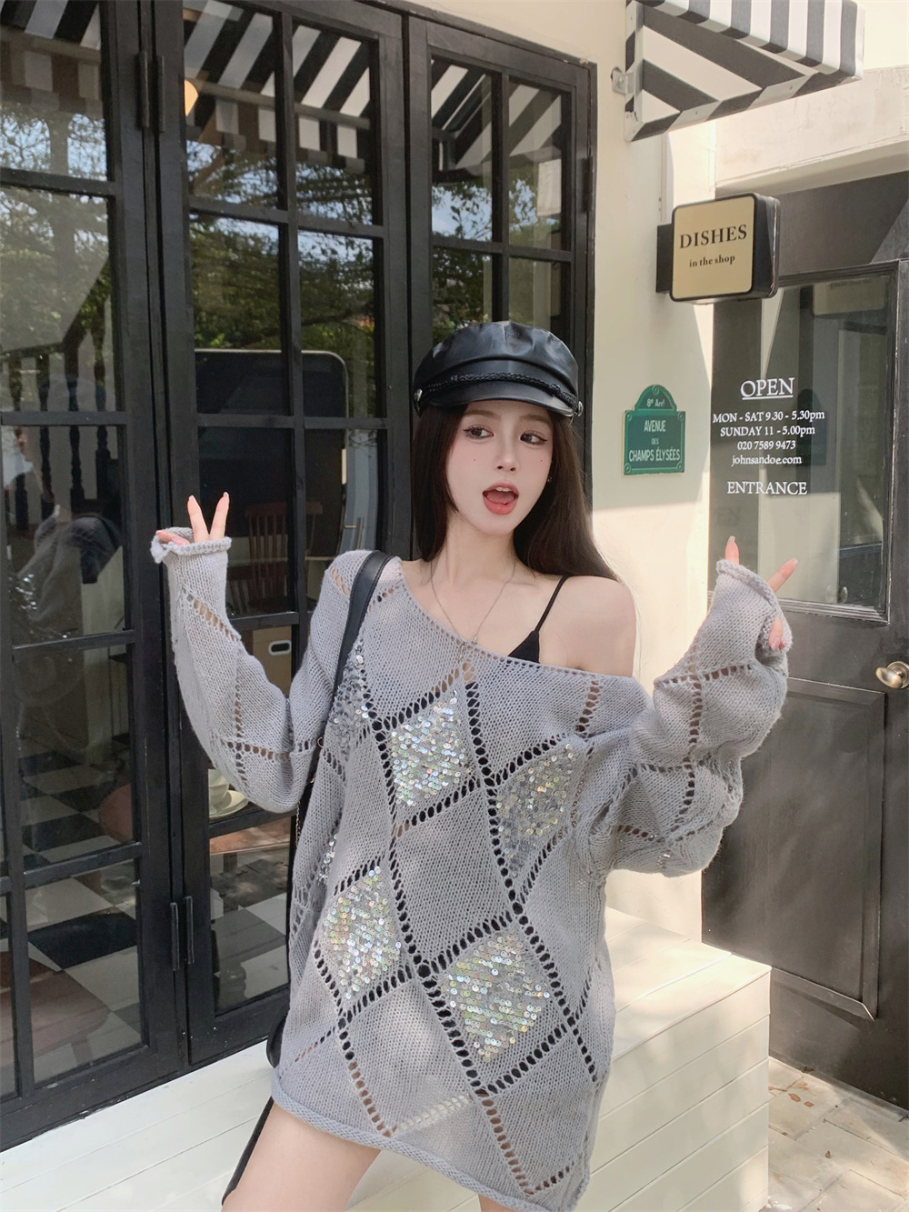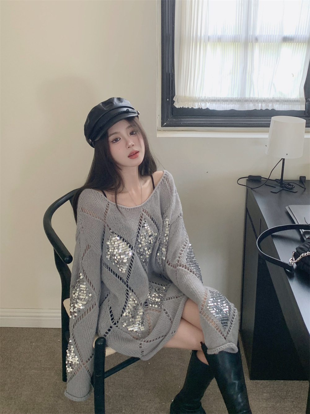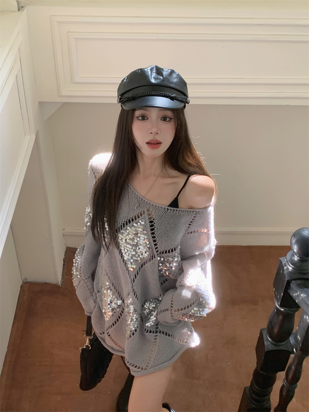 JMA-323 秋冬韩版设计感小众重工亮片菱形镂空慵懒风宽松显瘦长袖簿毛衣女