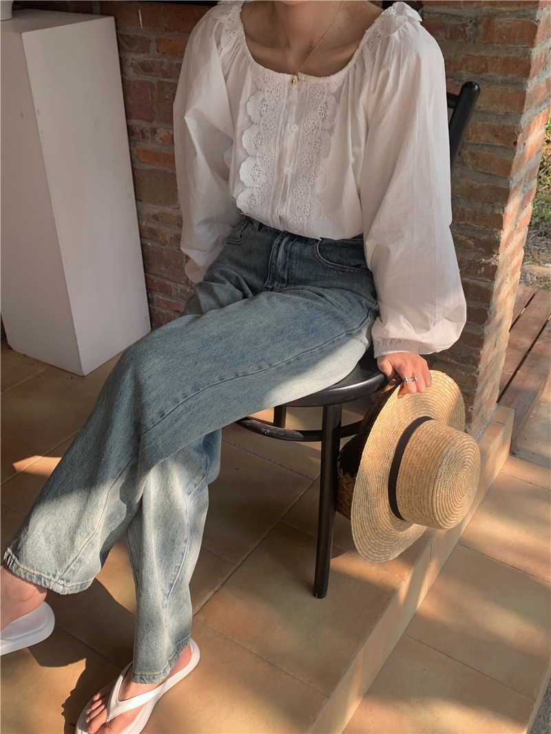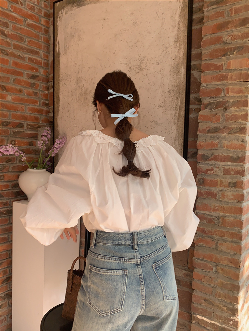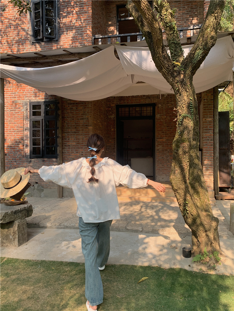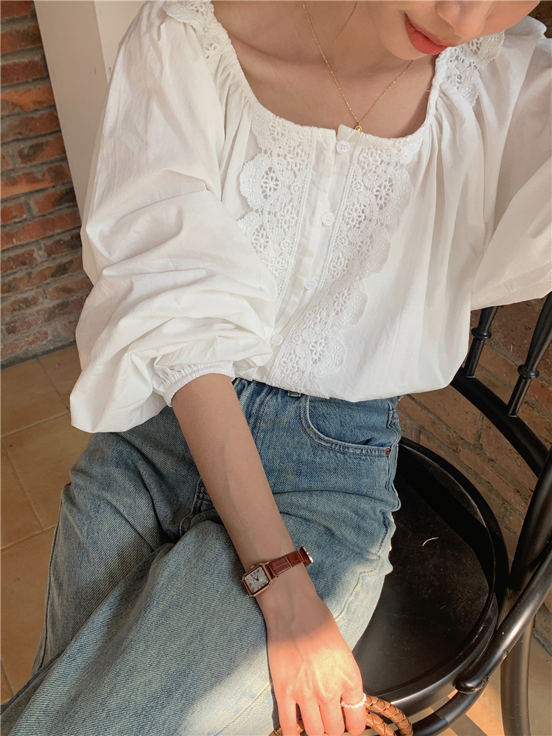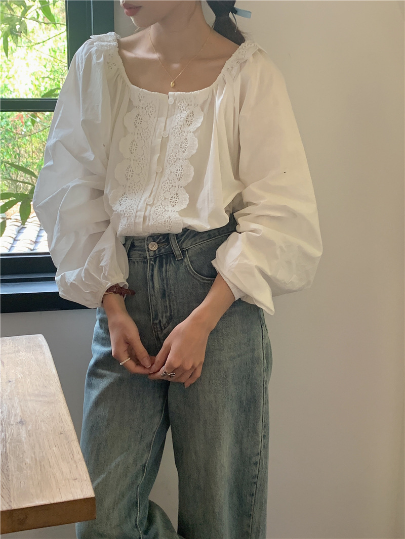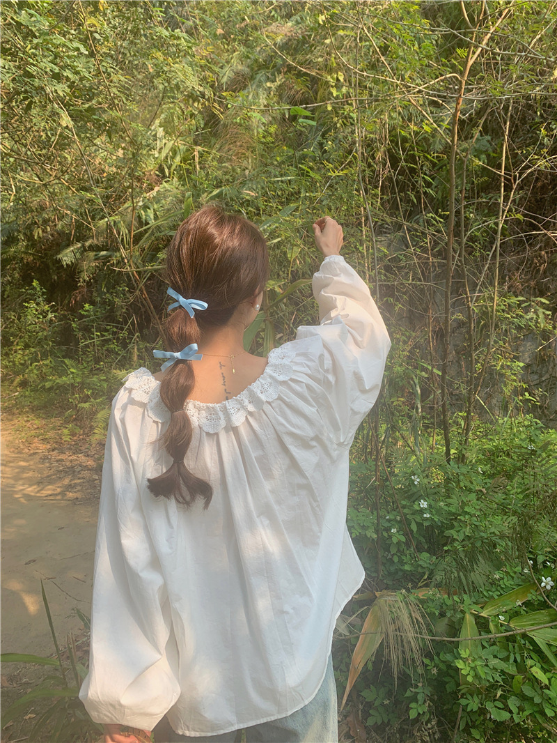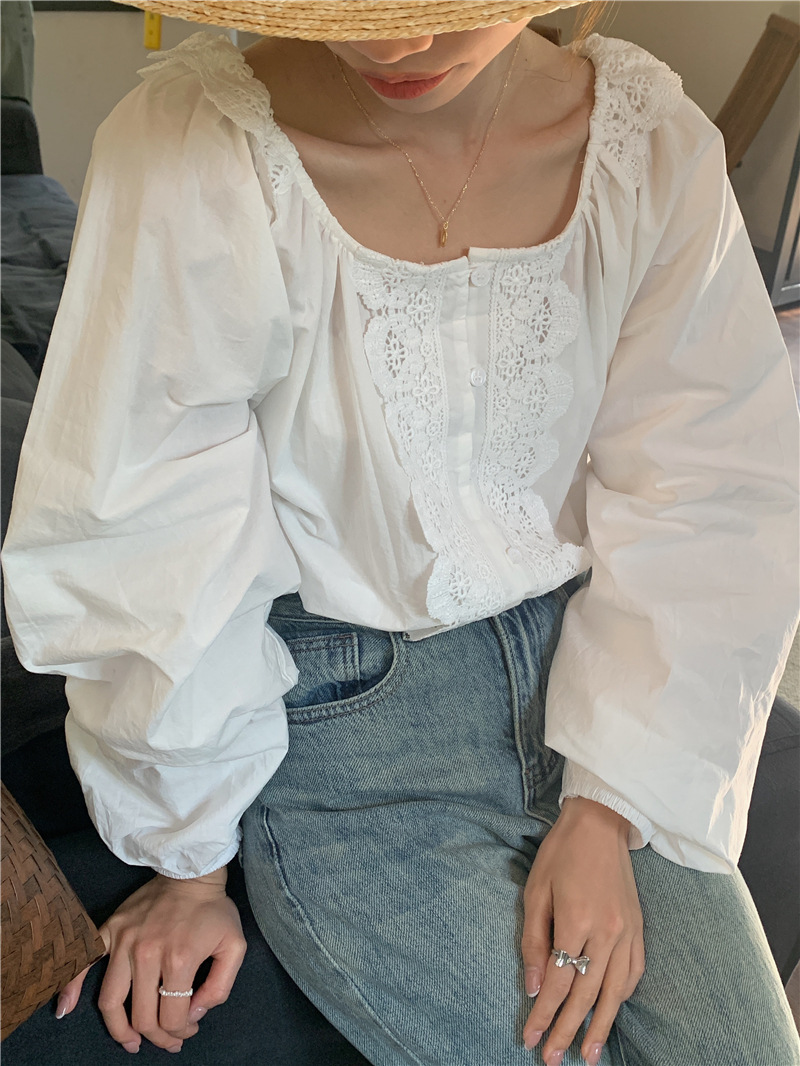 JMA-337 实拍2023秋季新款韩国甜美蕾丝边上衣减龄少女风方领白色长袖衬衫