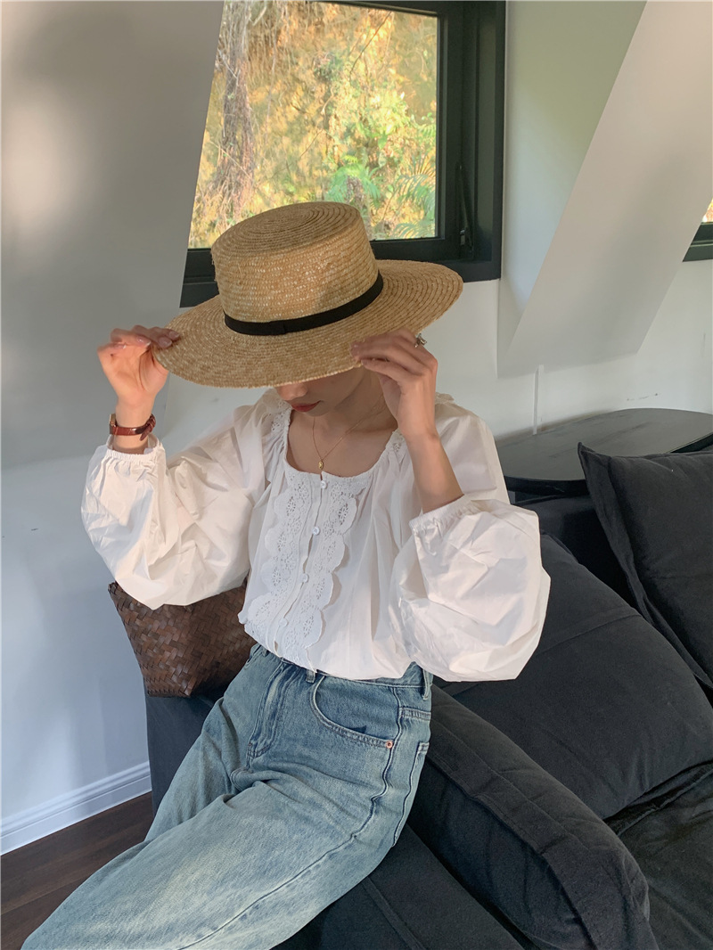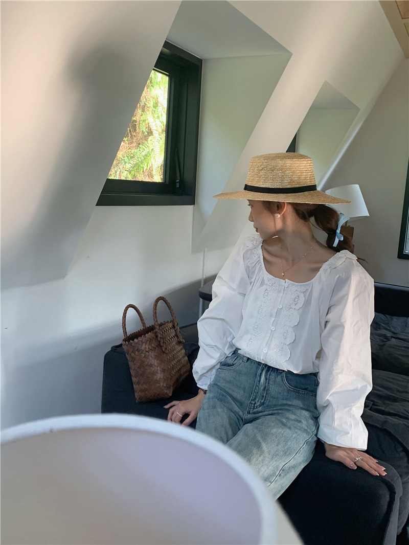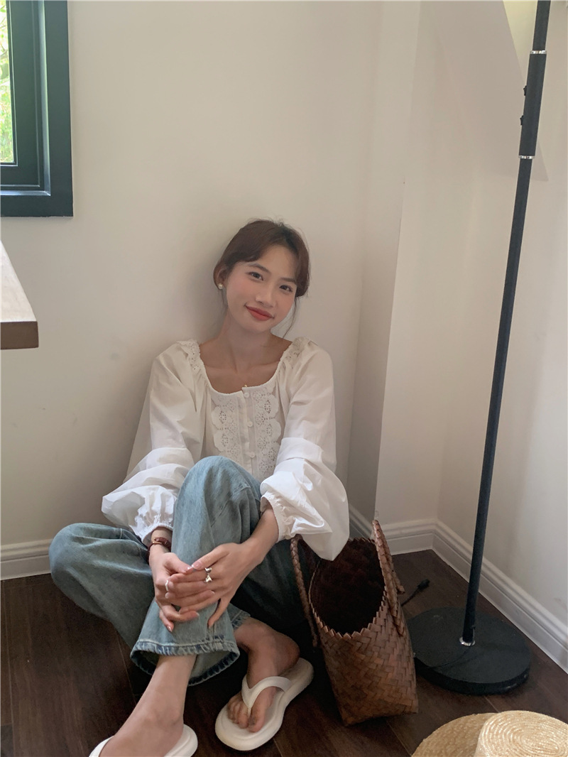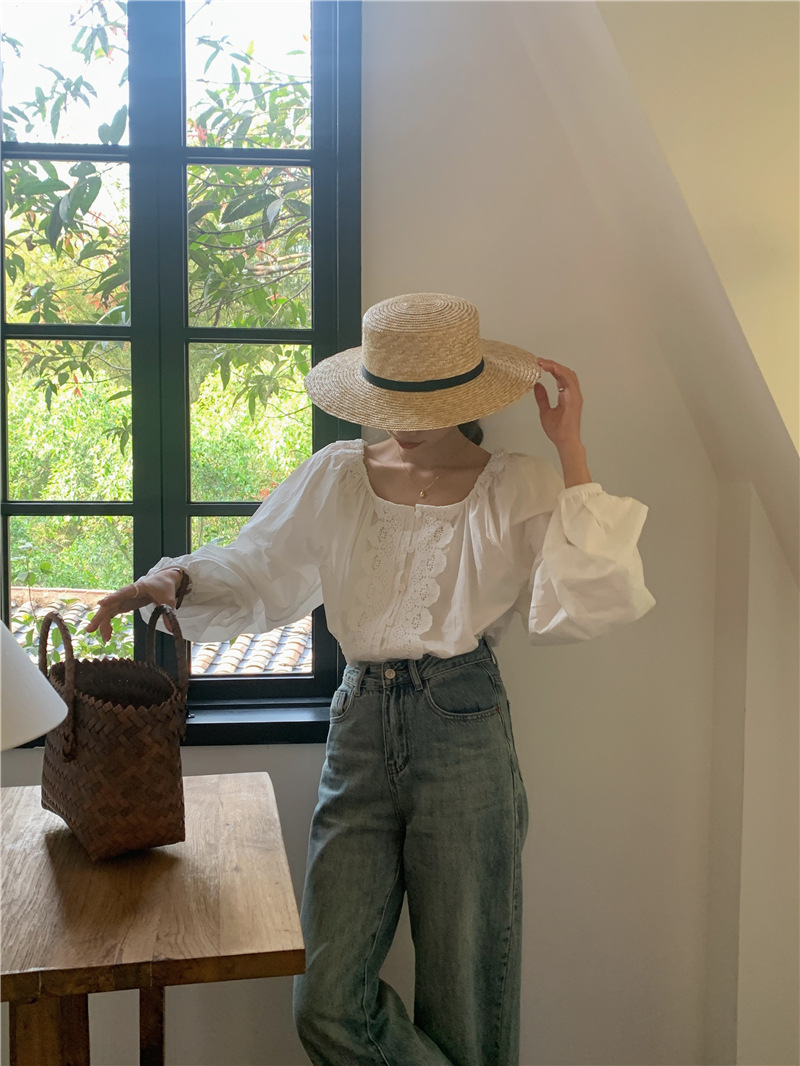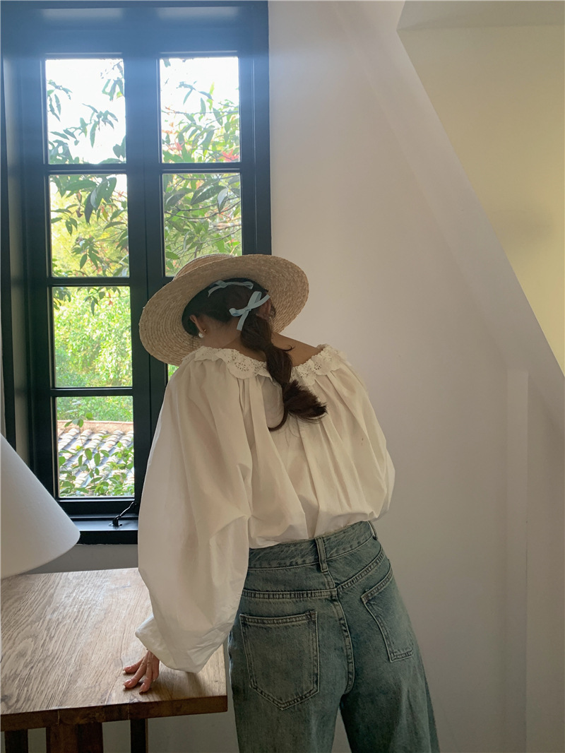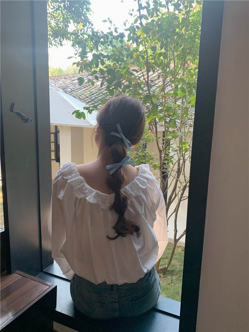 JMA-337 实拍2023秋季新款韩国甜美蕾丝边上衣减龄少女风方领白色长袖衬衫