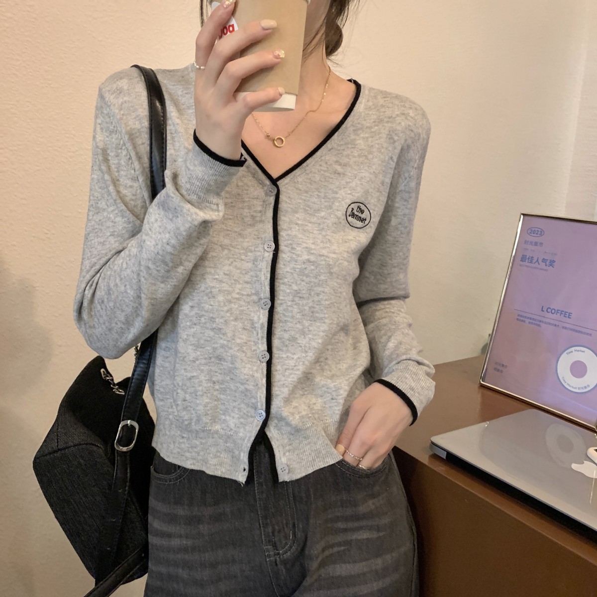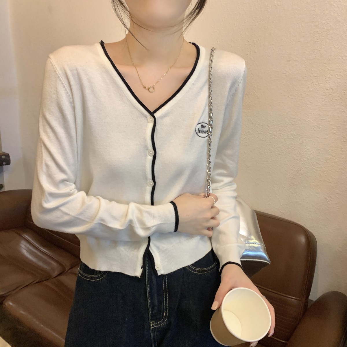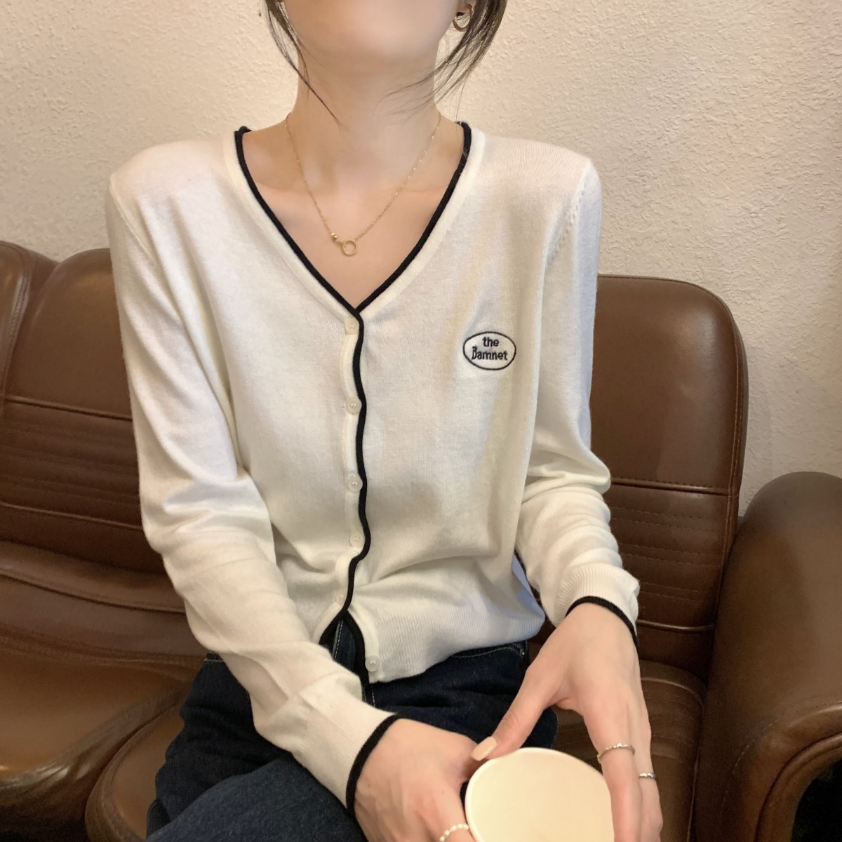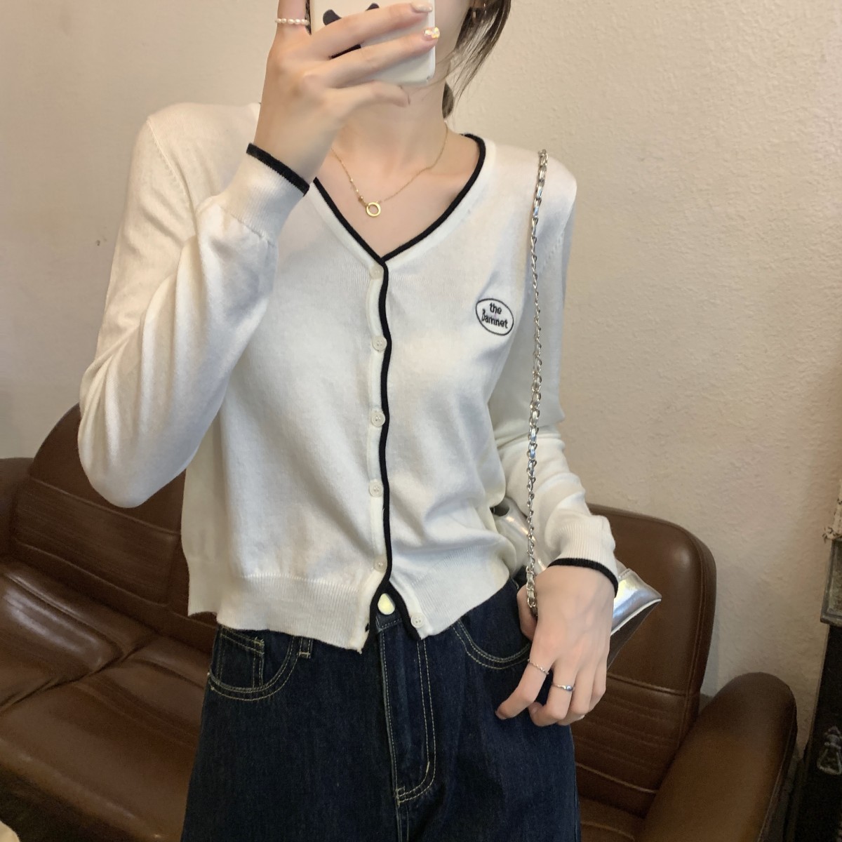 JMA-338 实拍 2023秋季新款韩版v领撞色气质V领针织长袖开衫女簿毛衣外套