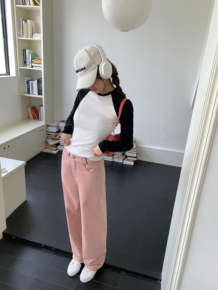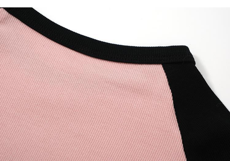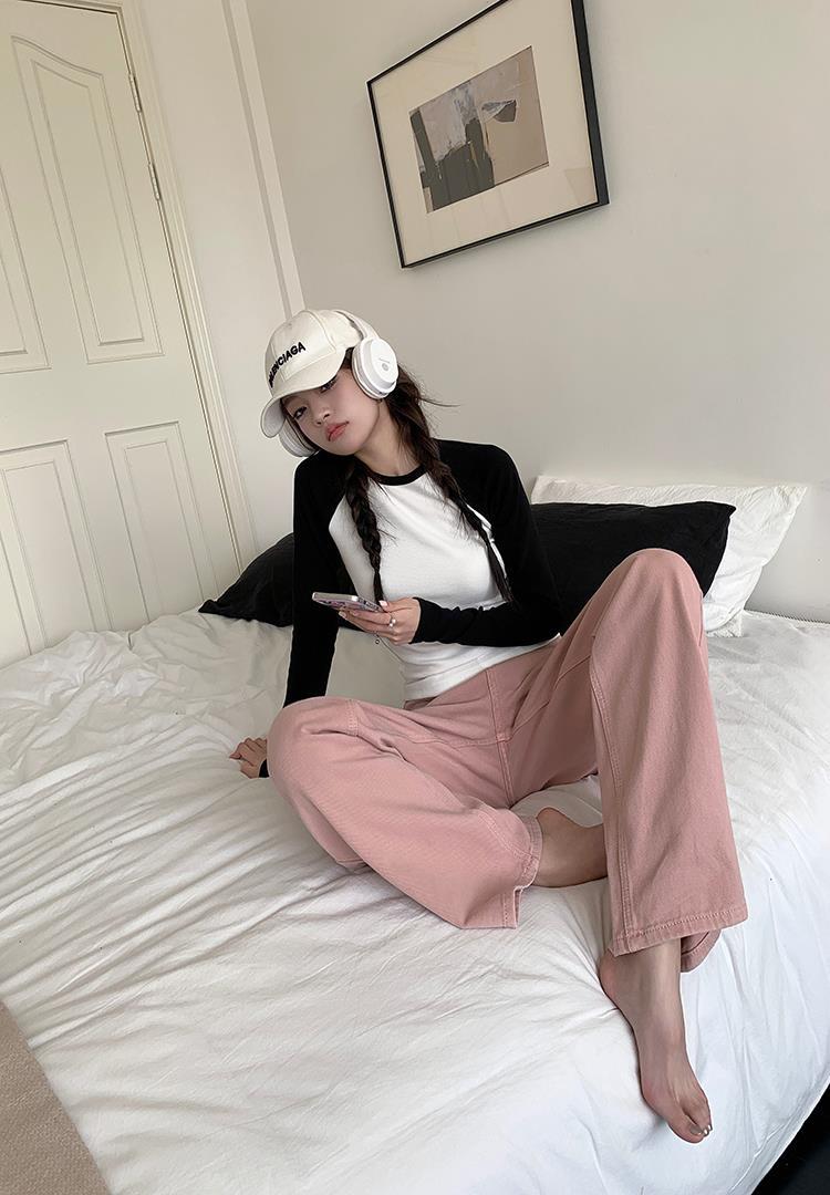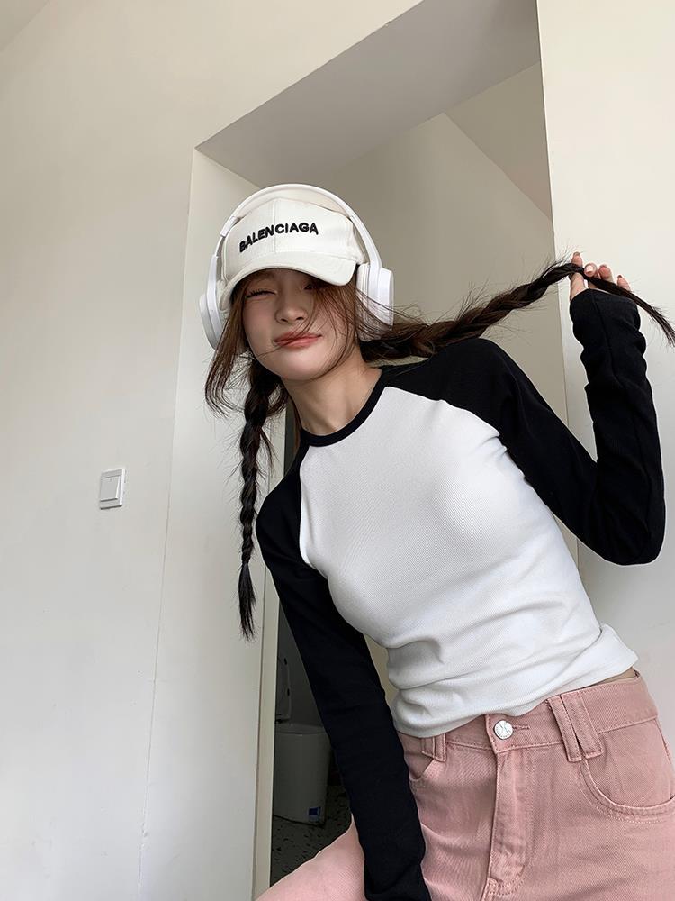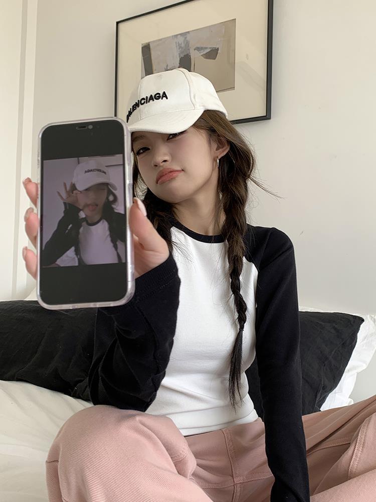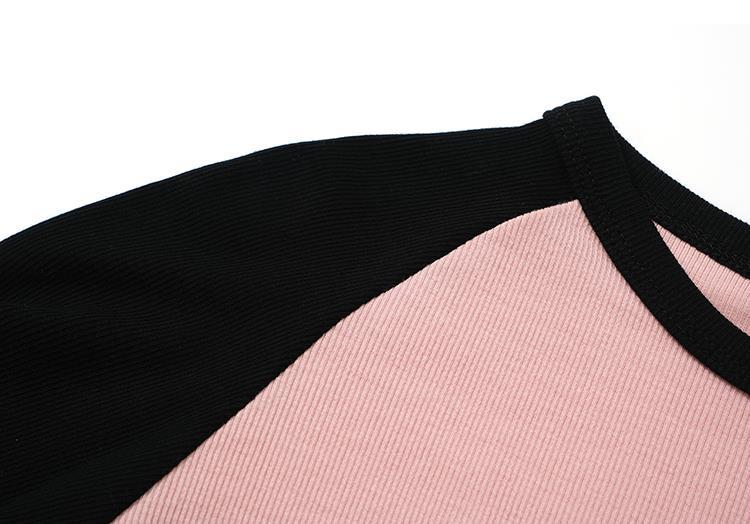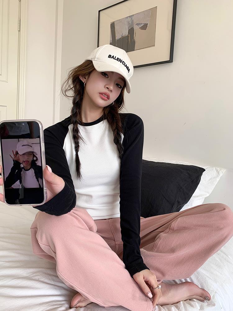 JMA-339 实拍 初秋韩系圆领拼色休闲插肩袖长袖T恤甜辣风休闲撞色百搭上衣
