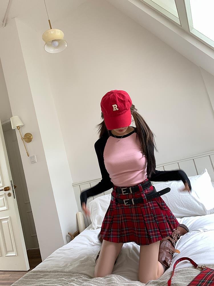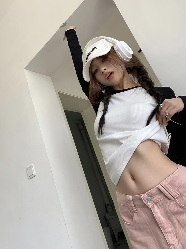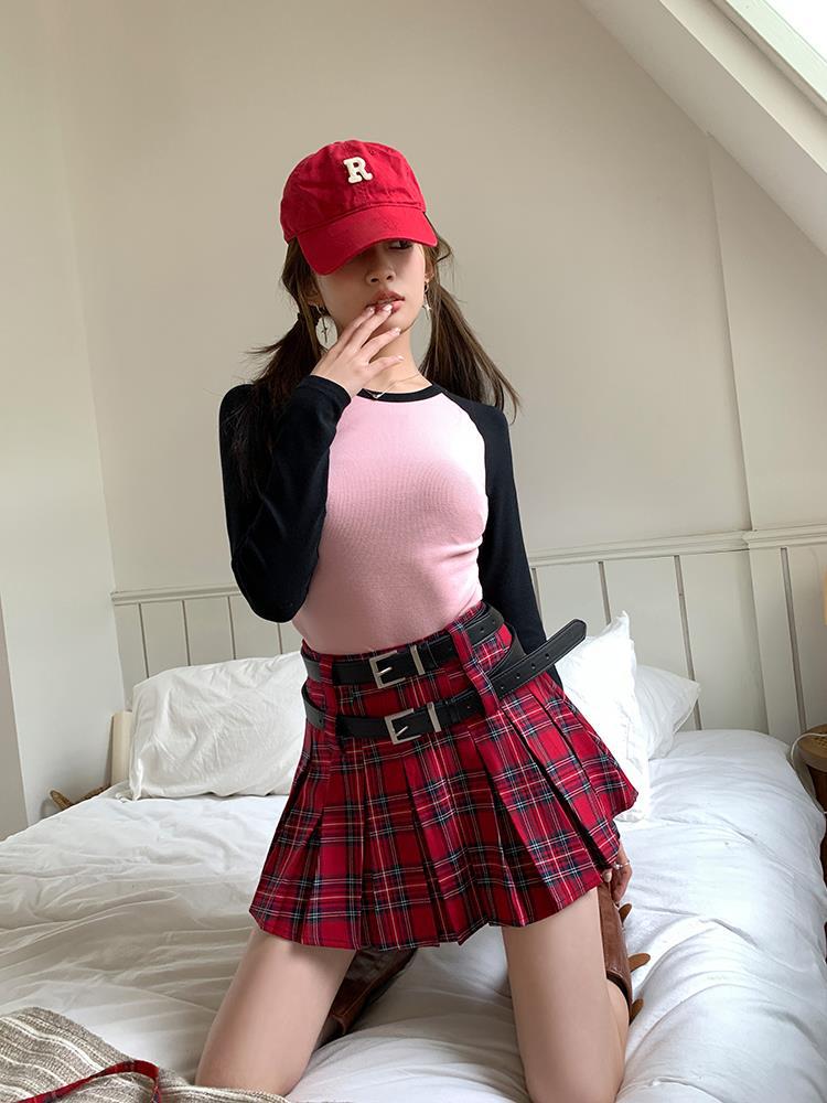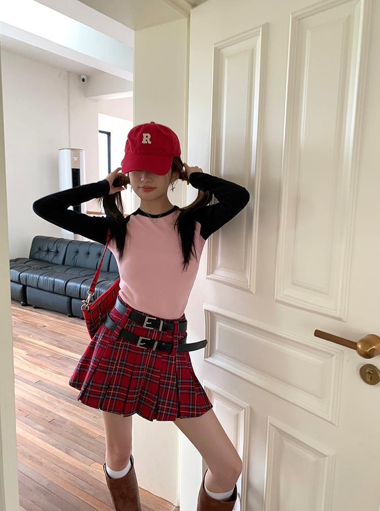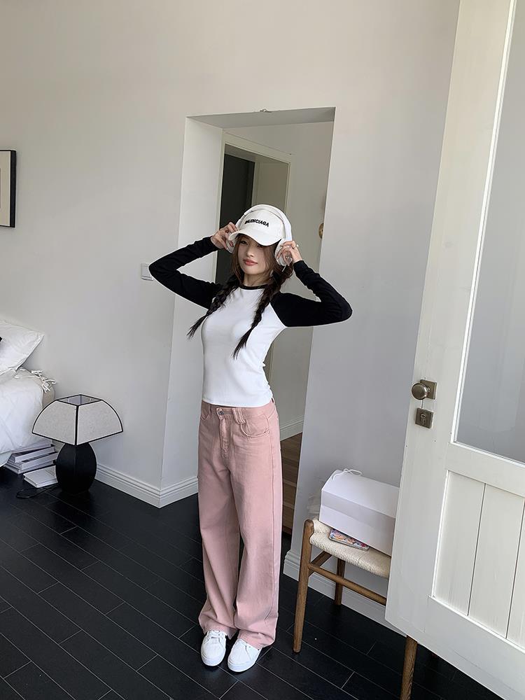 JMA-339 实拍 初秋韩系圆领拼色休闲插肩袖长袖T恤甜辣风休闲撞色百搭上衣