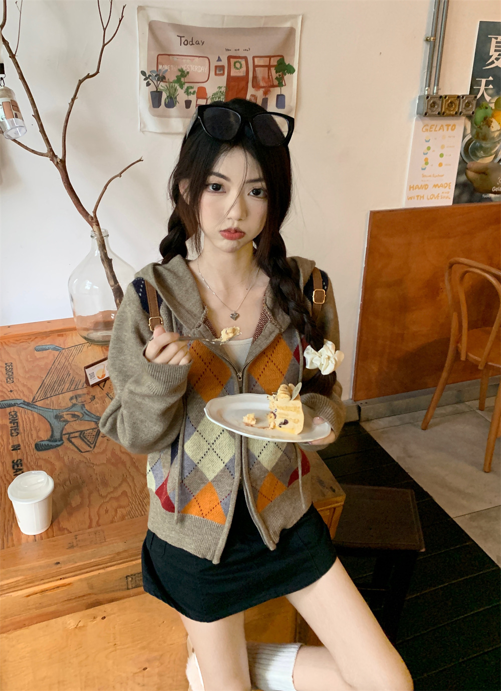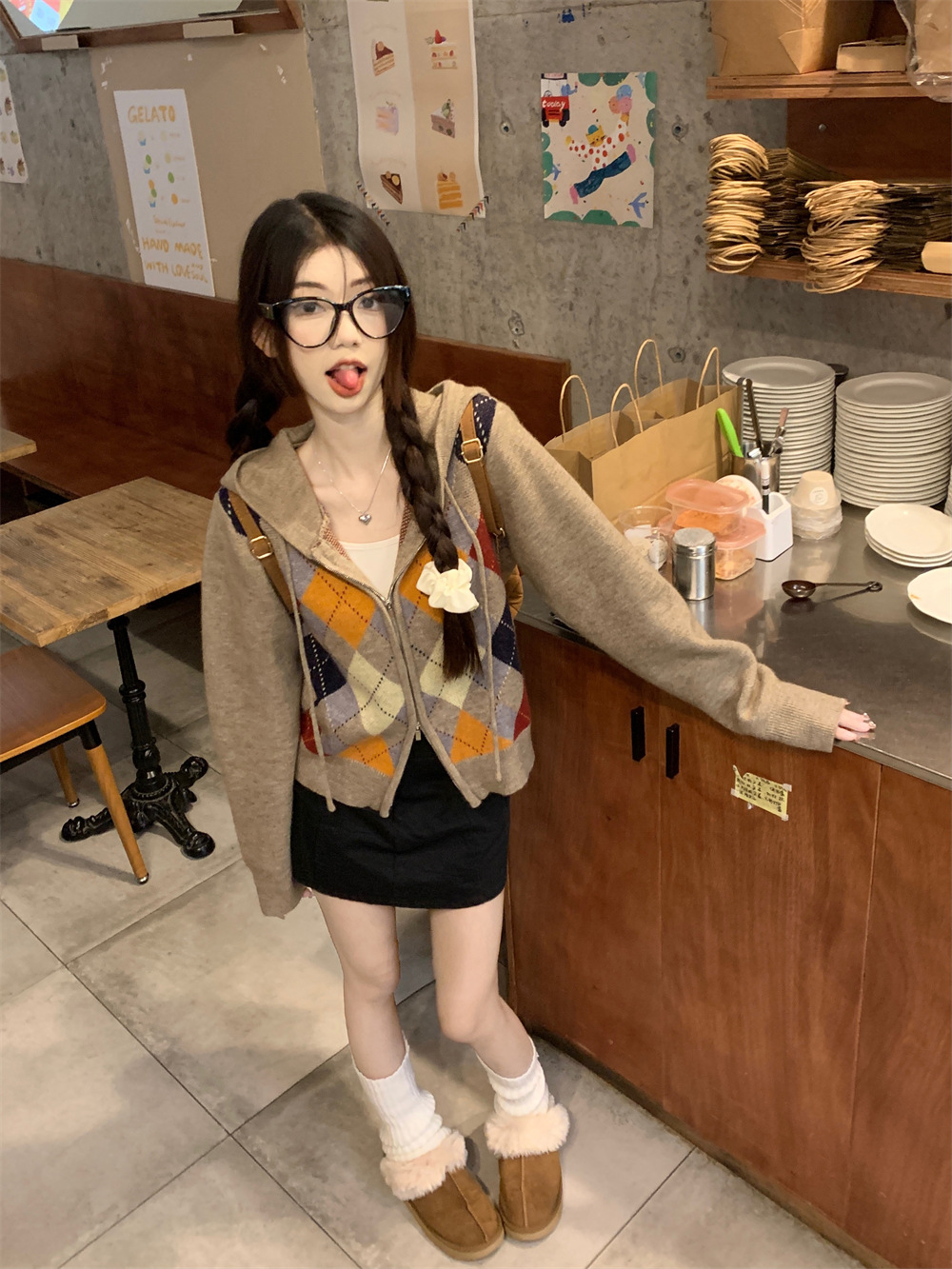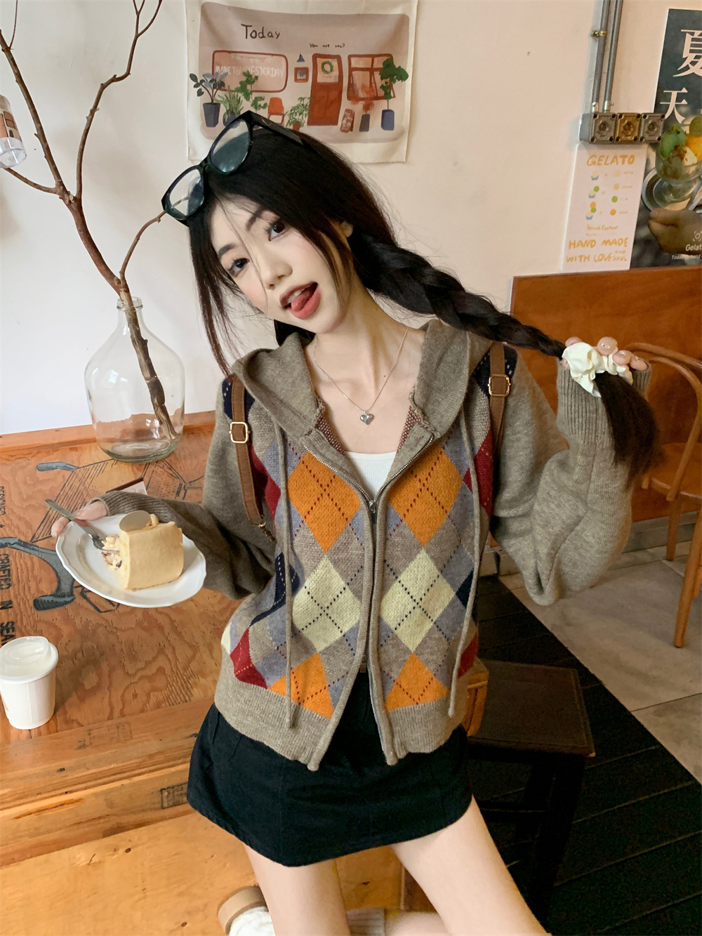 JMA-340 秋冬美式复古拼色菱形连帽双头拉链宽松显瘦百搭长袖针织毛衣外套