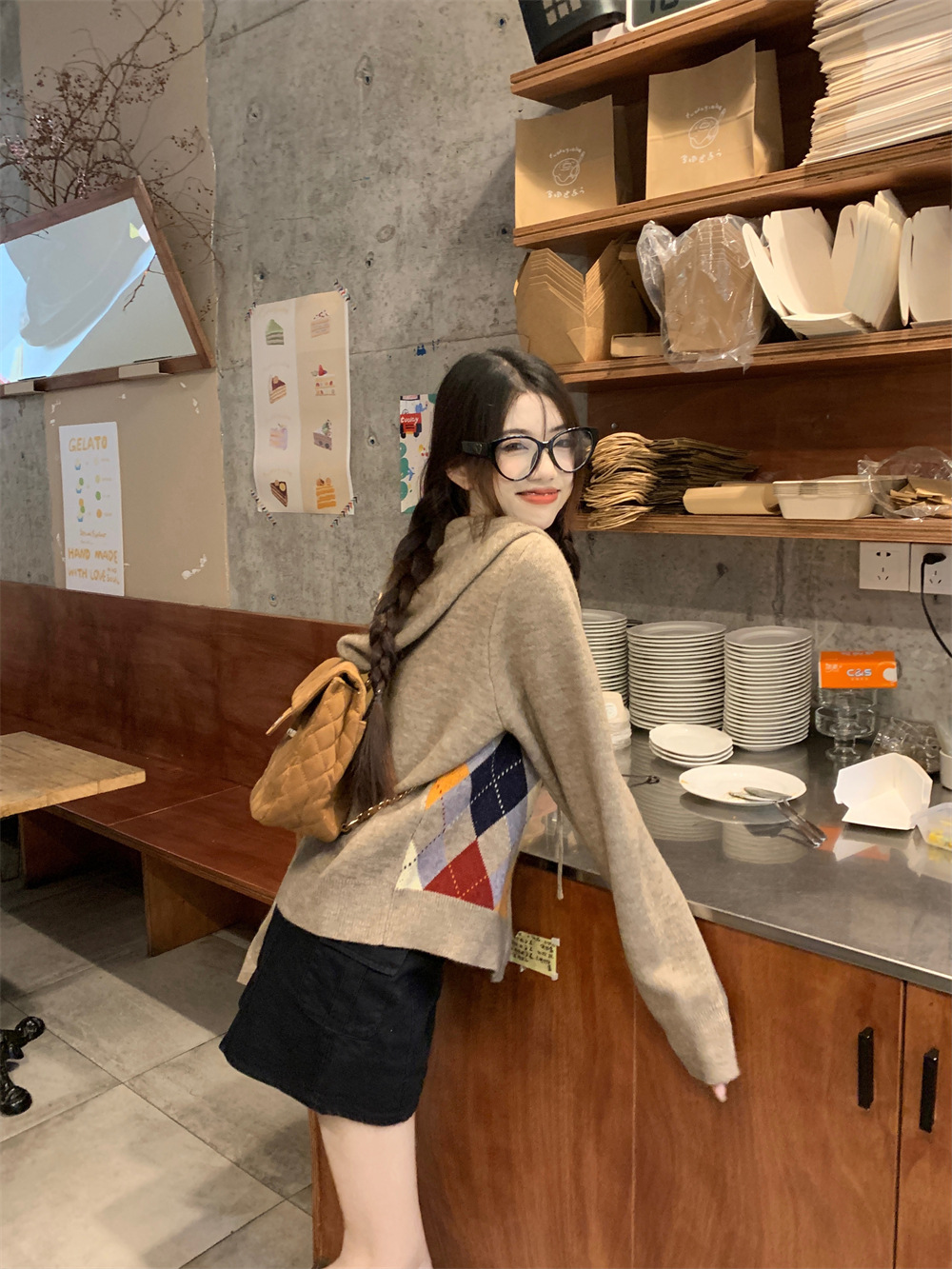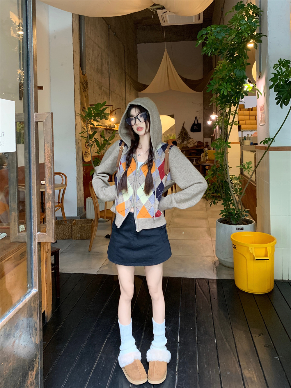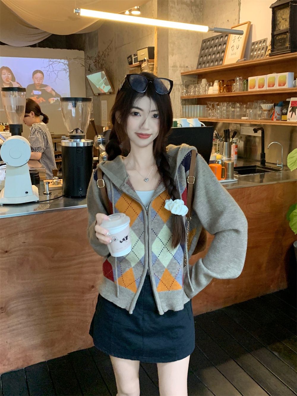 JMA-340 秋冬美式复古拼色菱形连帽双头拉链宽松显瘦百搭长袖针织毛衣外套
