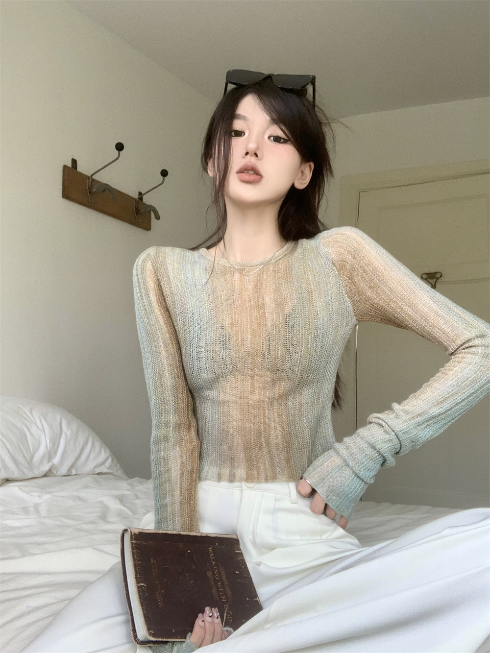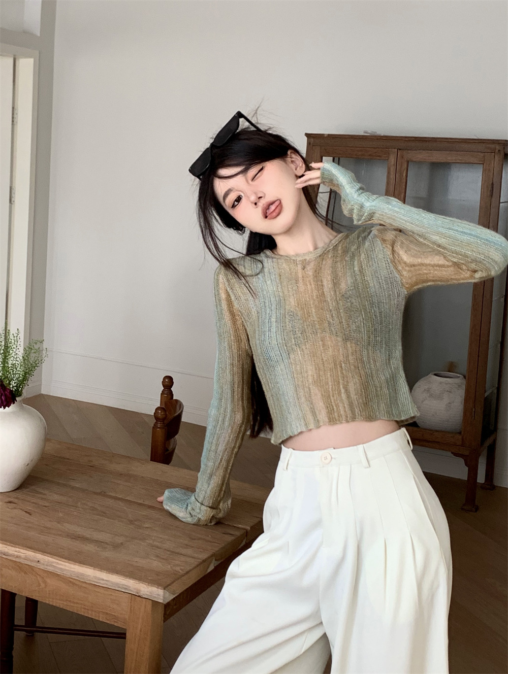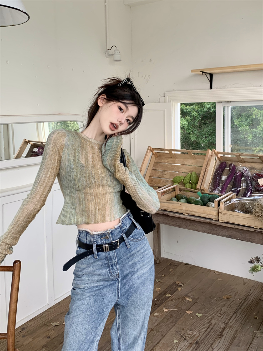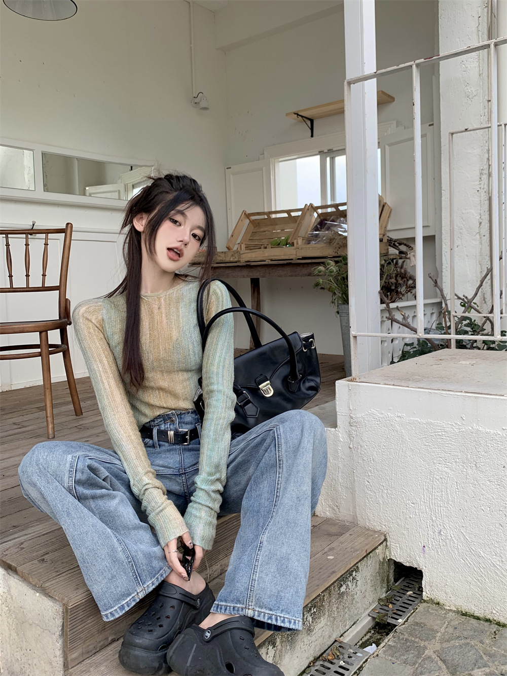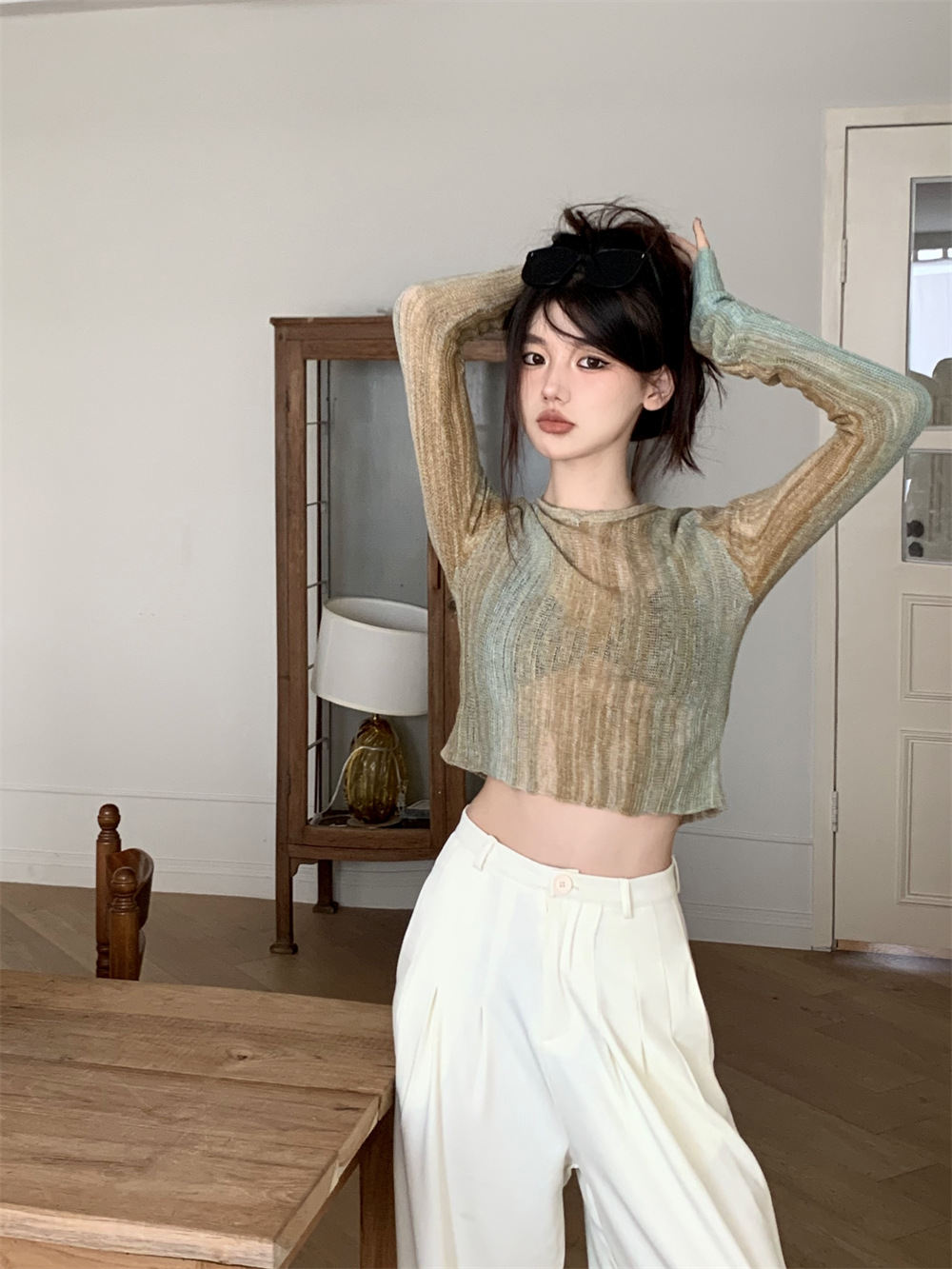 JMA-342 初秋季韩版设计感小众圆领渐变短款甜辣风修身显瘦百搭长袖针织衫