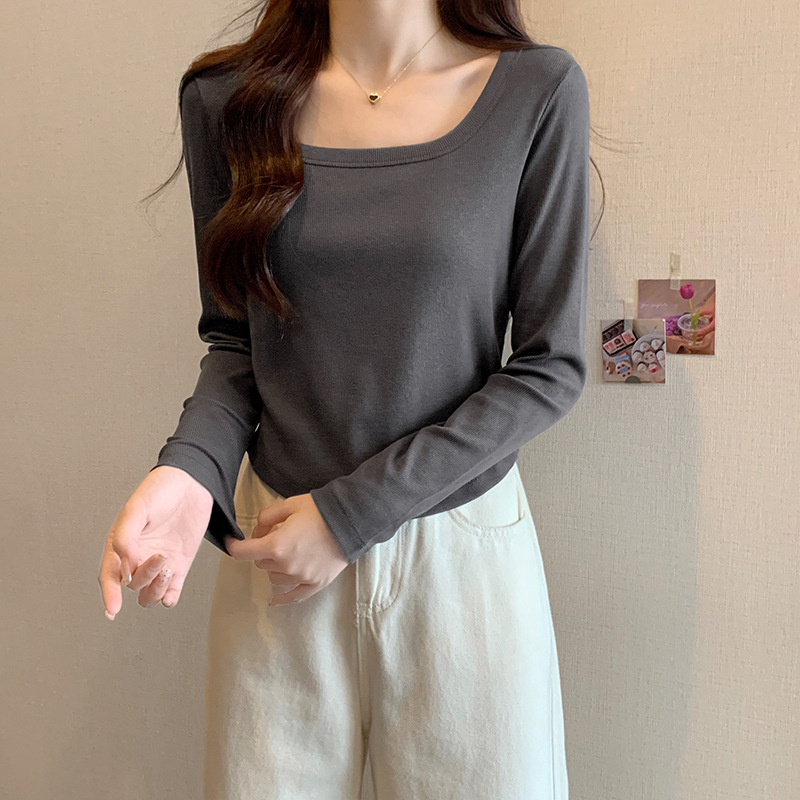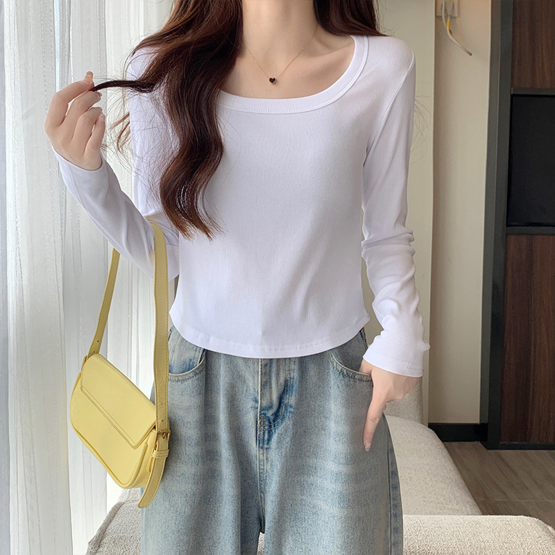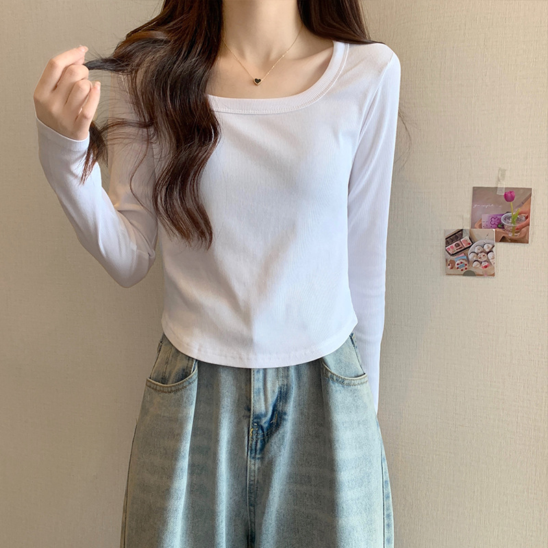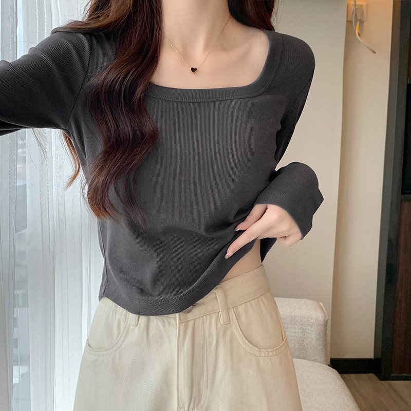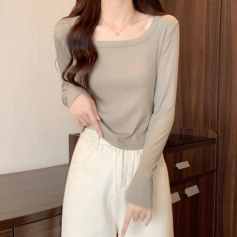 JMA-343 实拍 不规则正肩长袖t恤女2023秋季修身短款方领显瘦纯色内搭上衣