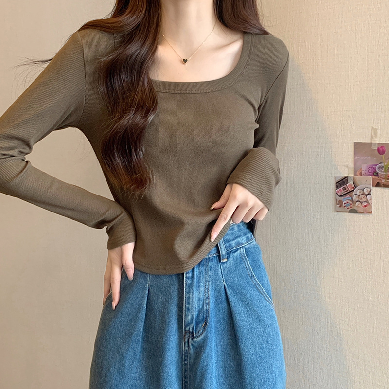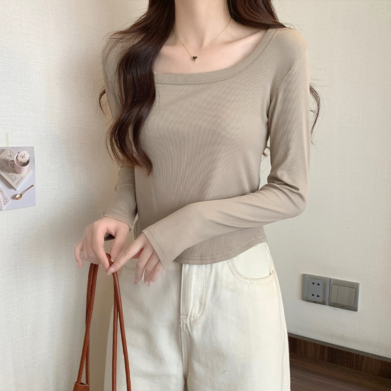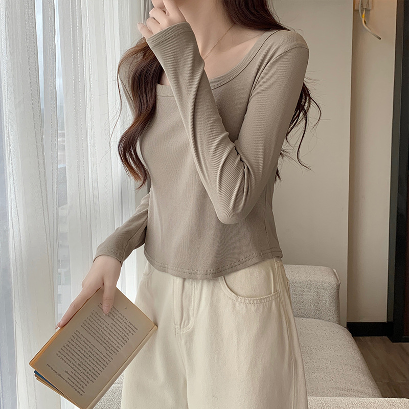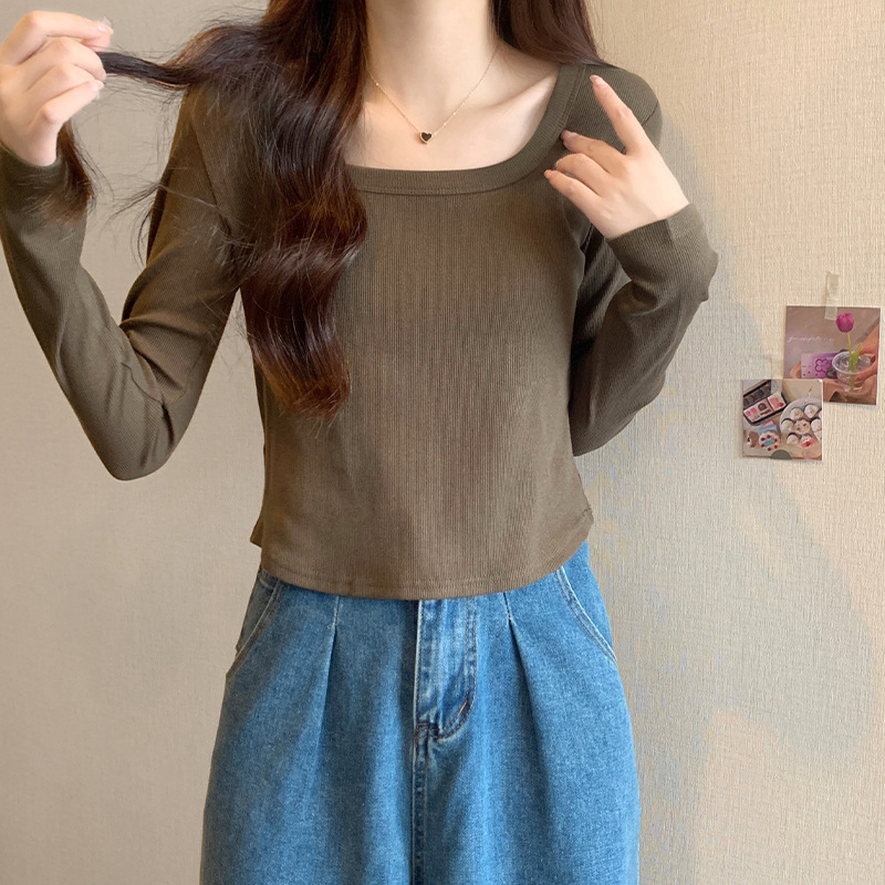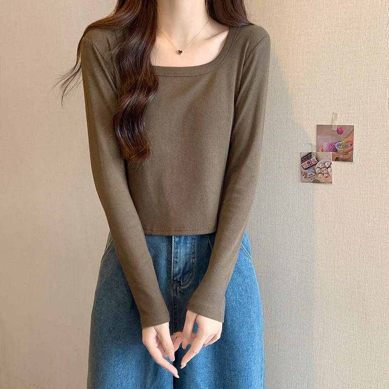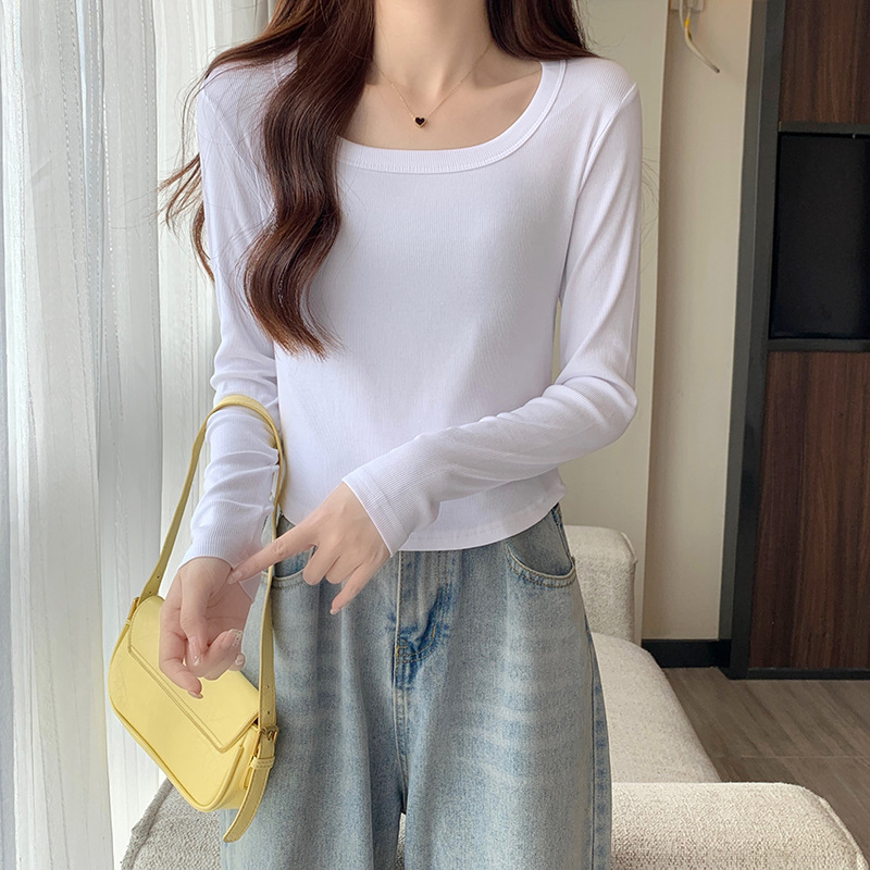 JMA-343 实拍 不规则正肩长袖t恤女2023秋季修身短款方领显瘦纯色内搭上衣