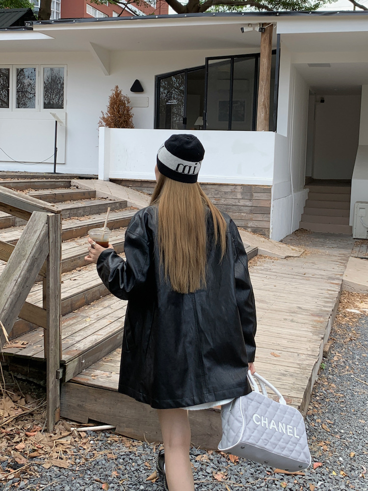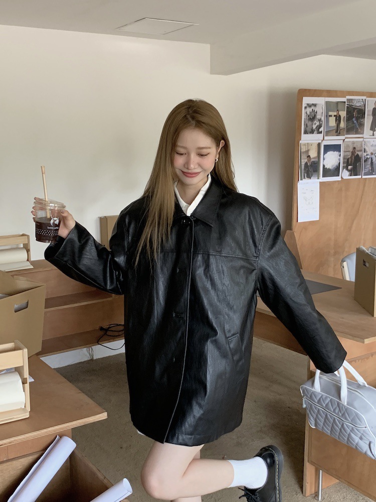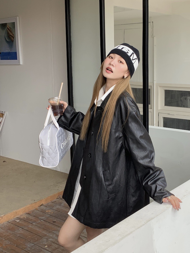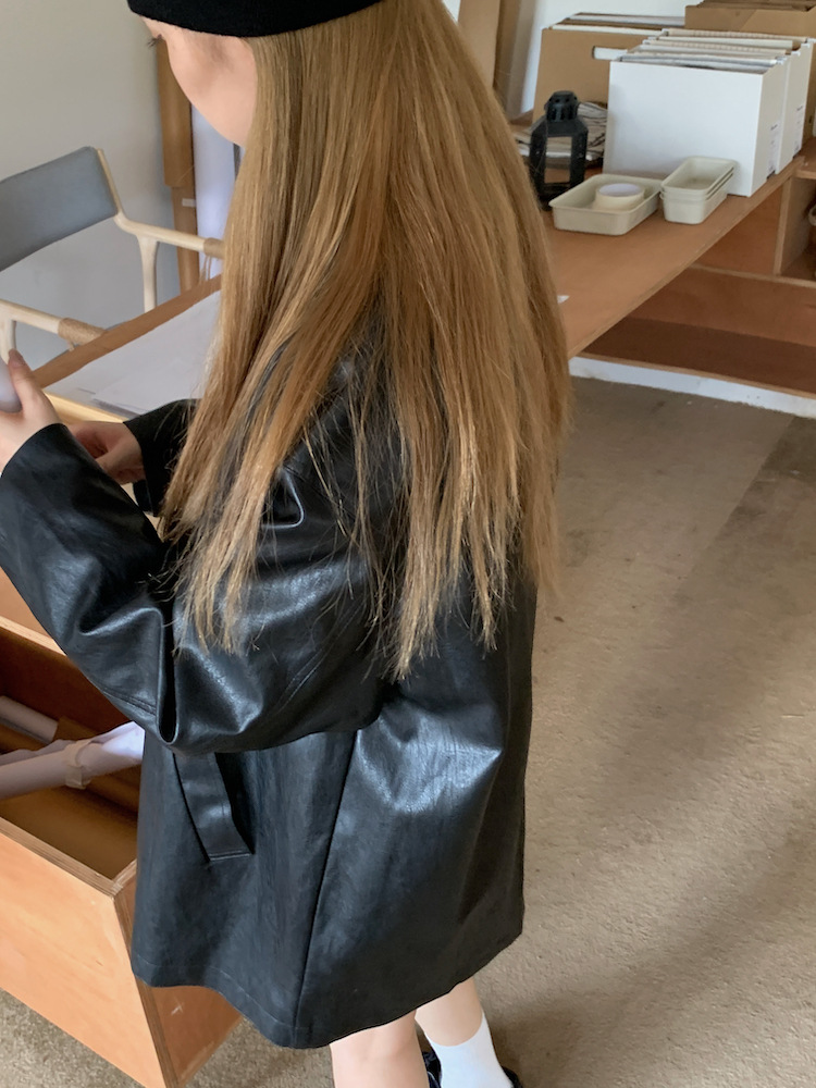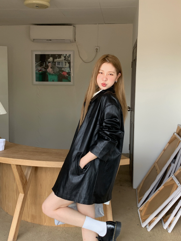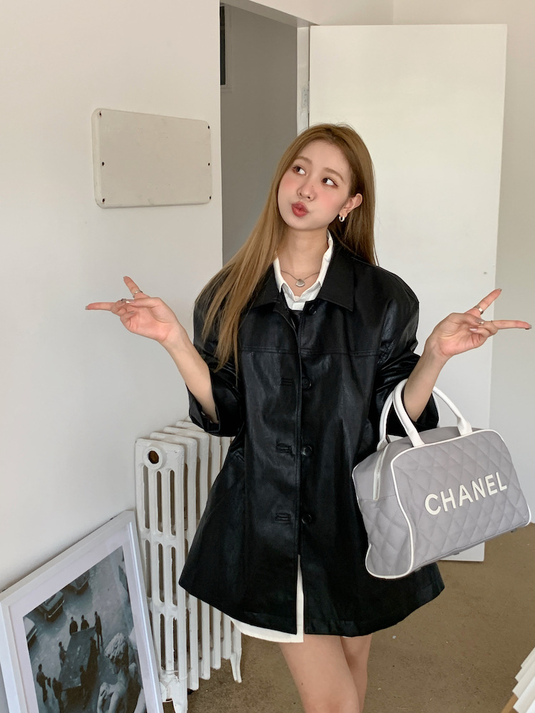 JMA-357 实拍 2023秋季新款韩系中长款pu皮外套女甜苦学姐风皮风衣上 衣潮