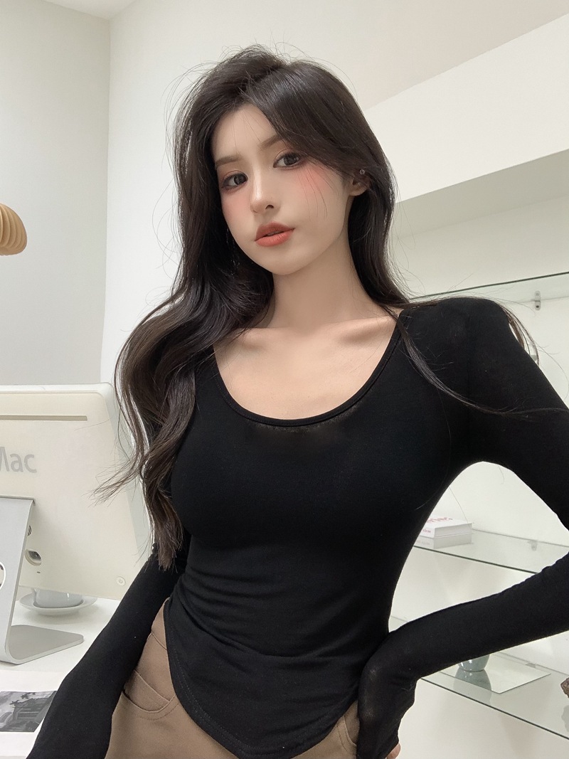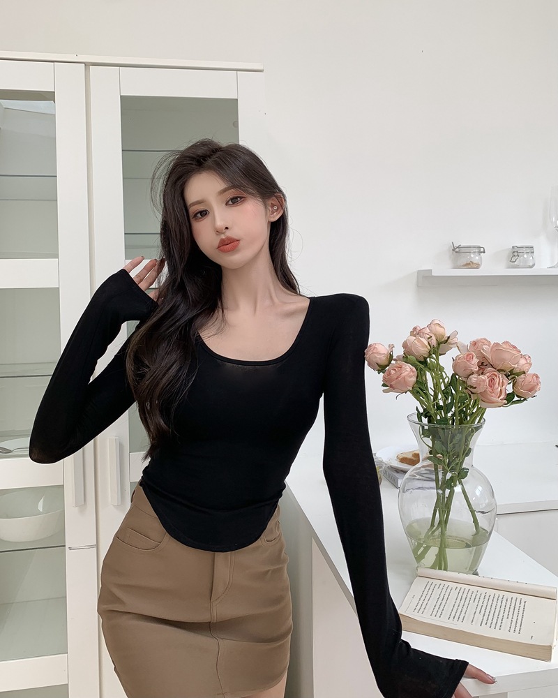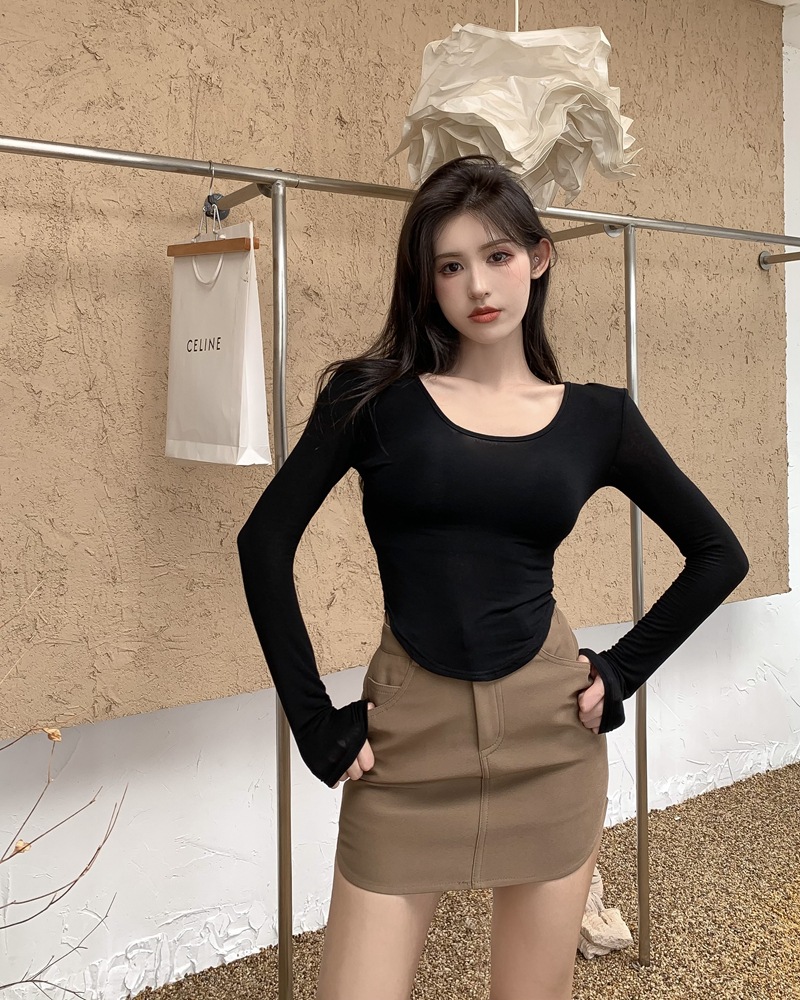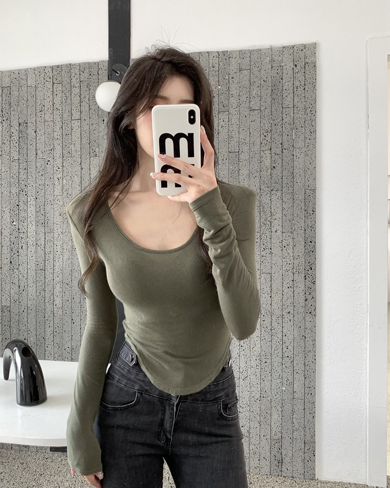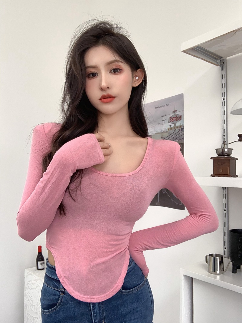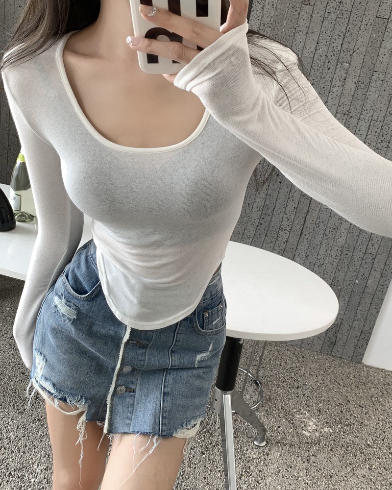 JMA-359 实拍 2023初秋辣妹风薄款U领修身显瘦长袖垫肩T恤ins短款微透上衣