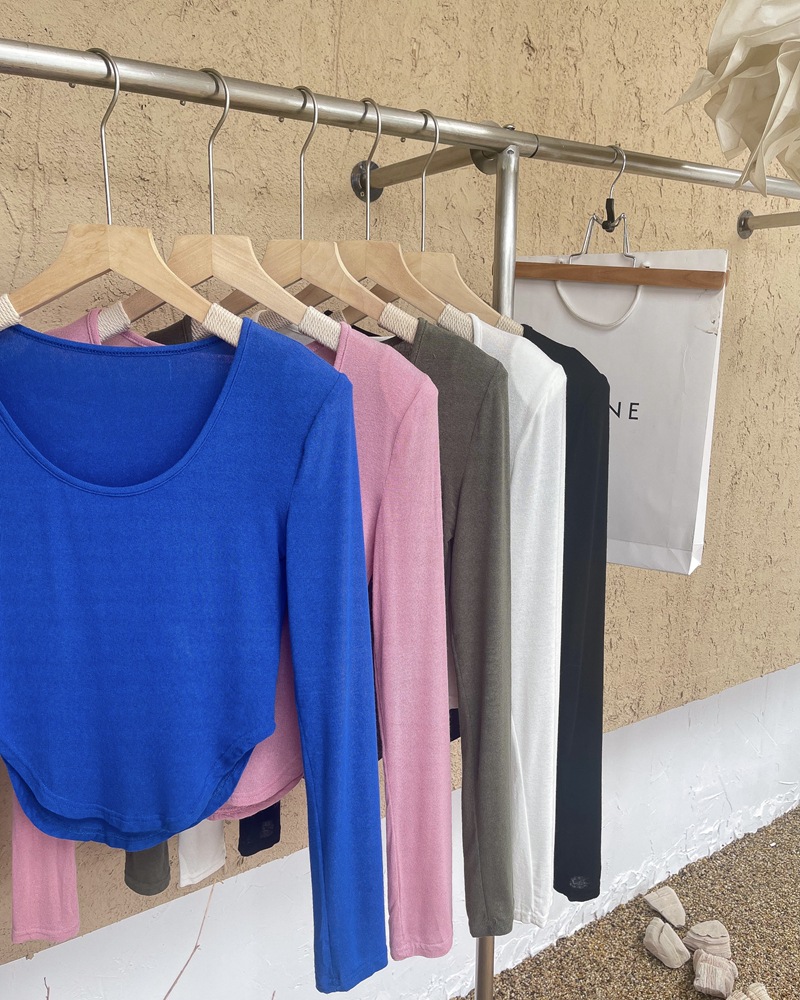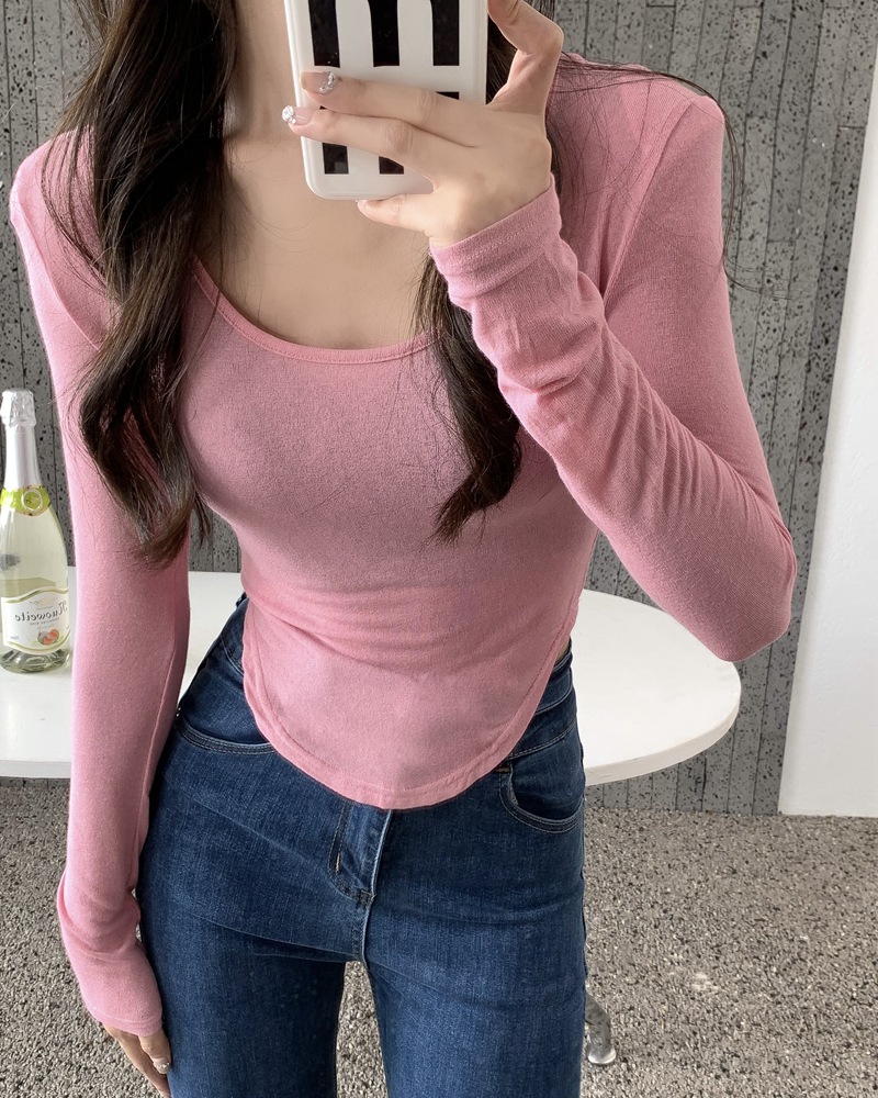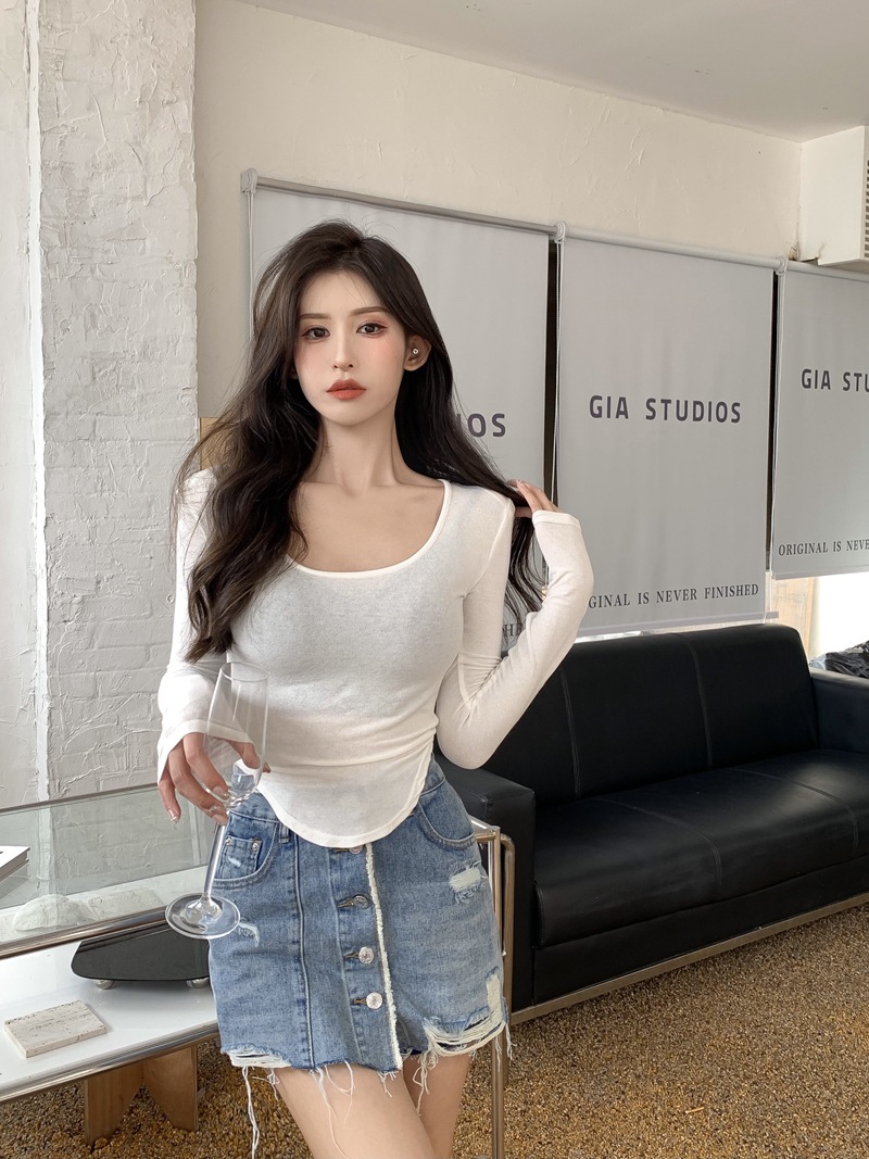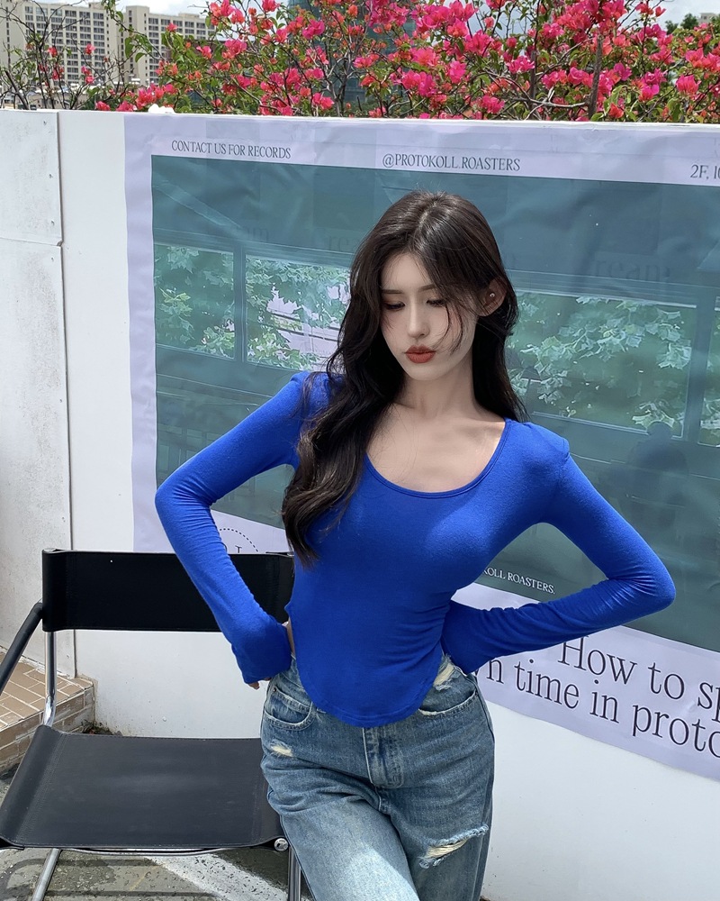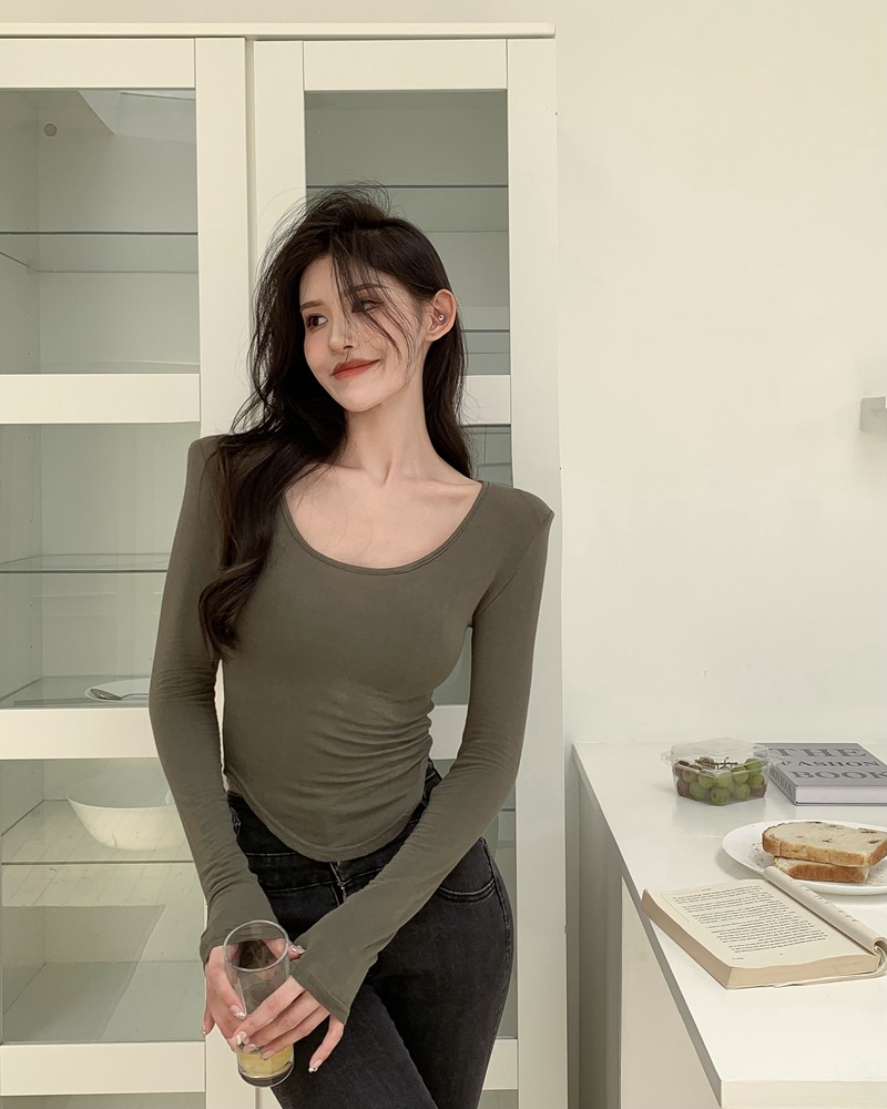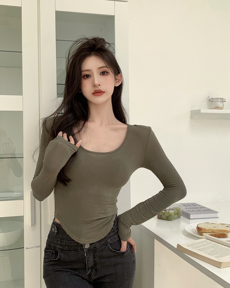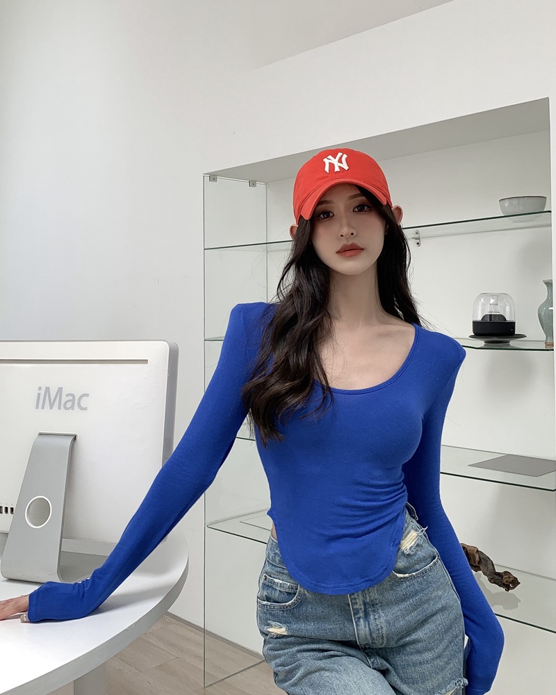 JMA-359 实拍 2023初秋辣妹风薄款U领修身显瘦长袖垫肩T恤ins短款微透上衣