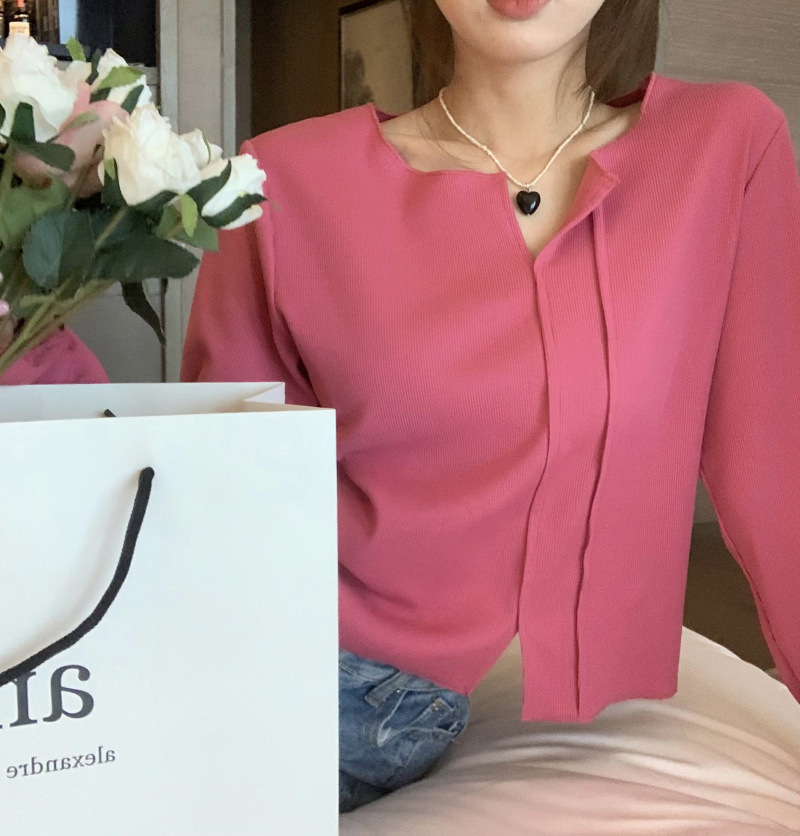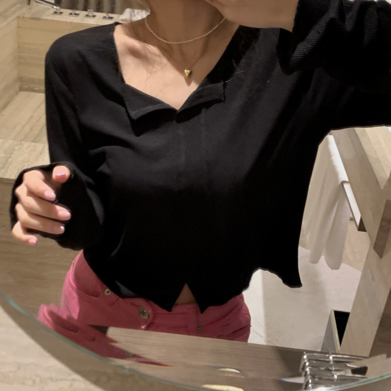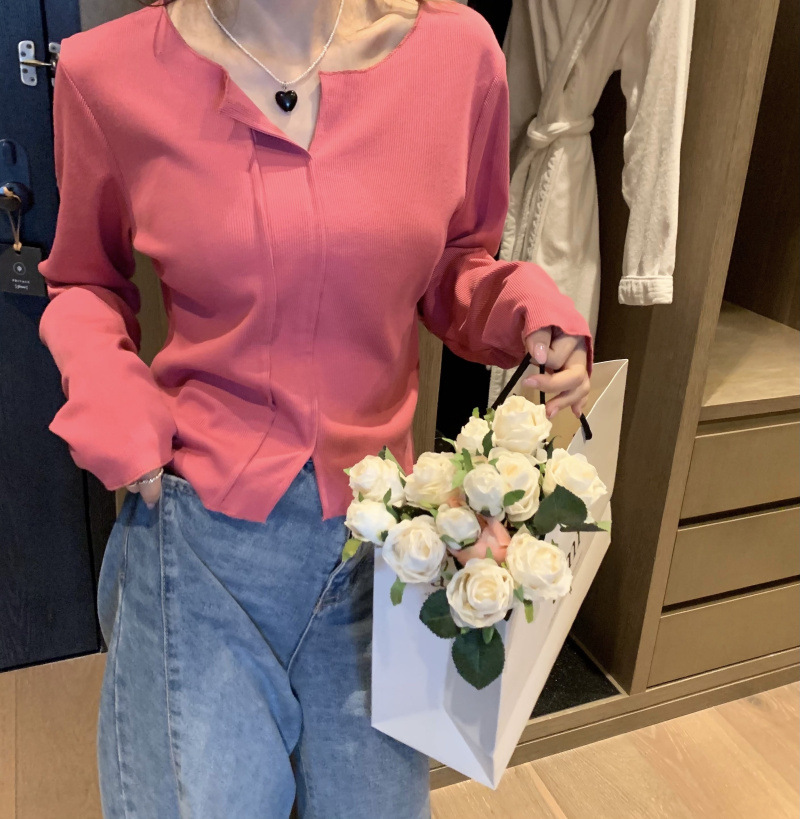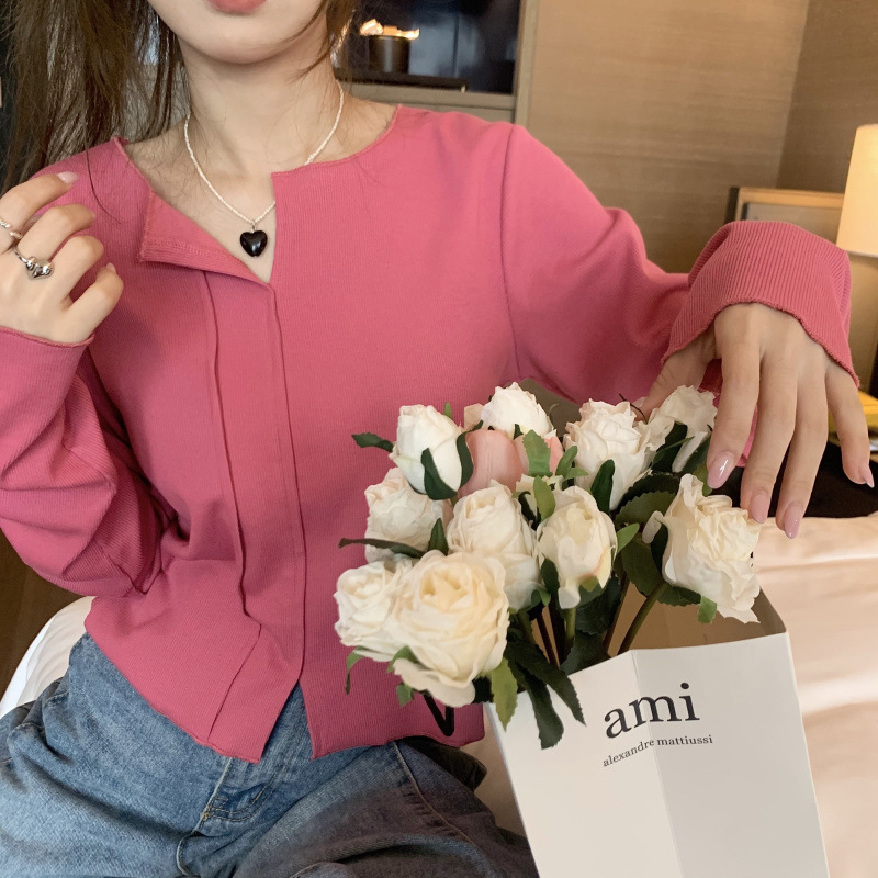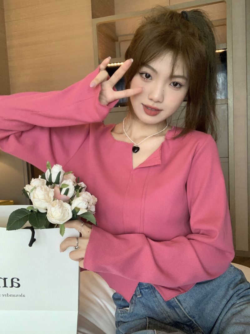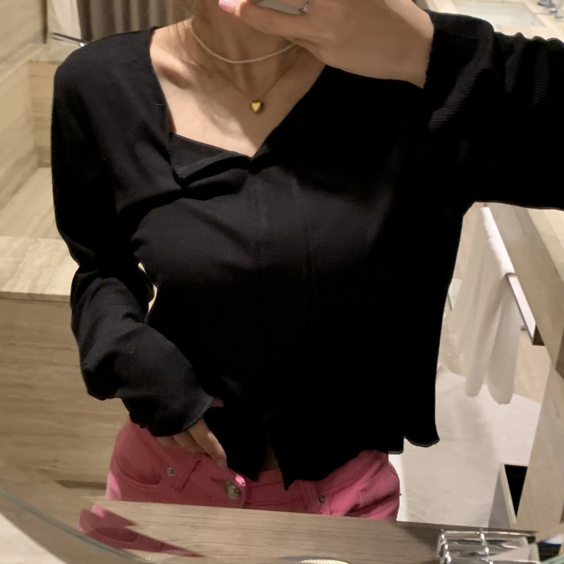 JMA-364 实拍2023秋季新款韩版小V领鱼骨长袖t恤女设计感亲肤休闲小衫上衣