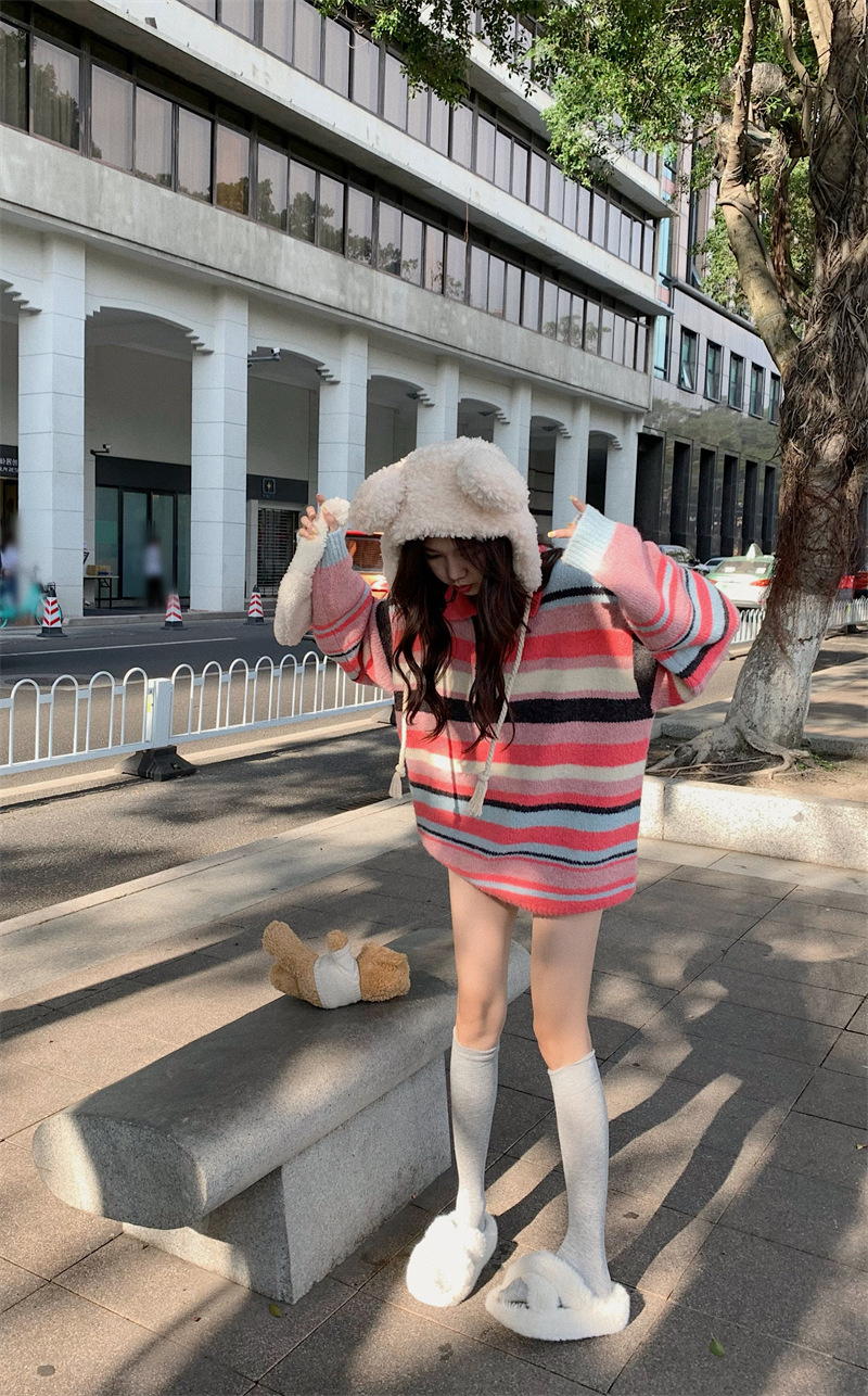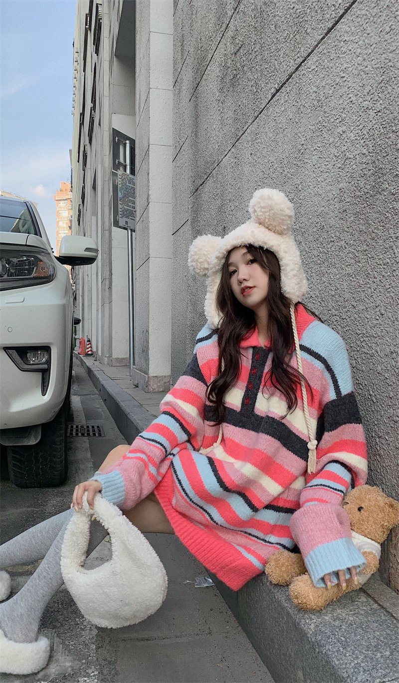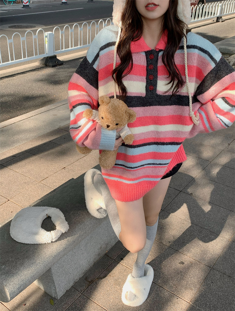 JMA-368 实拍 秋冬韩版高级感欧货宽松中长款彩虹条polo领针织衫毛衣上衣