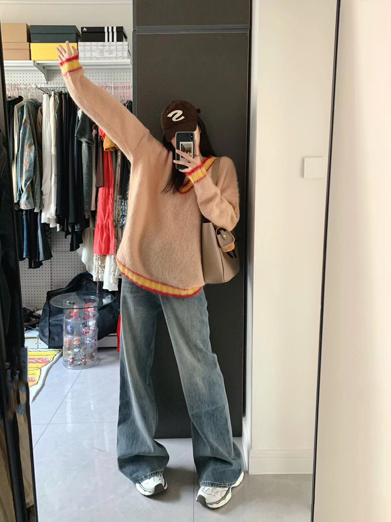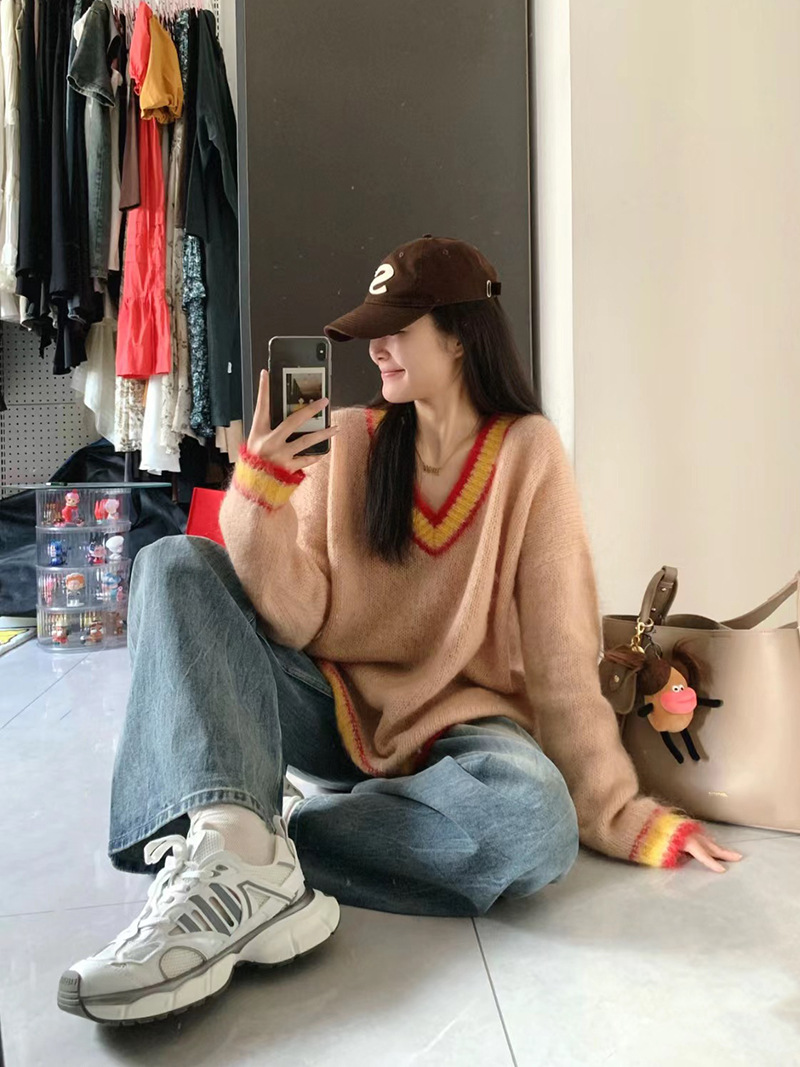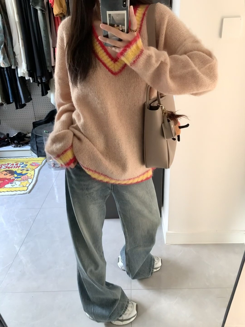 JMA-369 实拍 2023秋冬新款韩版针织软糯毛衣女学院风V领撞色宽松针织上衣