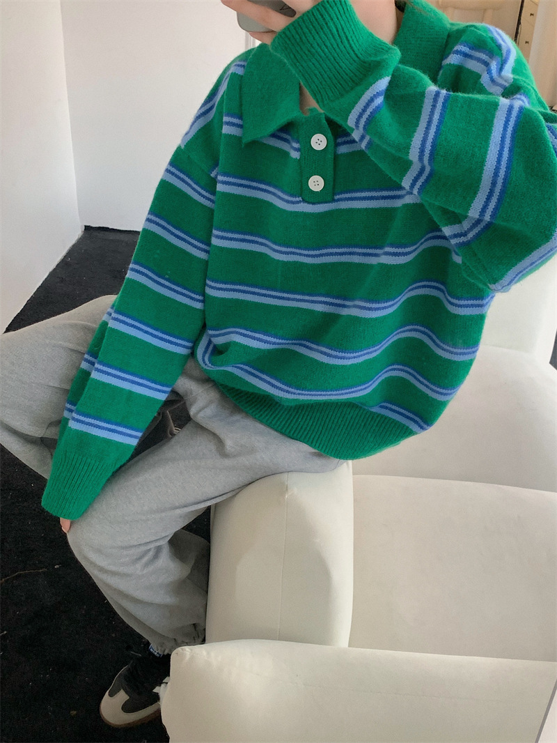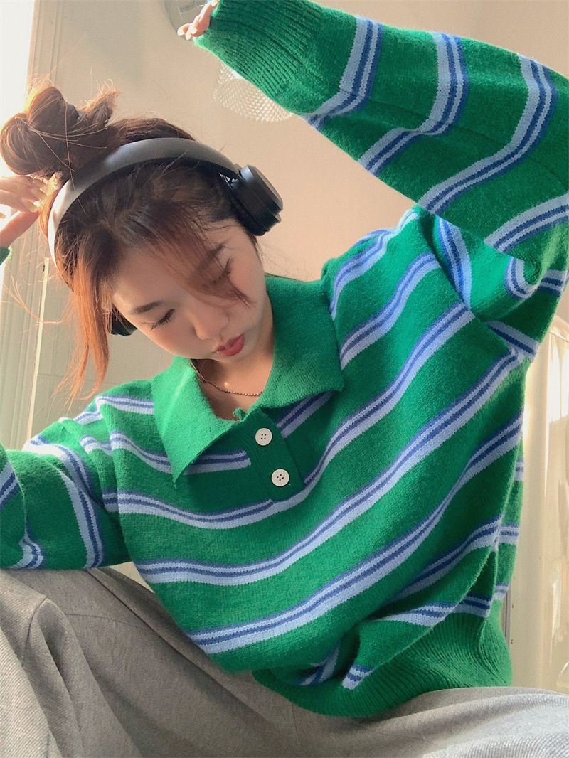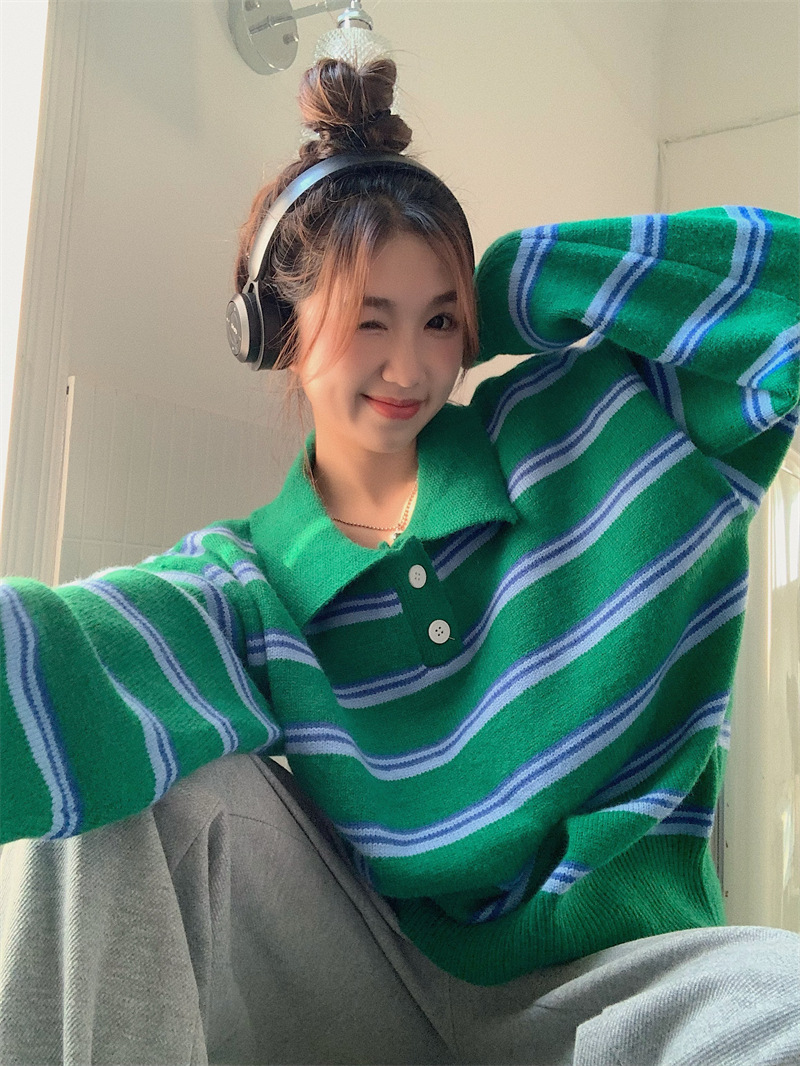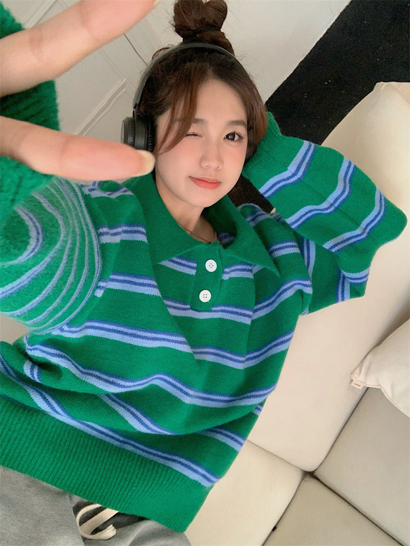 JMA-378 实拍秋冬韩版复古条纹Polo领毛衣宽松韩版oversize绿色针织衫上衣