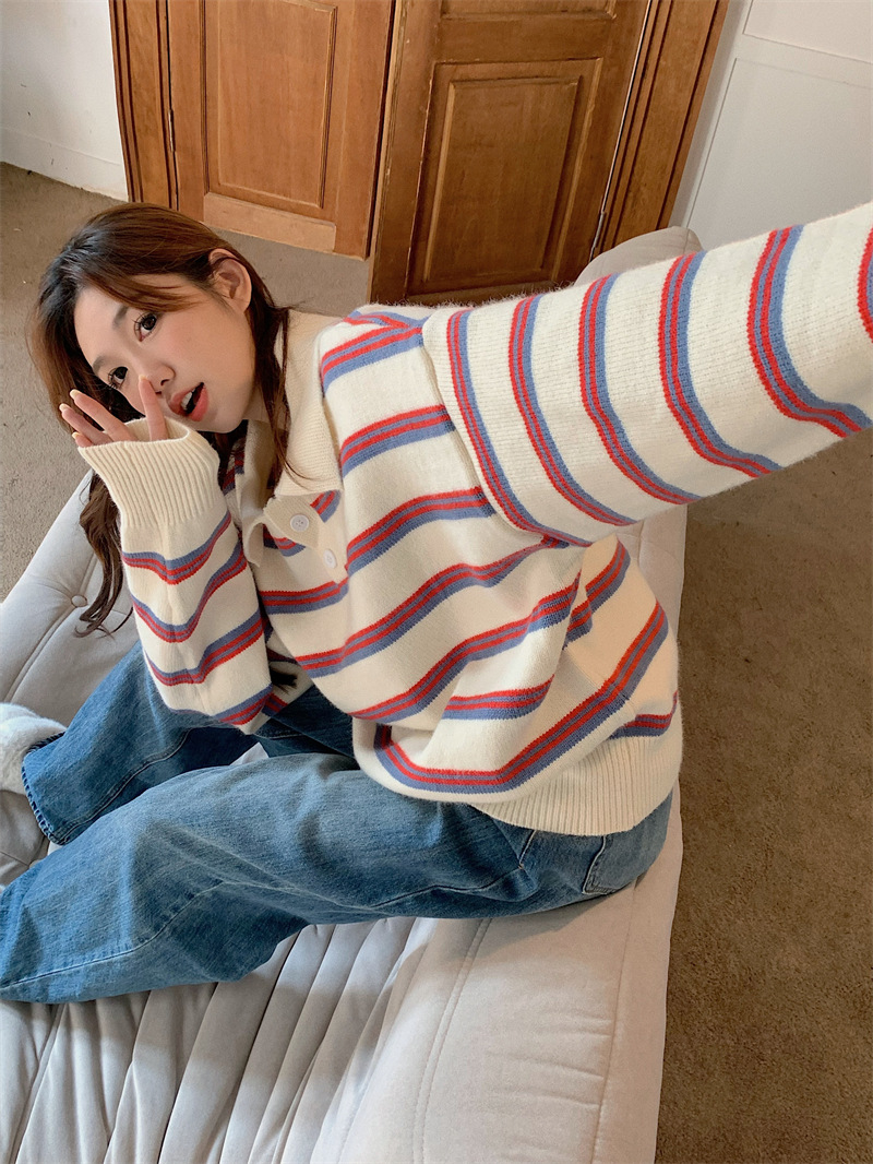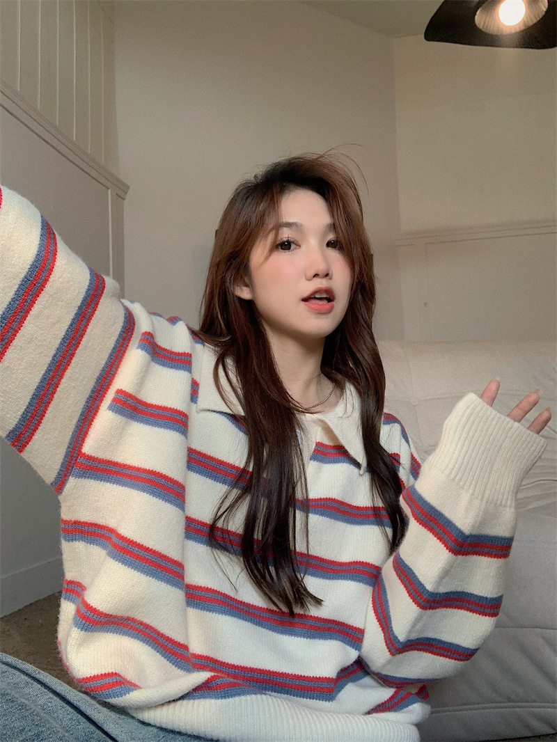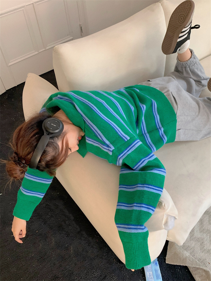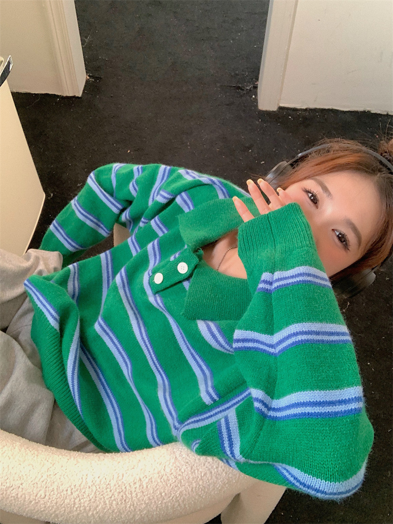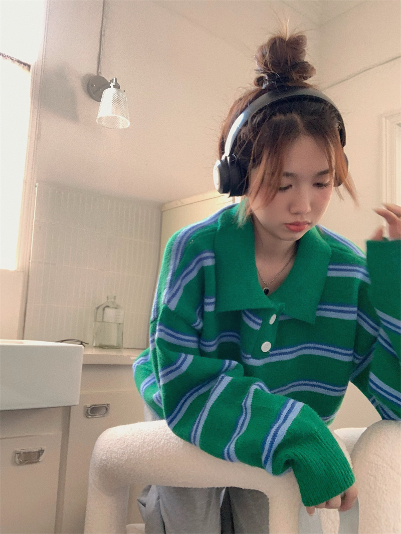 JMA-378 实拍秋冬韩版复古条纹Polo领毛衣宽松韩版oversize绿色针织衫上衣