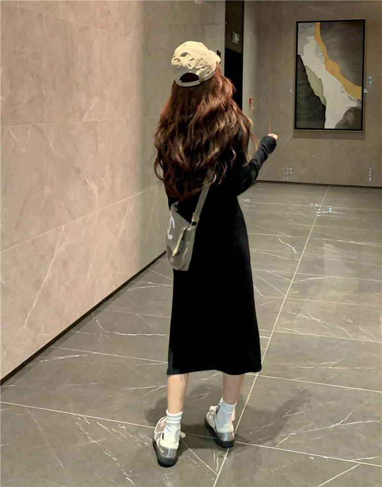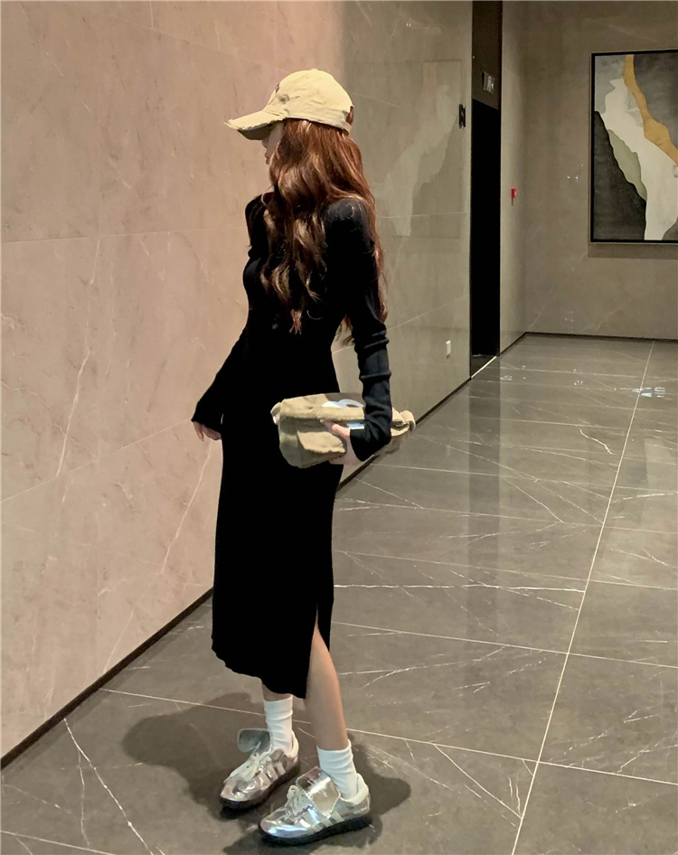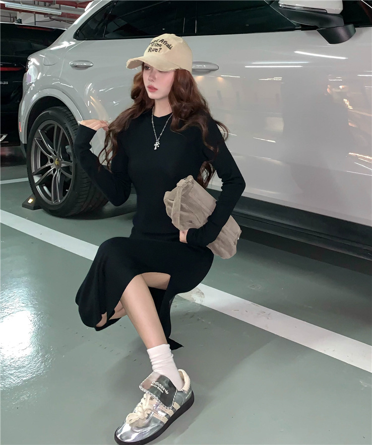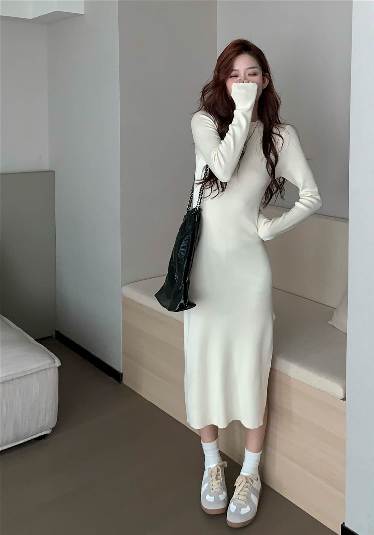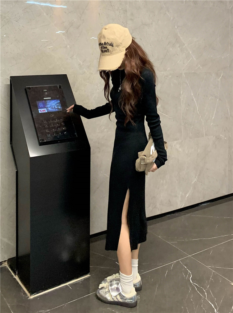 JMA-386 实拍 2023秋季新款韩版修身打底连衣裙半高领包臀开衩针织裙长裙