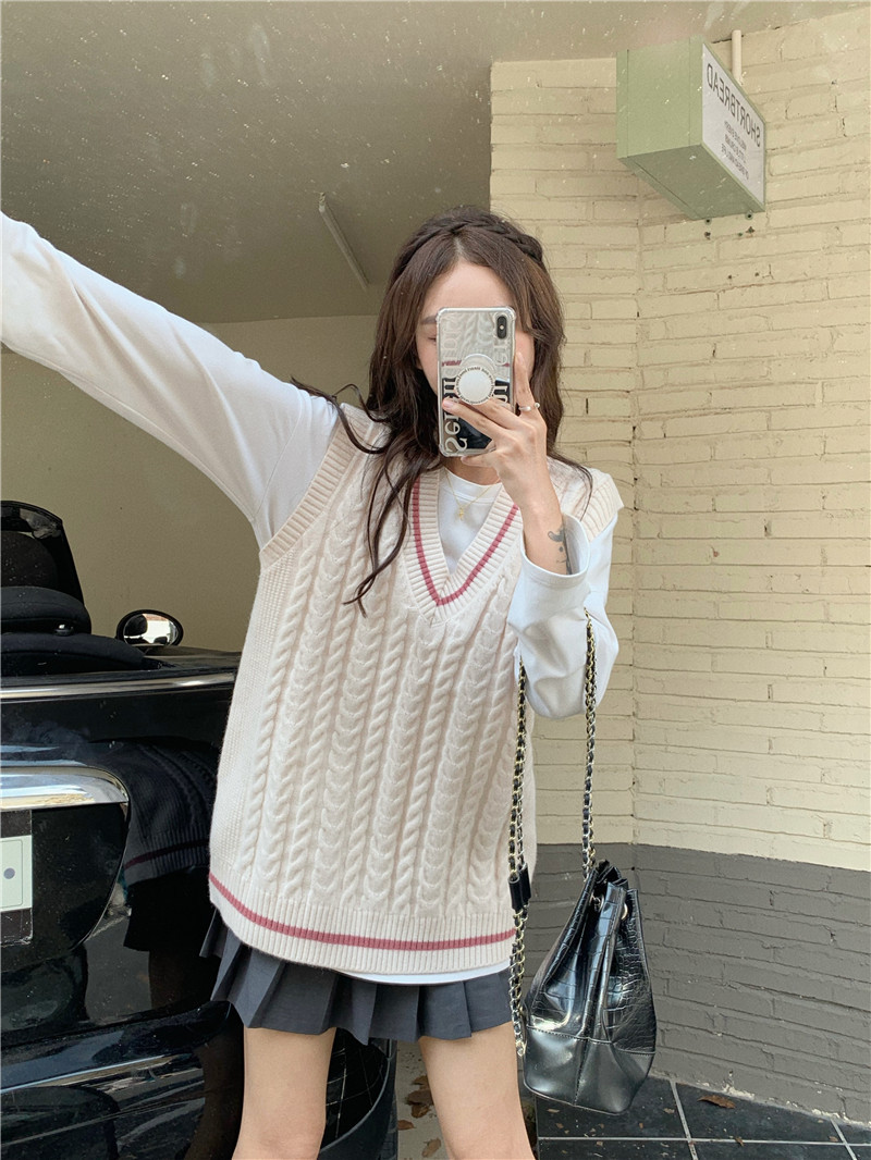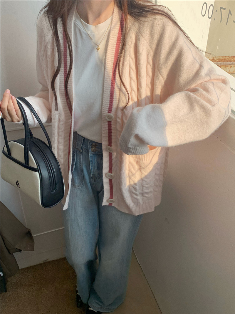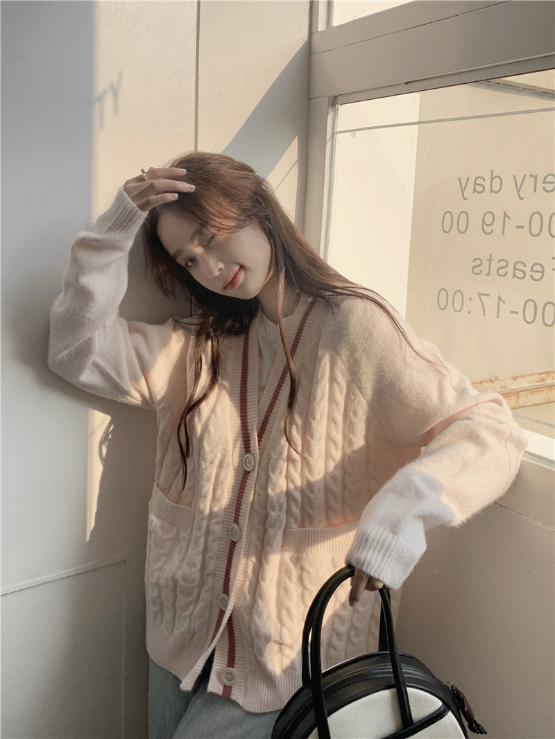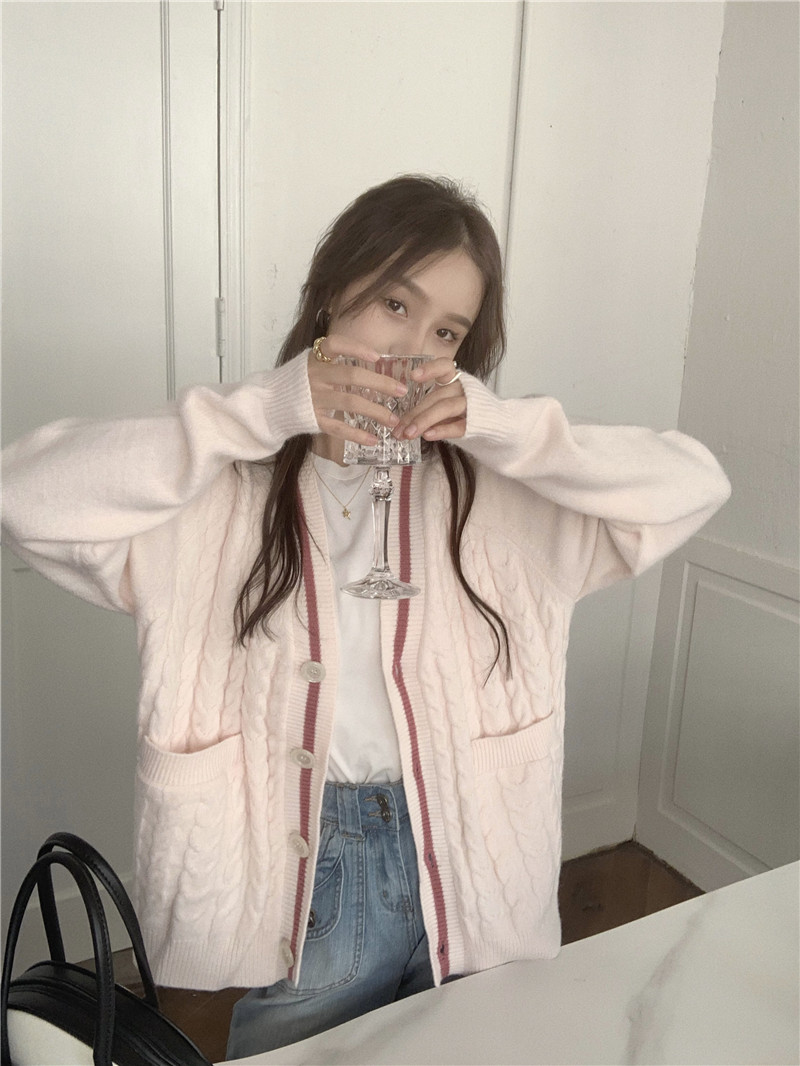 JMA-401 实拍 2023秋冬韩版甜妹风淡粉色V领麻花针织开衫女毛衣外套上衣女