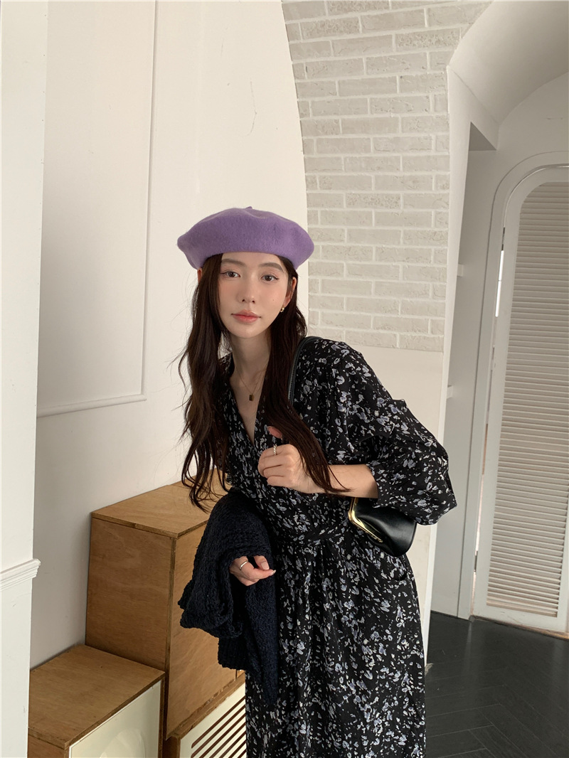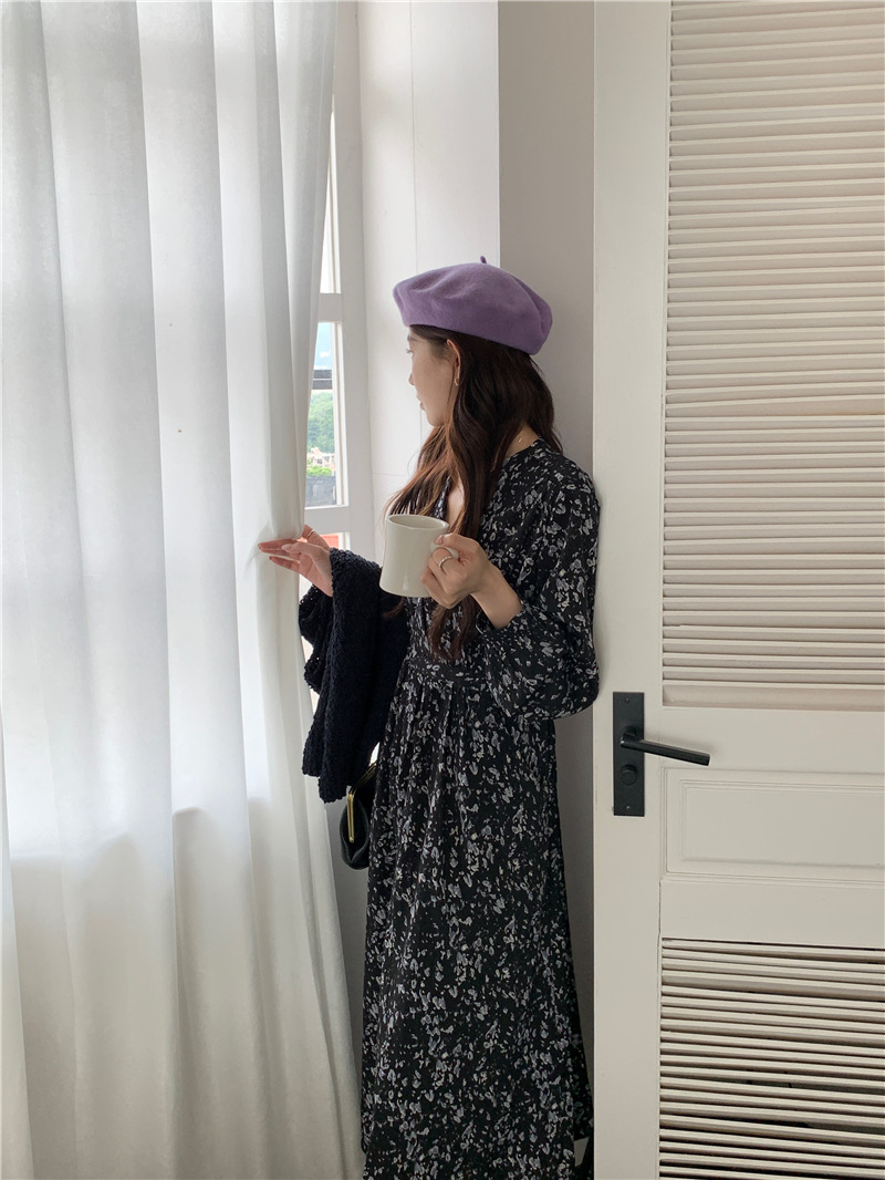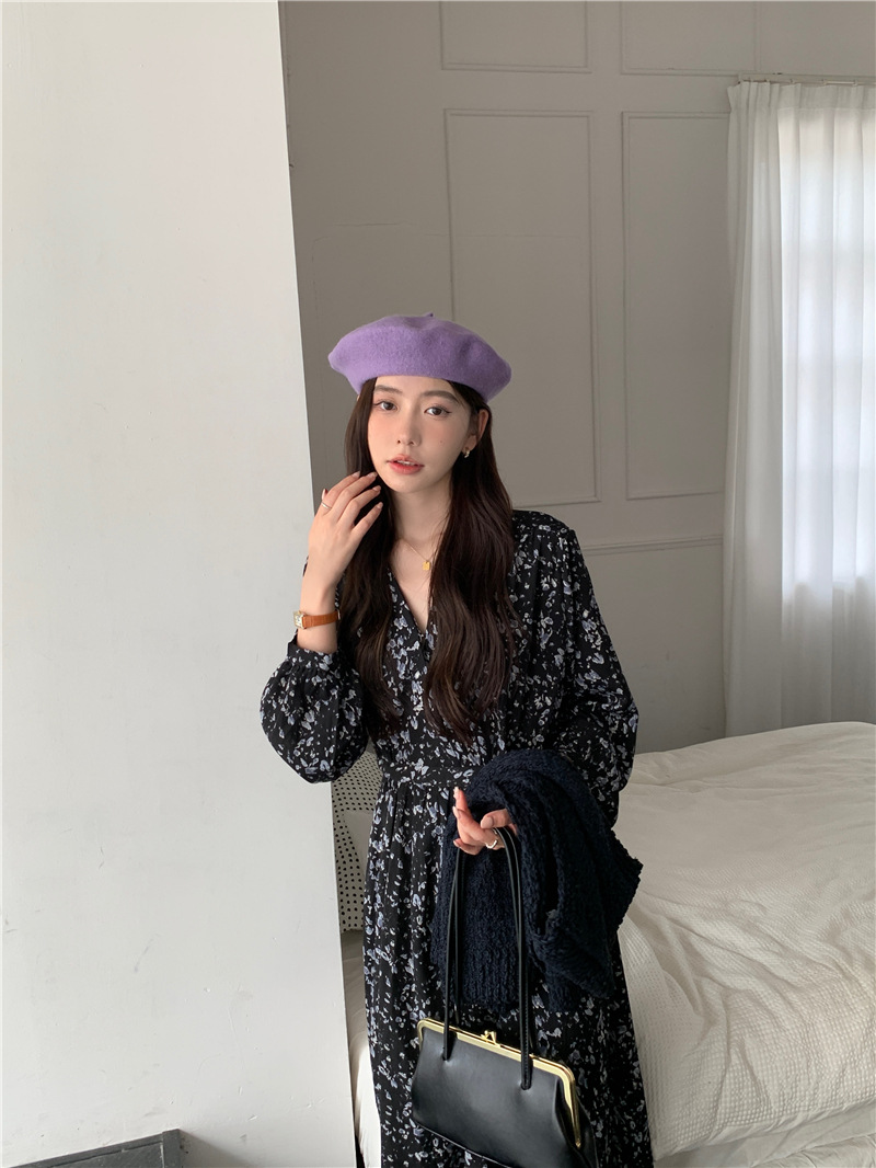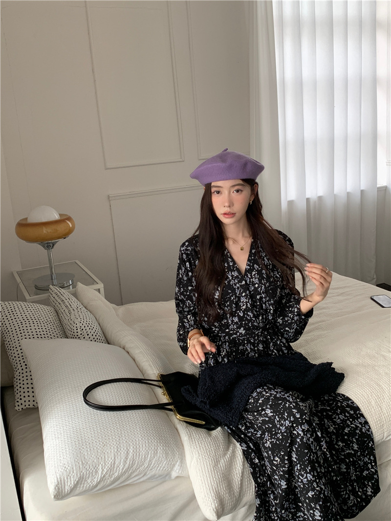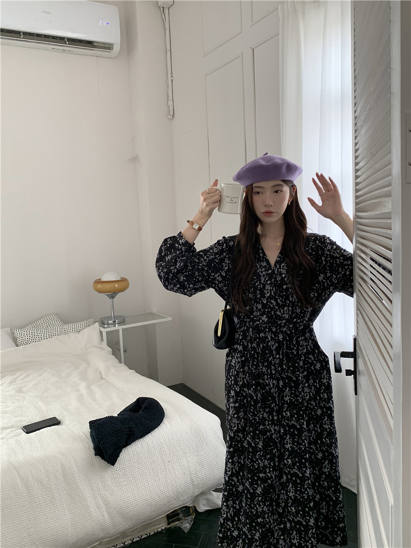 JMA-408 实拍 2023秋季新款韩系百搭黑色小碎花V领系带收腰雪纺长袖连衣裙