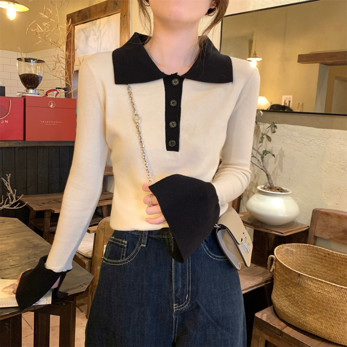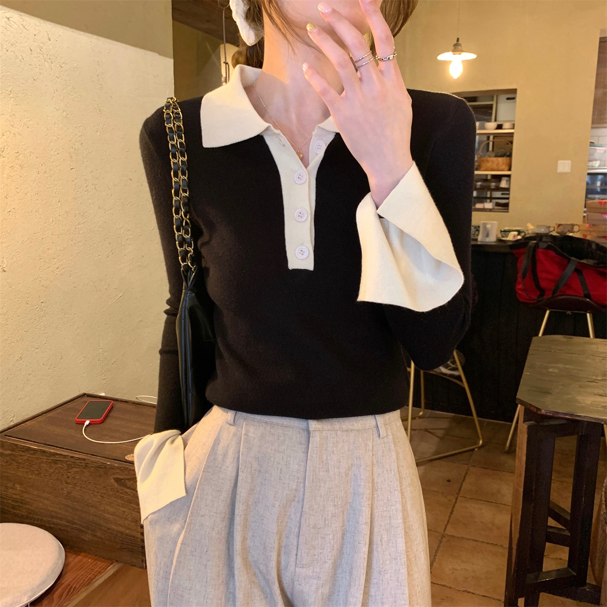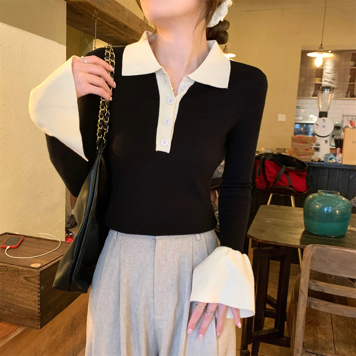 JMA-409 实拍 秋冬韩版修身撞色polo领喇叭袖内搭针织衫长袖打底衫簿毛衣