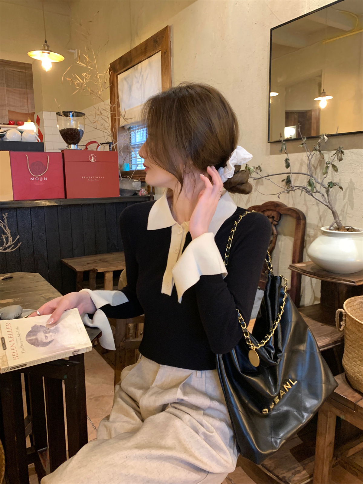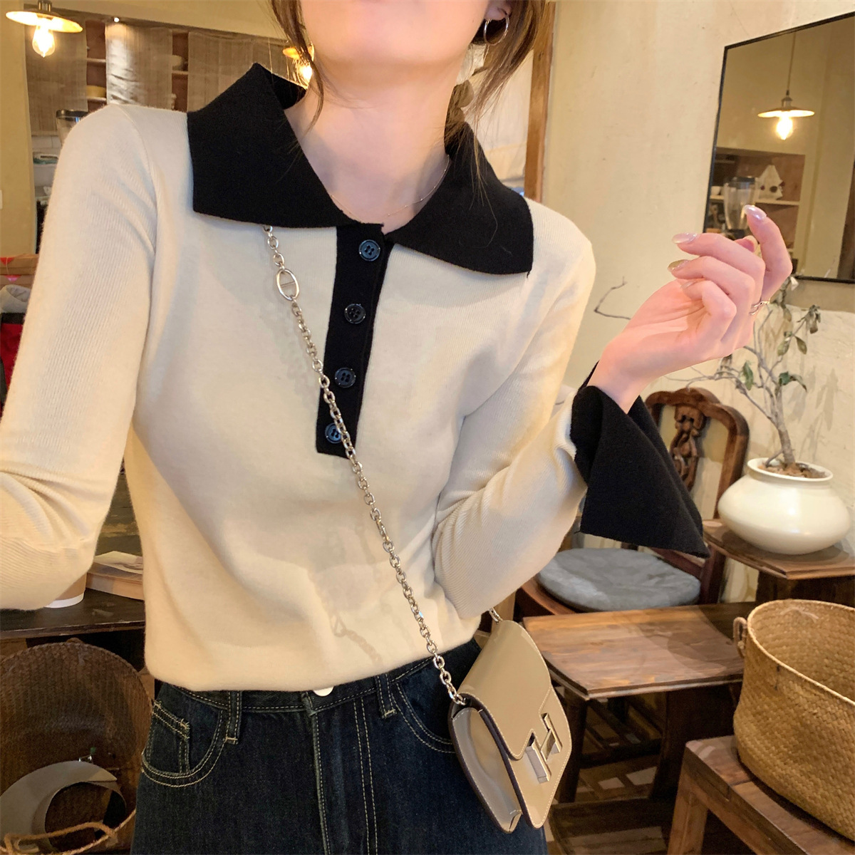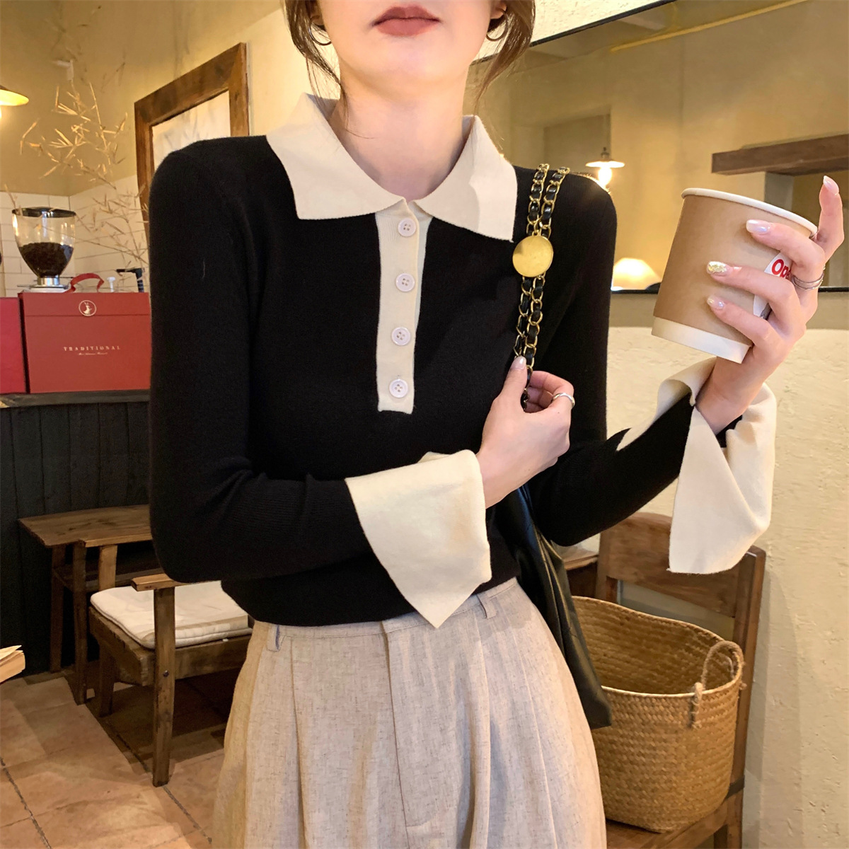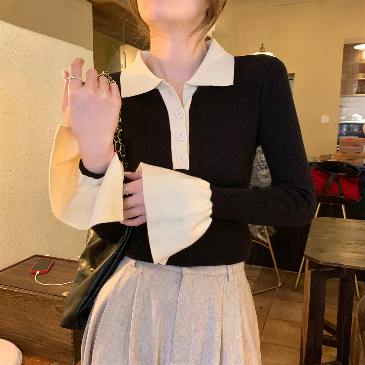 JMA-409 实拍 秋冬韩版修身撞色polo领喇叭袖内搭针织衫长袖打底衫簿毛衣
