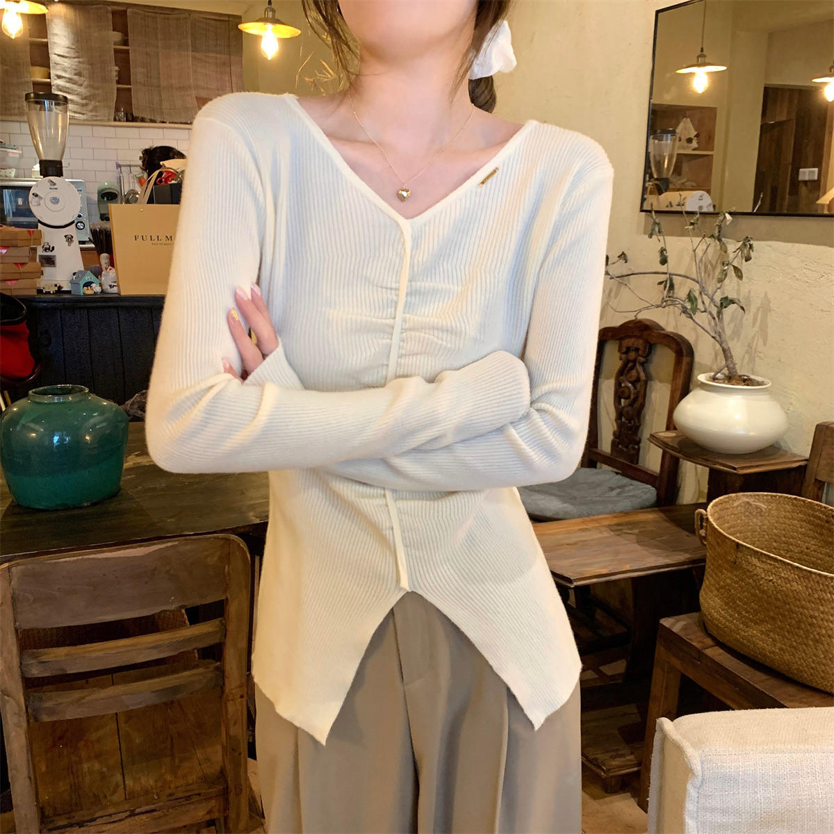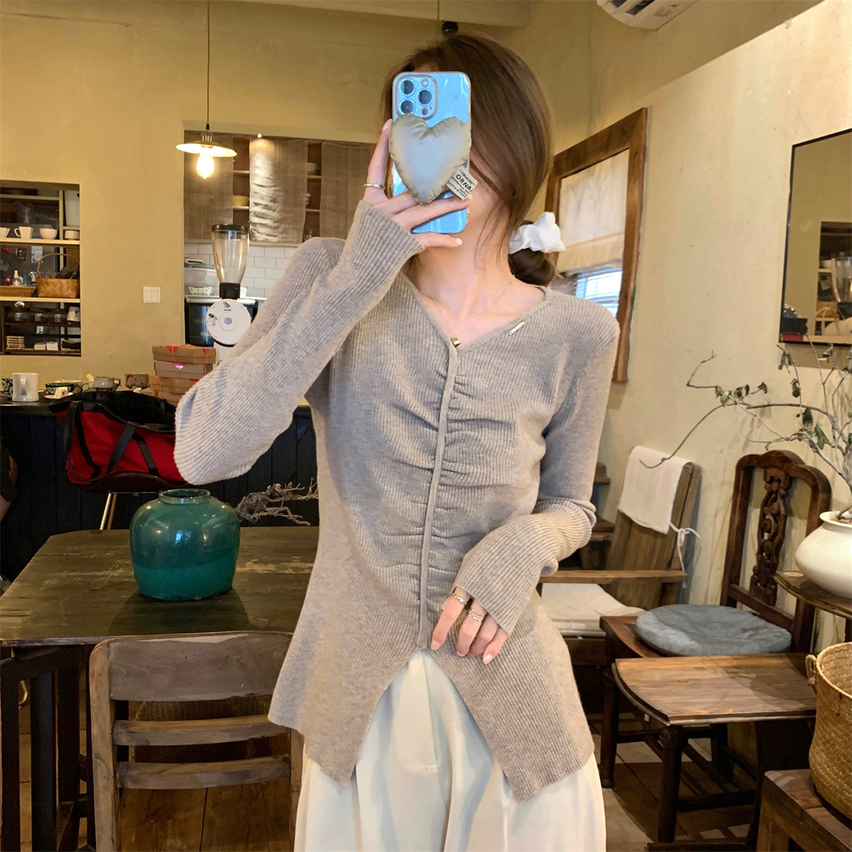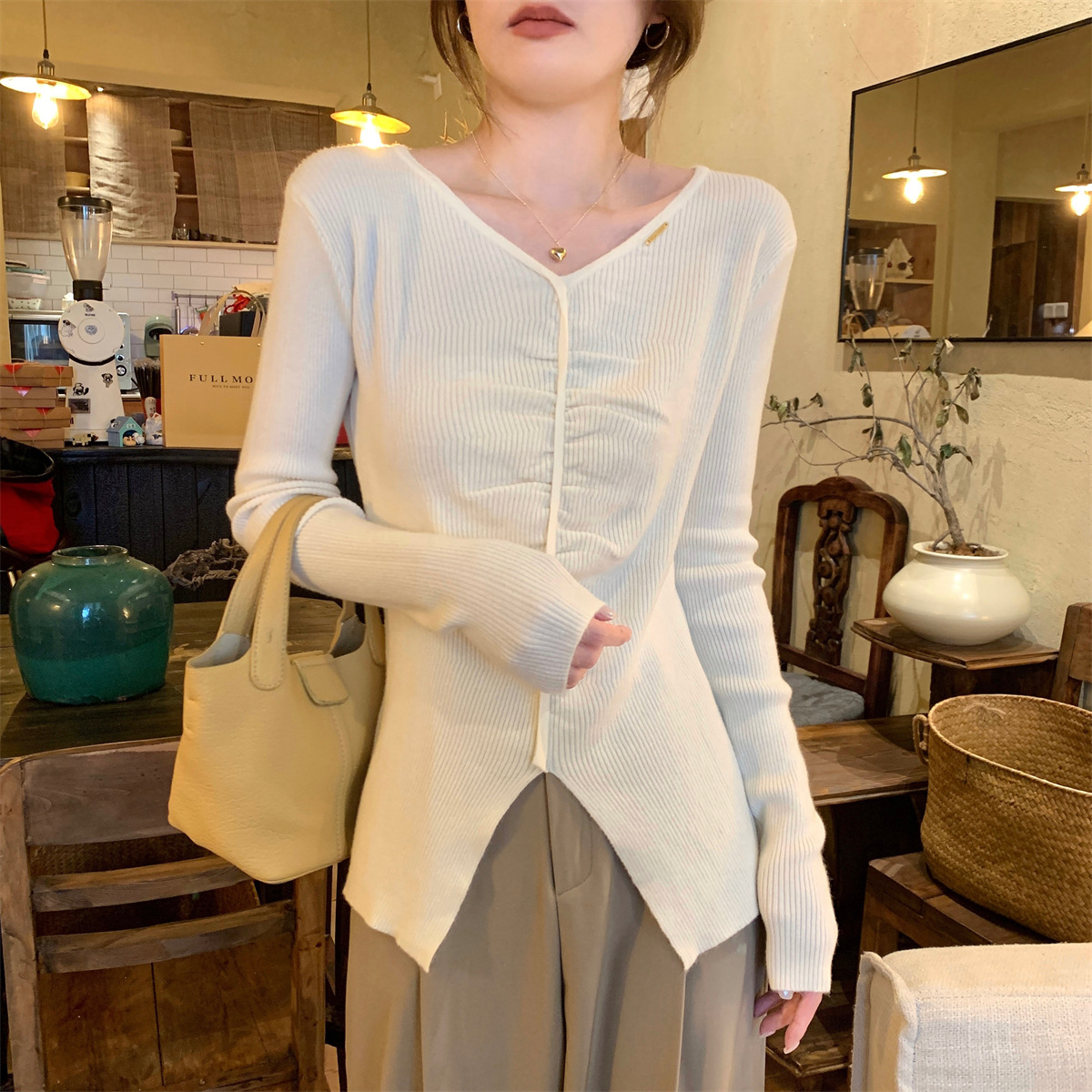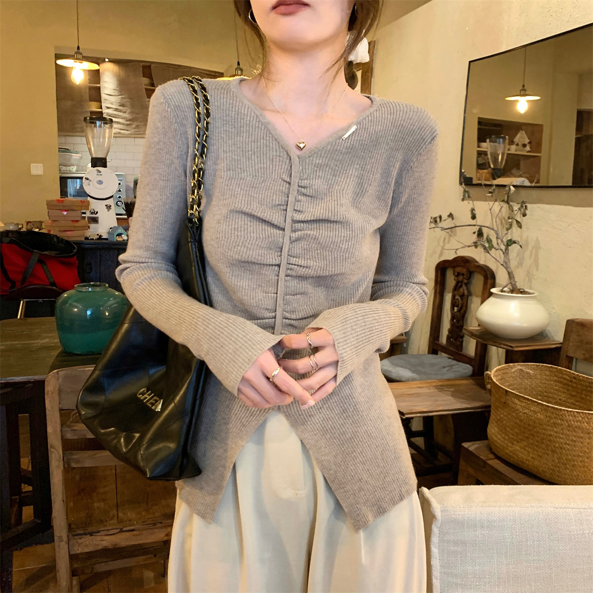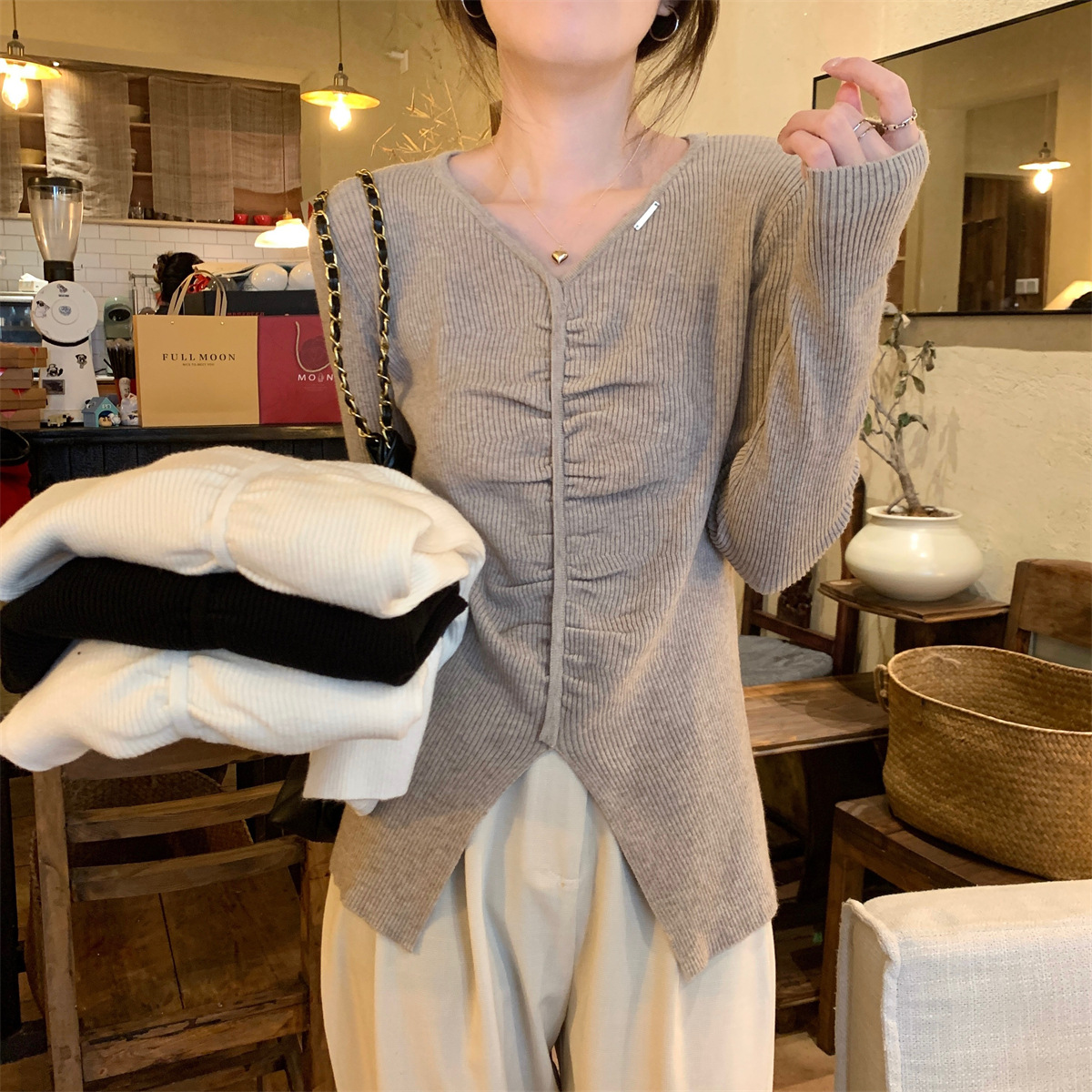 JMA-410 实拍 2023秋冬季韩版气质V领褶皱开叉设计感针织长袖打底衫女毛衣