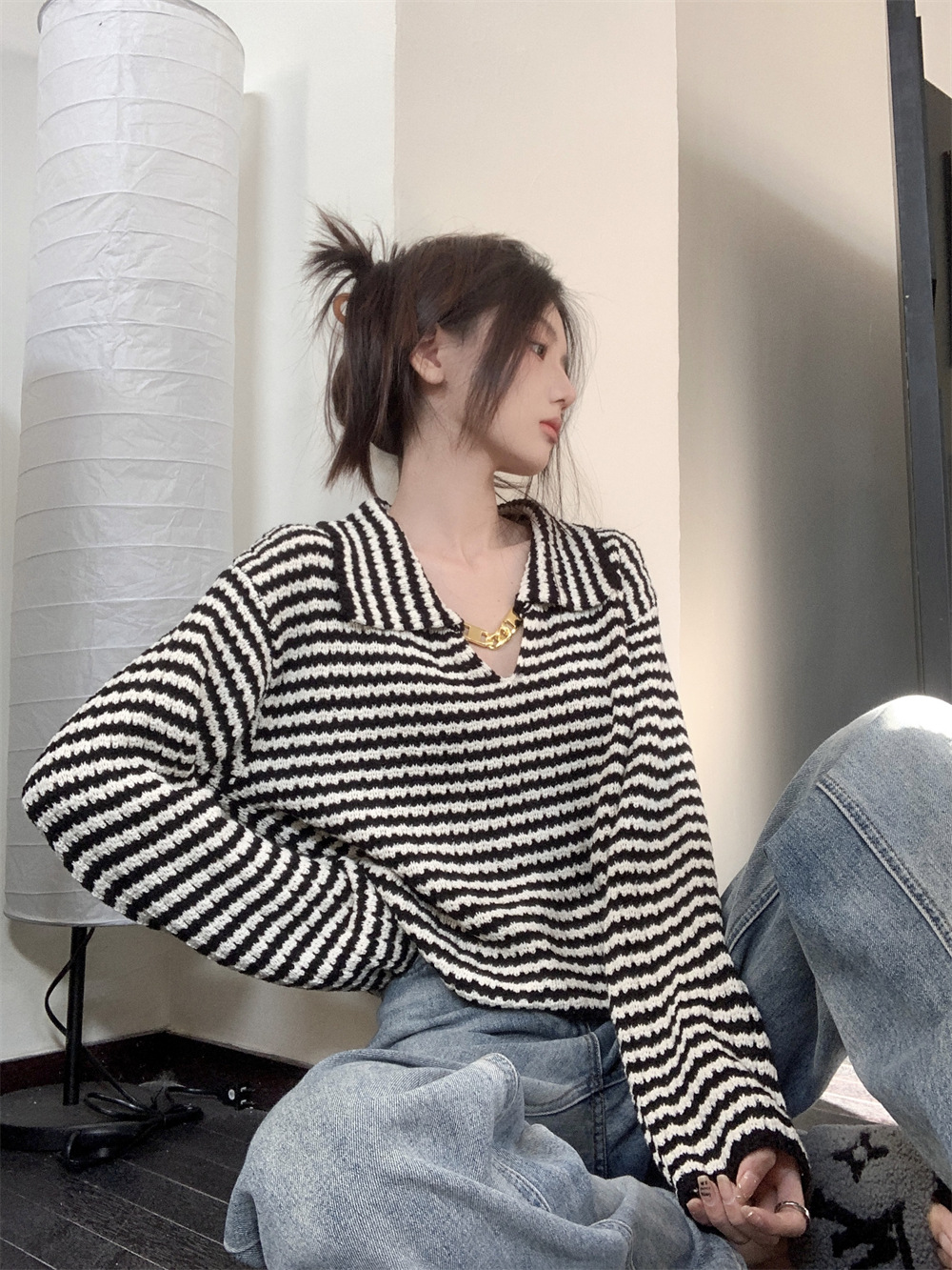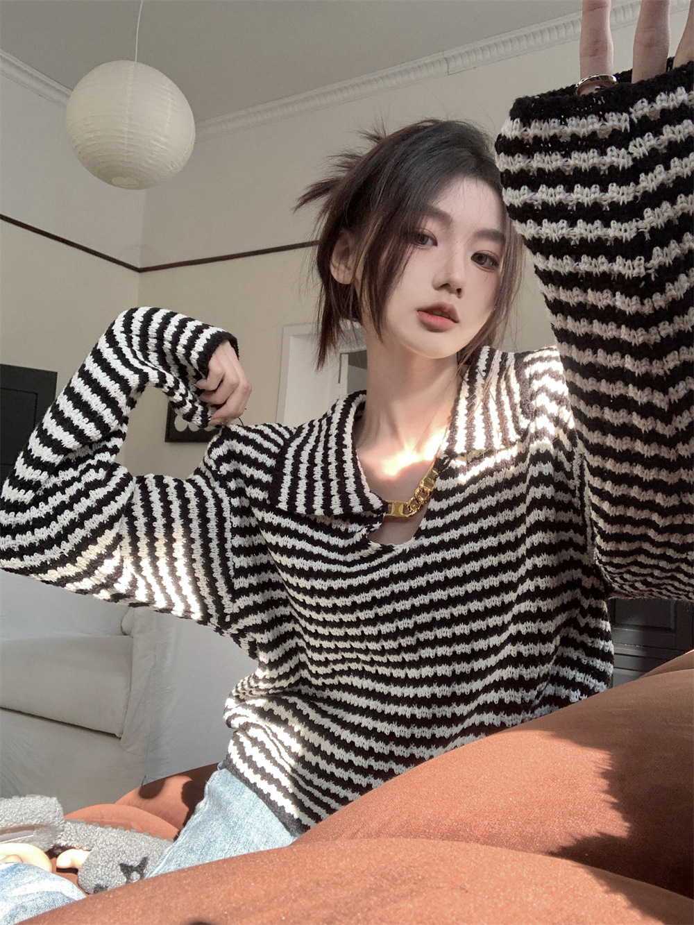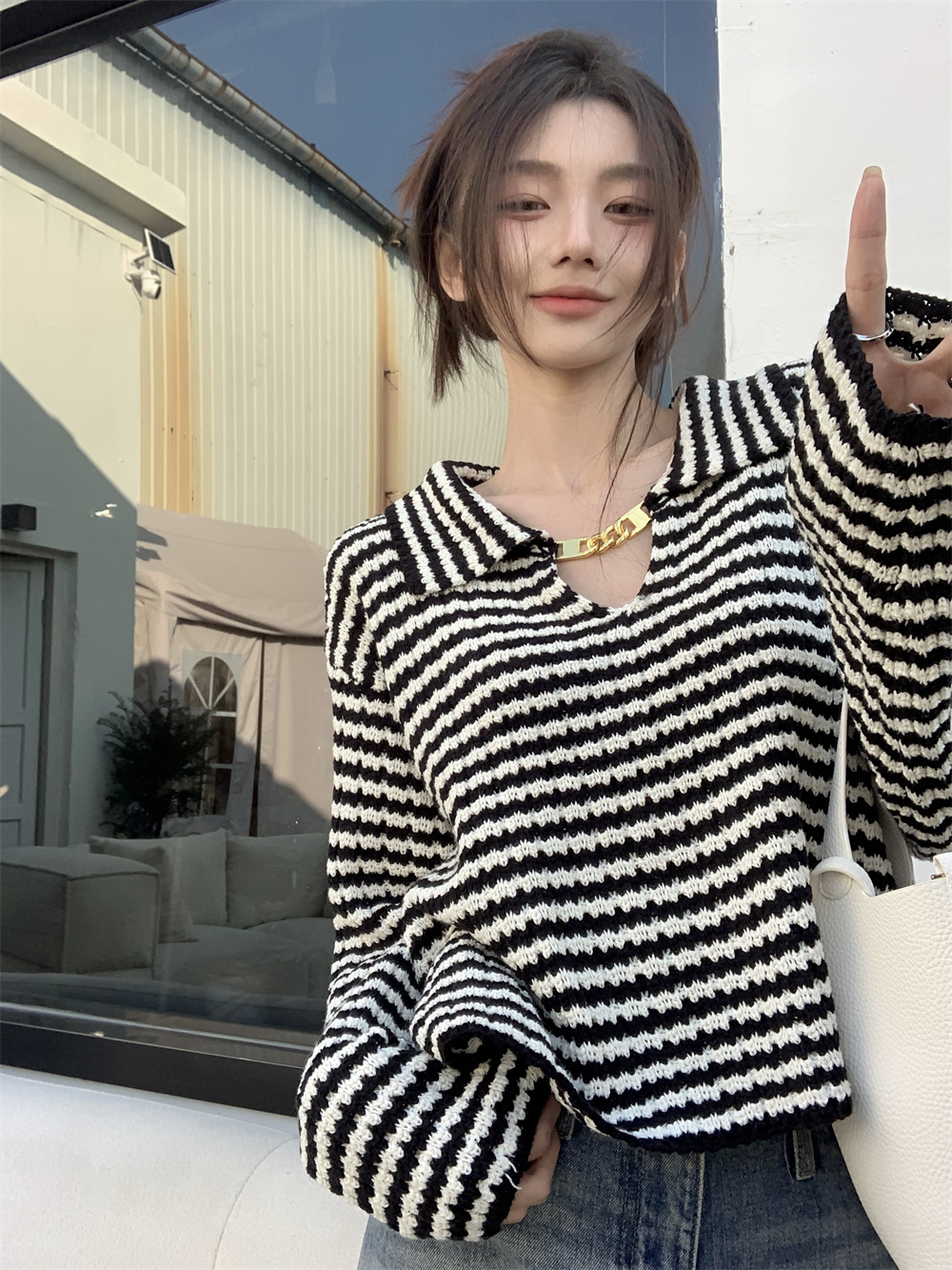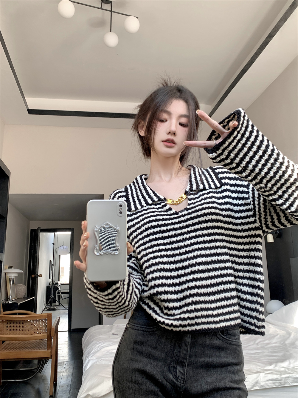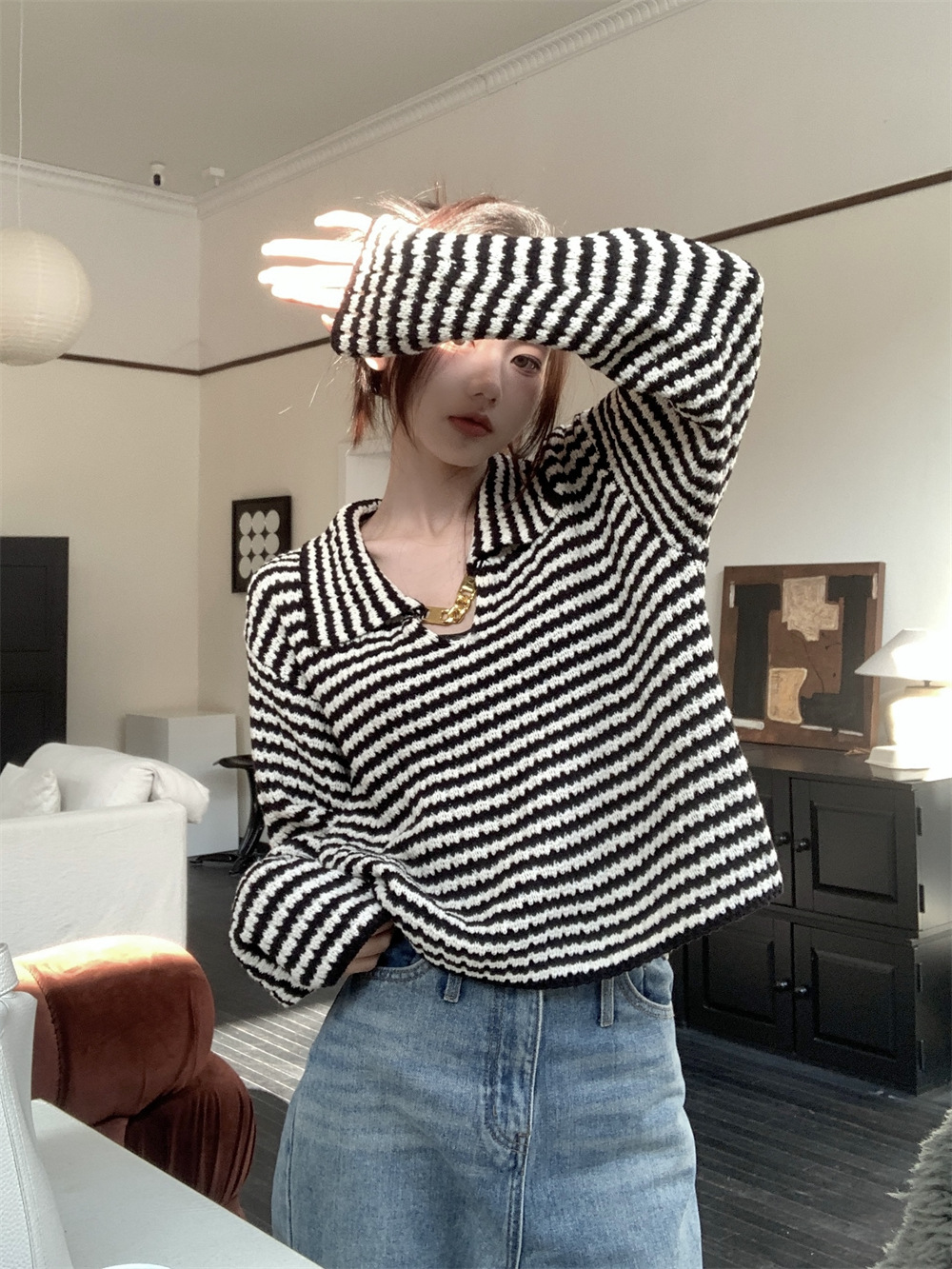JMA-421 实拍 2023秋冬法式赫本风娃娃领条纹翻领针织衫女金属条宽松上衣