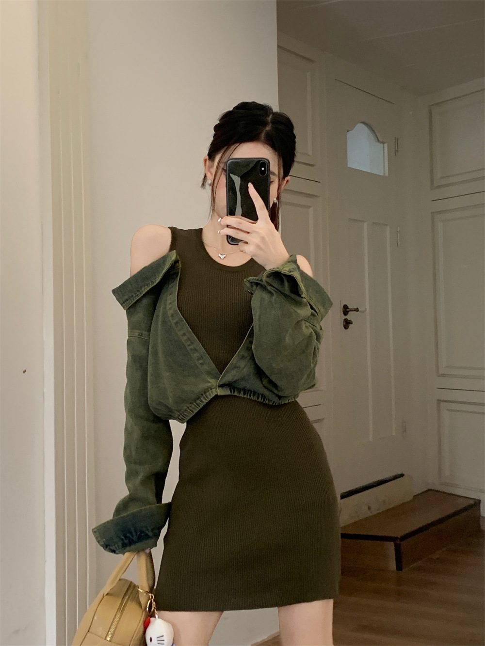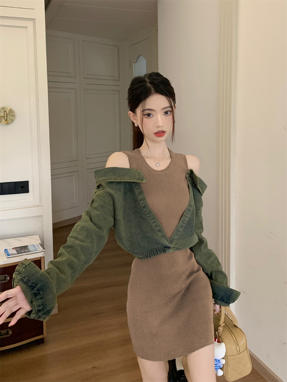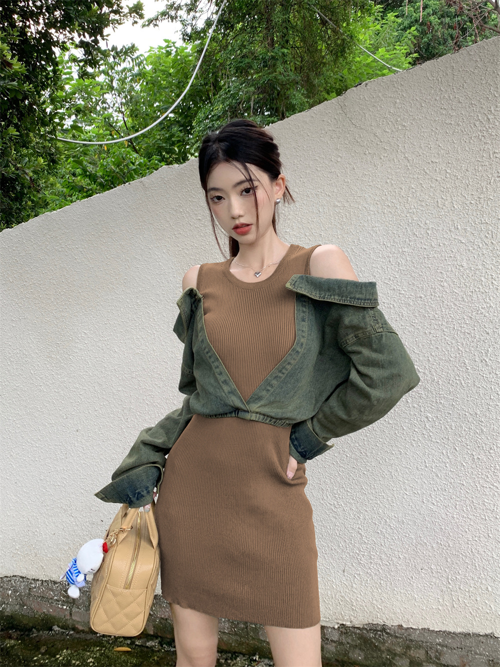 JMA-450 实拍 秋季韩版设计感小众假两件牛仔拼接露肩显瘦长袖针织连衣裙