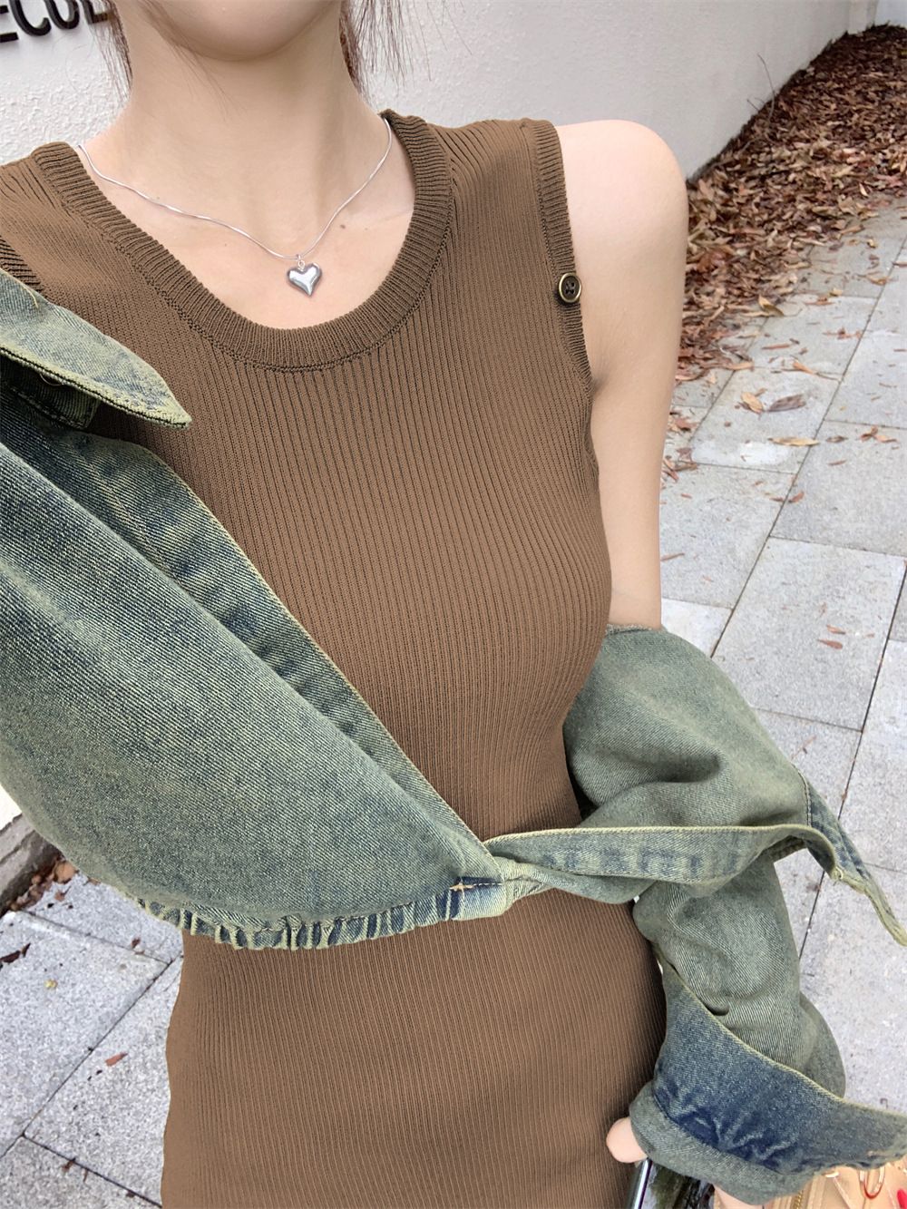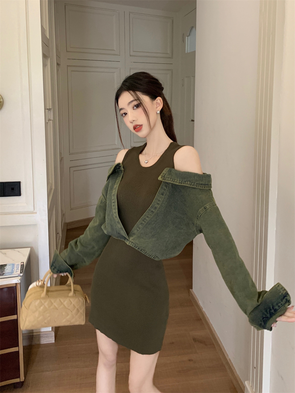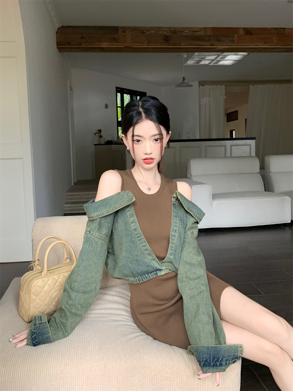 JMA-450 实拍 秋季韩版设计感小众假两件牛仔拼接露肩显瘦长袖针织连衣裙