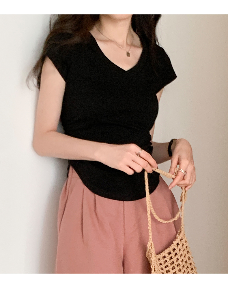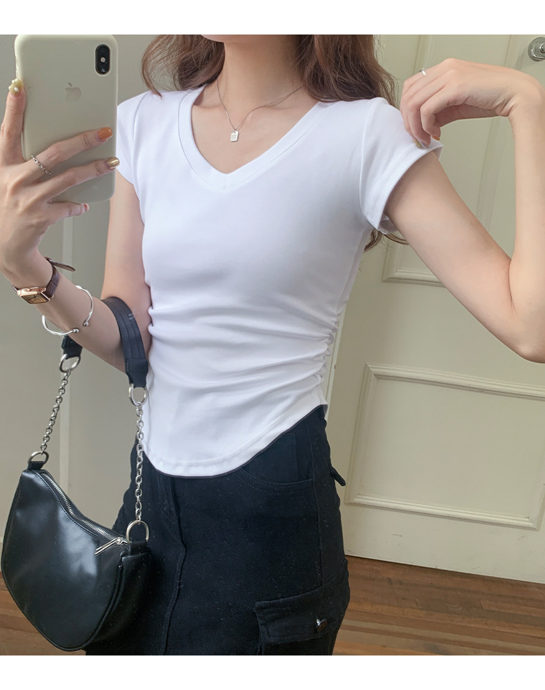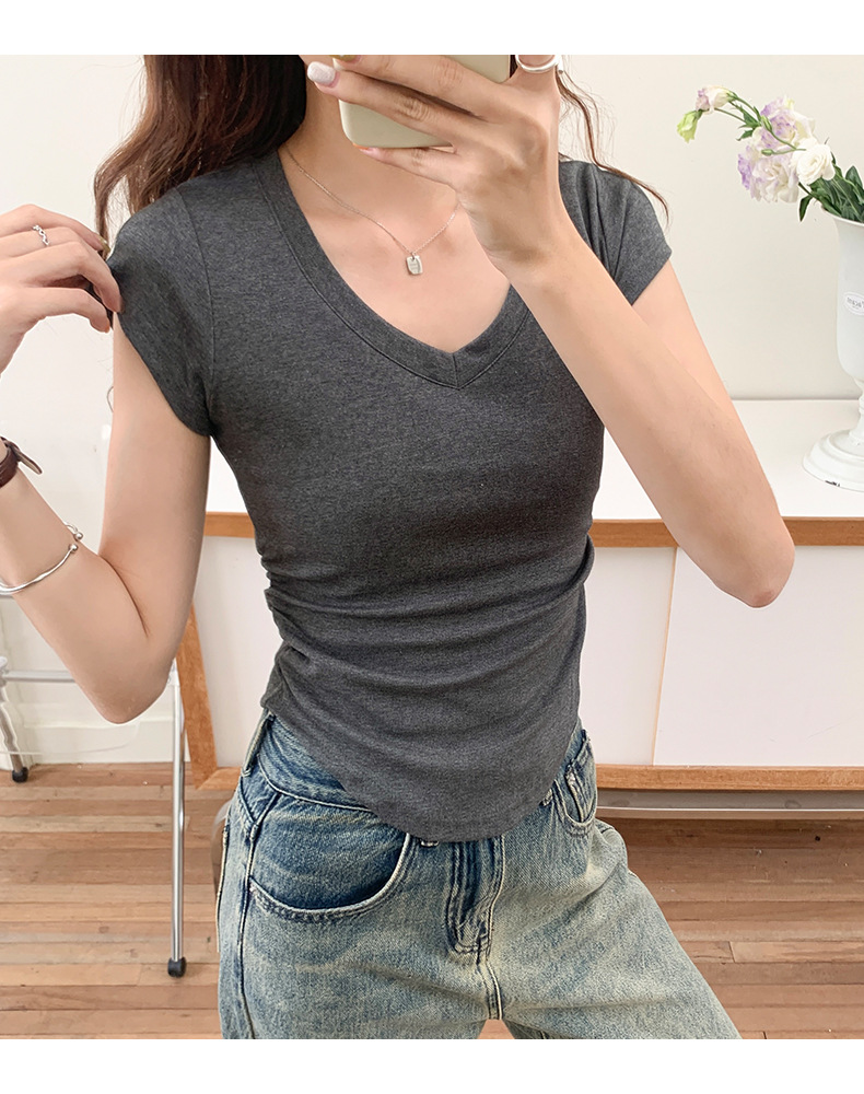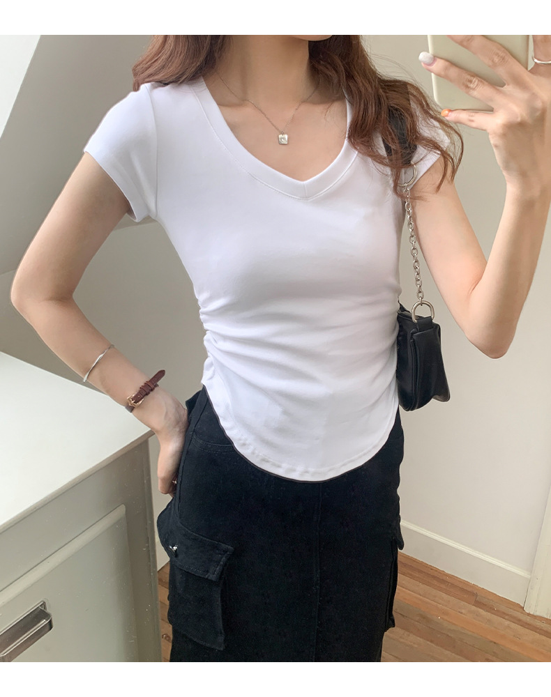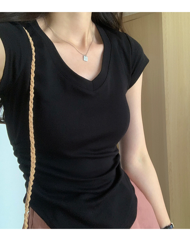 JMA-457 实拍 辣妹不规则V领正肩短袖T恤2023夏设计感收腰修身短款上衣潮