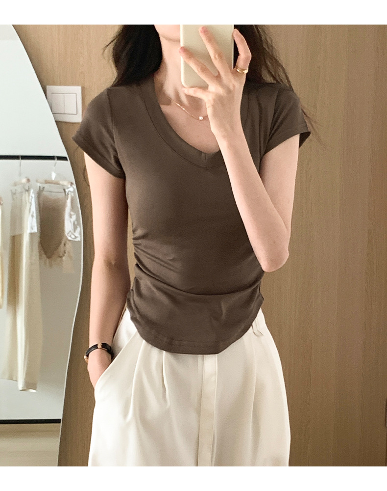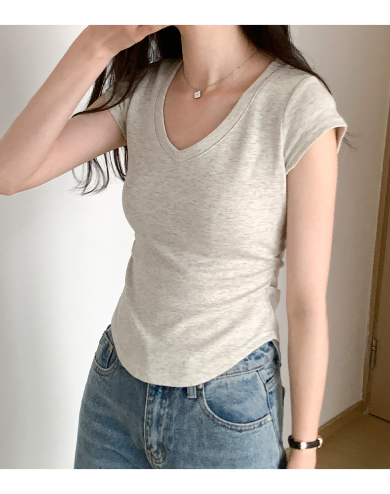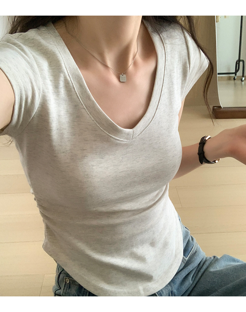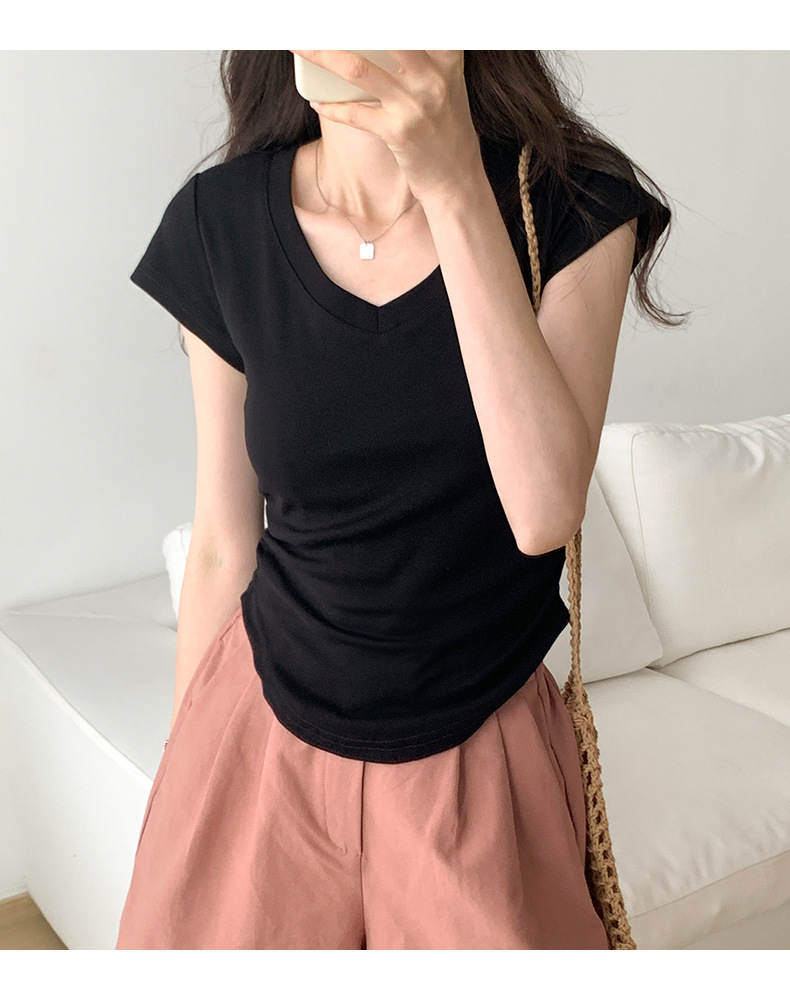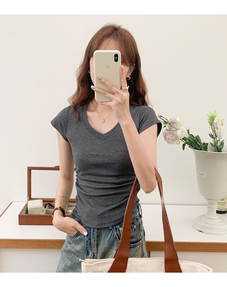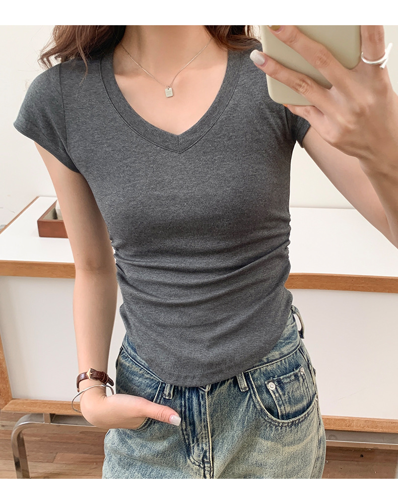 JMA-457 实拍 辣妹不规则V领正肩短袖T恤2023夏设计感收腰修身短款上衣潮
