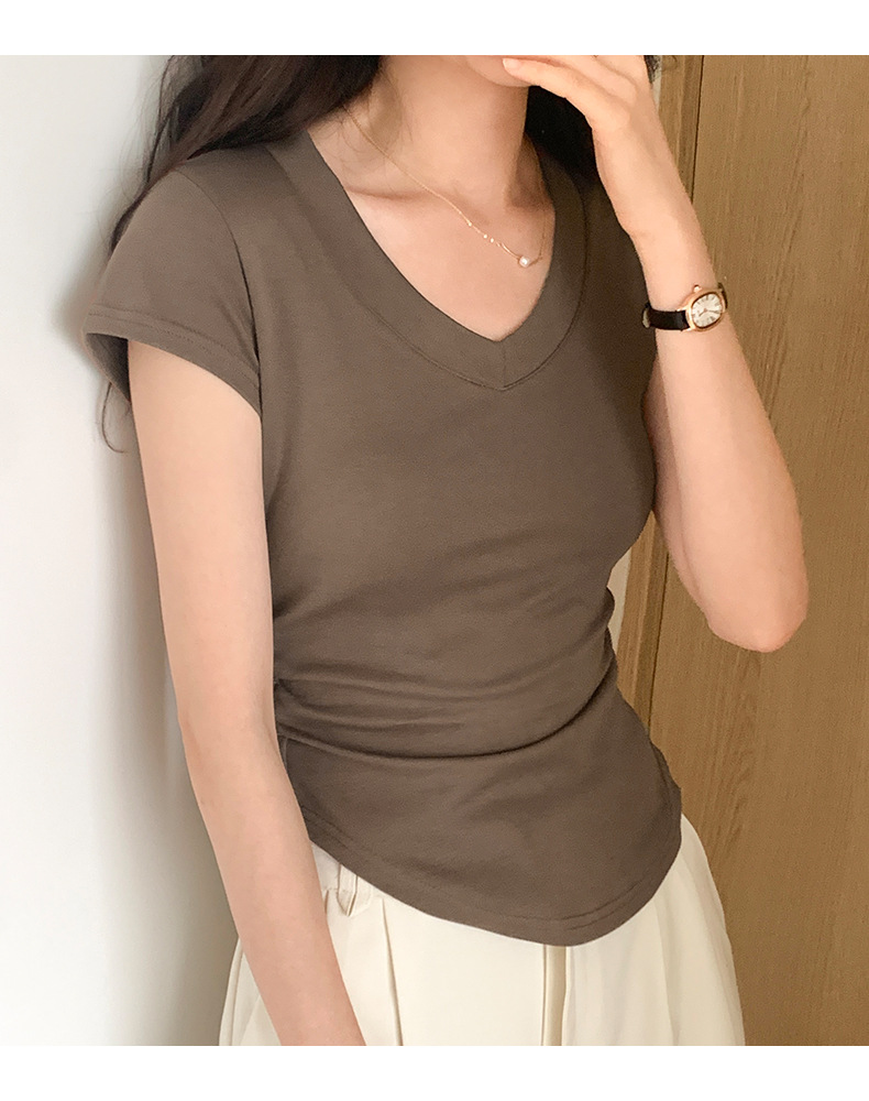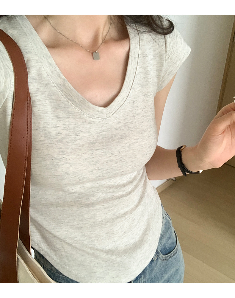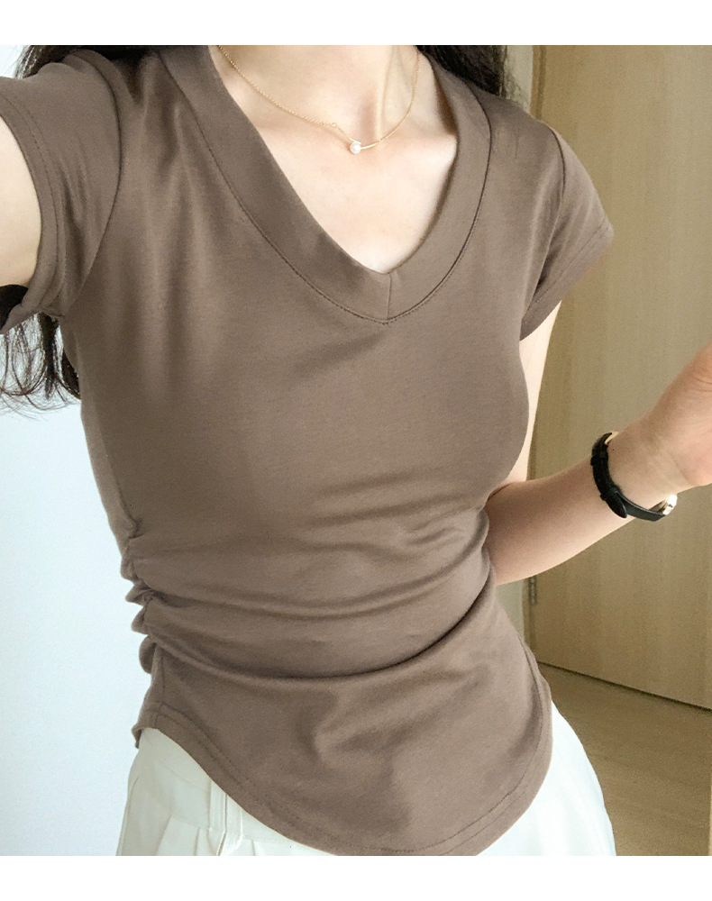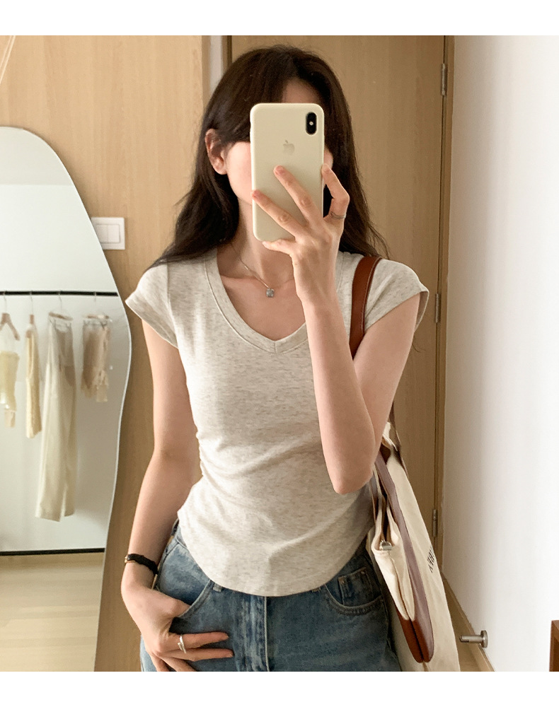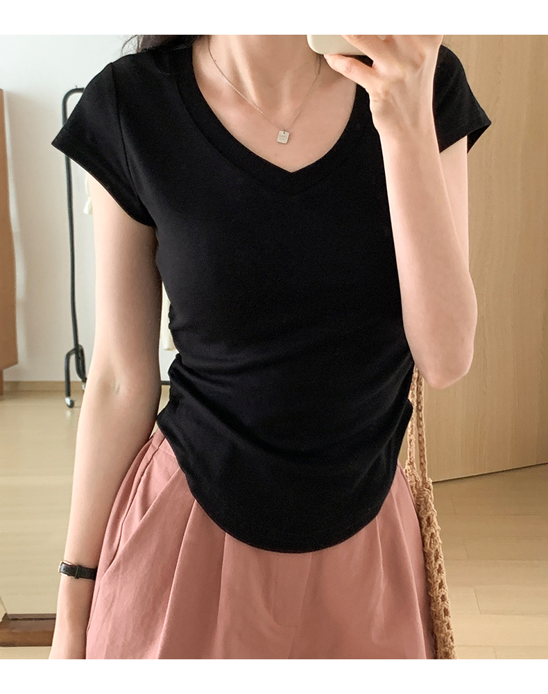 JMA-457 实拍 辣妹不规则V领正肩短袖T恤2023夏设计感收腰修身短款上衣潮