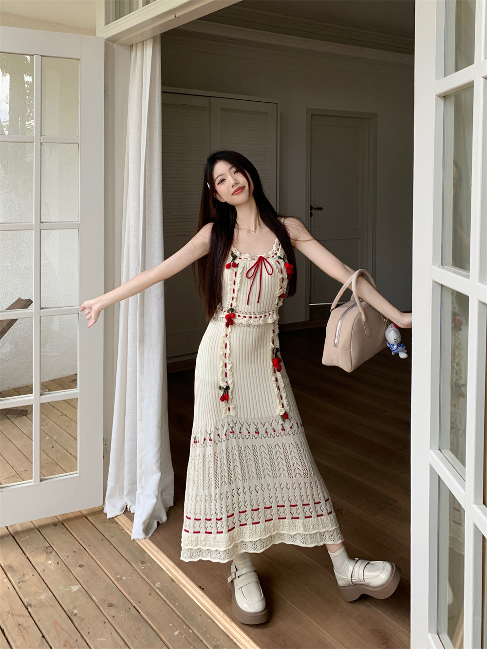 JMA-483 实拍 秋季法式蕾丝印花中长款鱼骨吊带连衣裙+宽松长袖针织衫开衫
