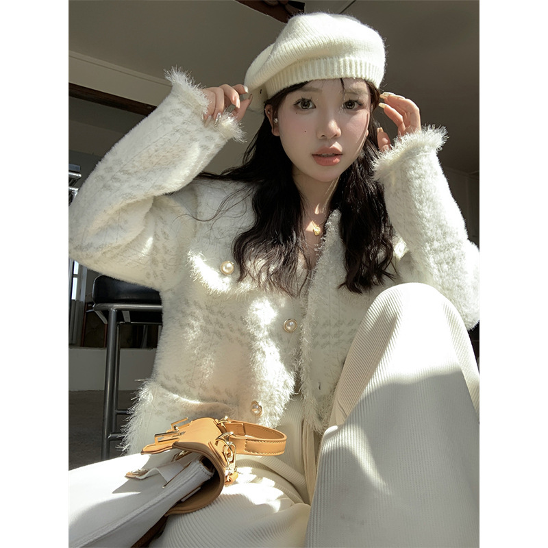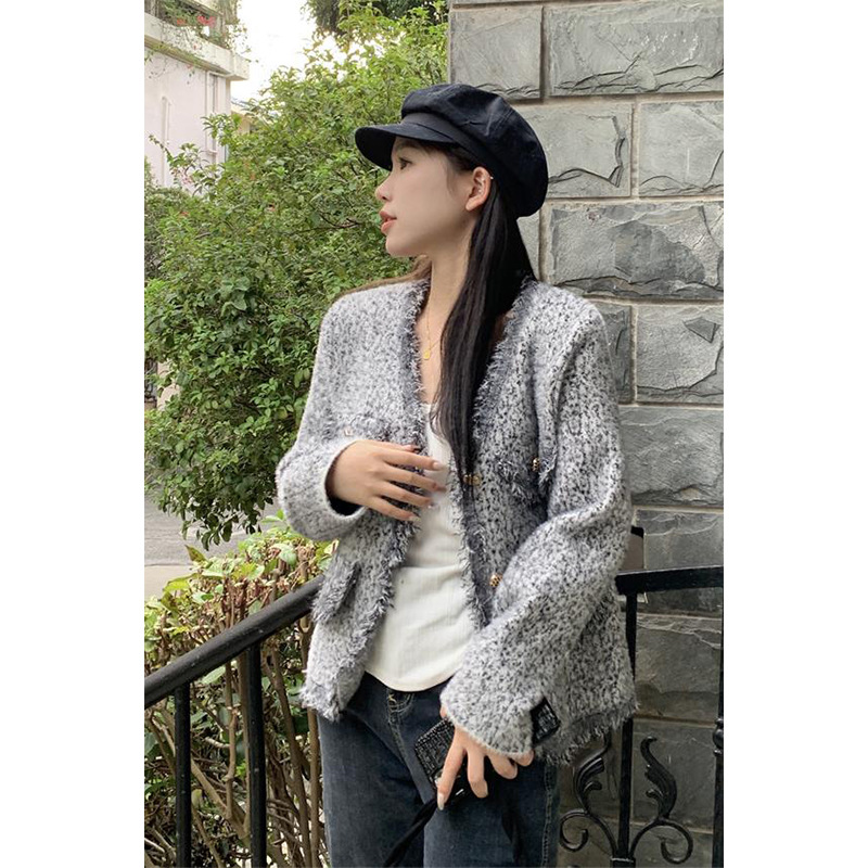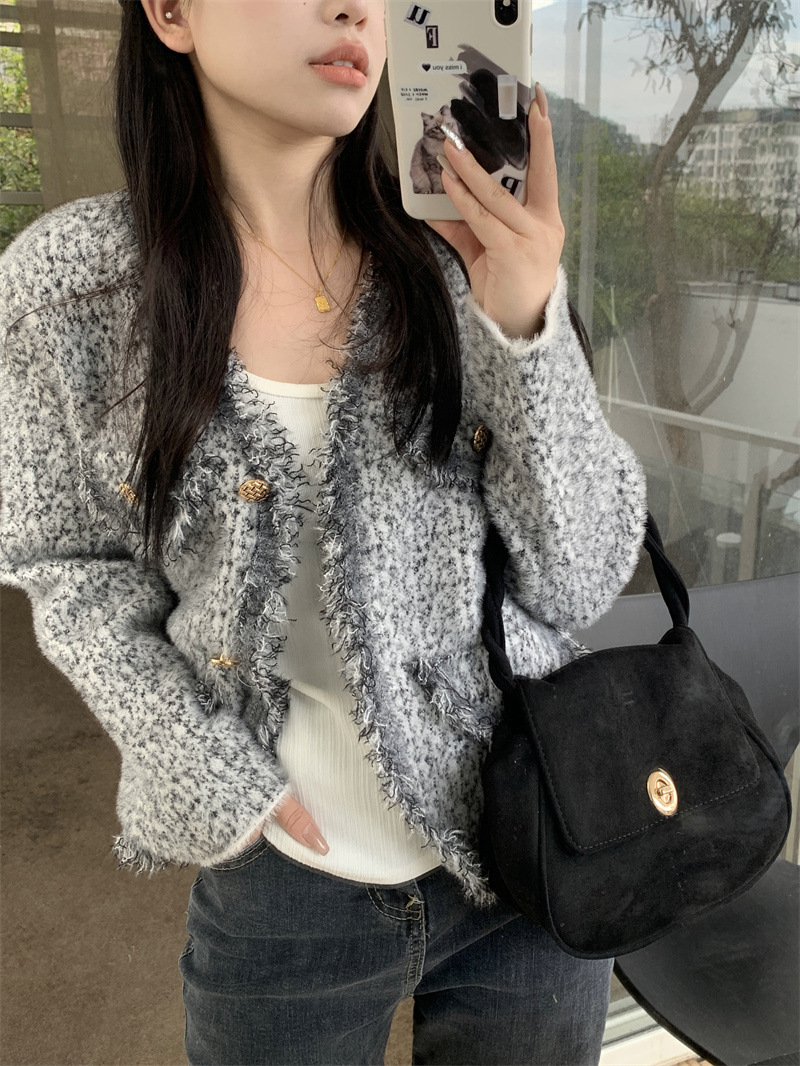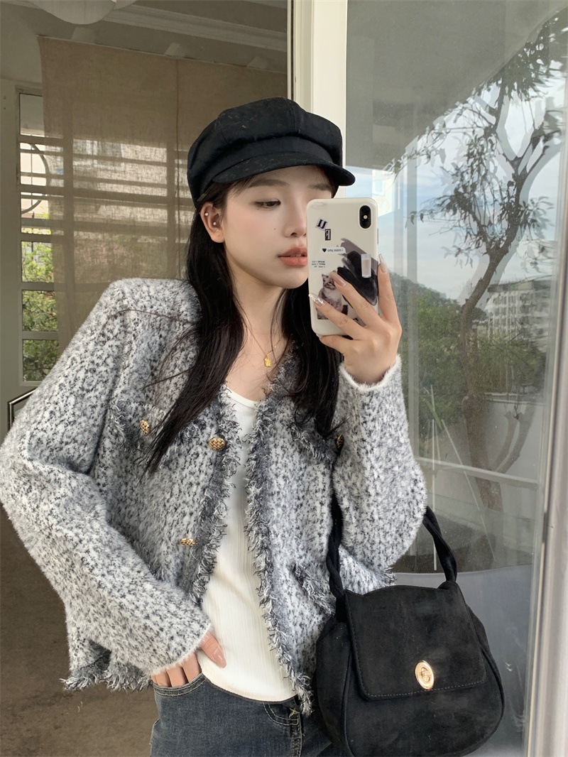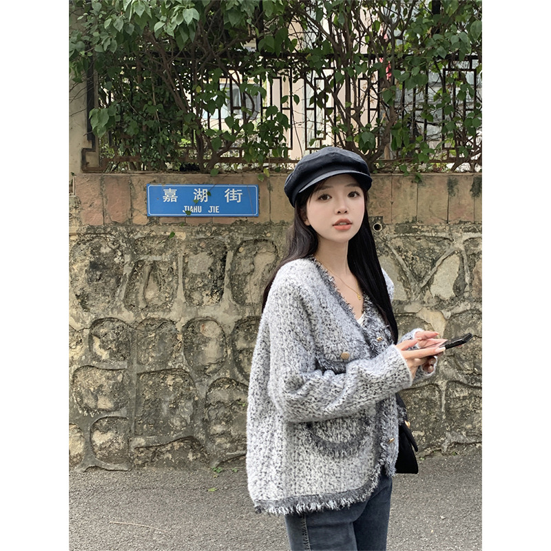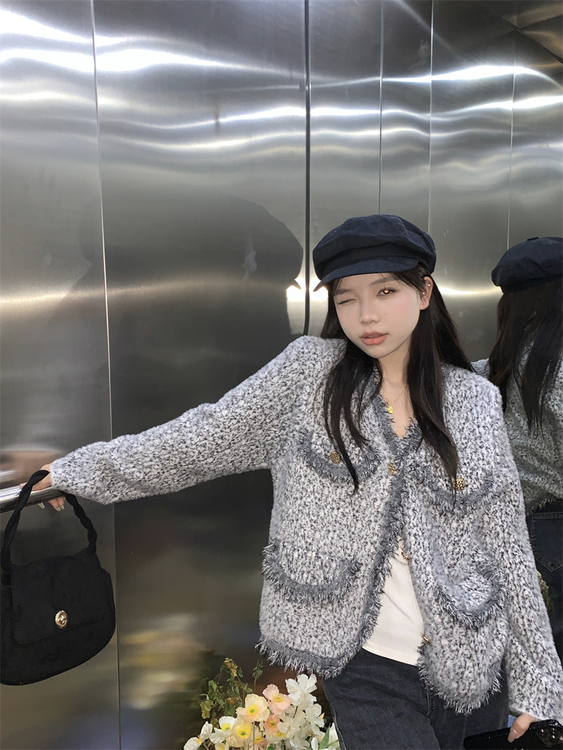 JMA-490 实拍2023秋冬季新款韩版小香风流苏边杂花毛线高级感小众开衫外套