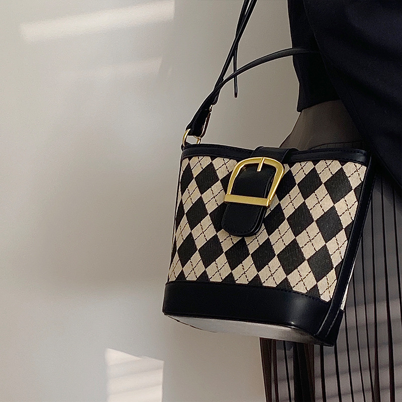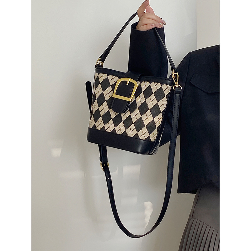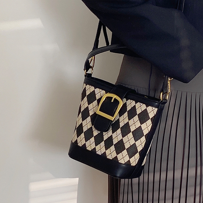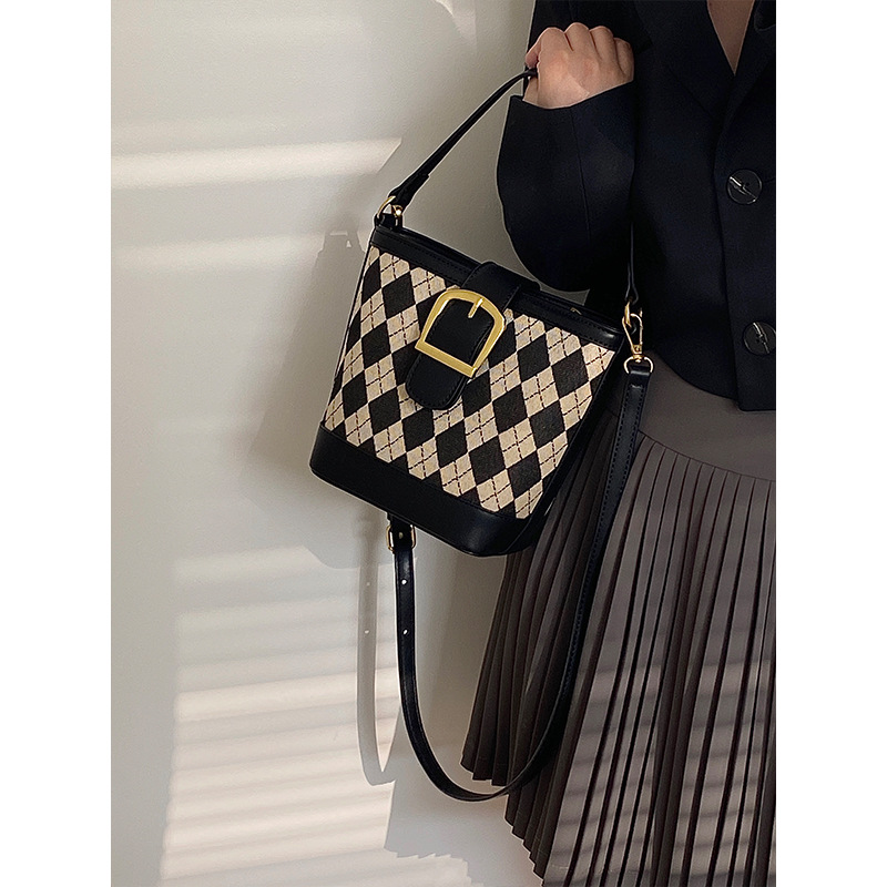 JM-889 小众设计新款女包高级感复古手提包菱格单肩斜挎水桶包