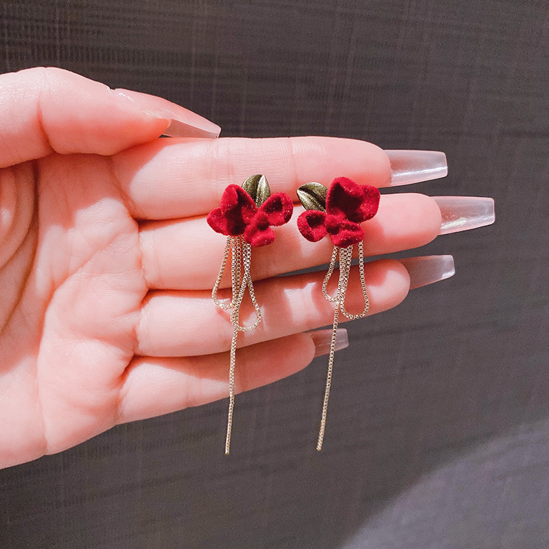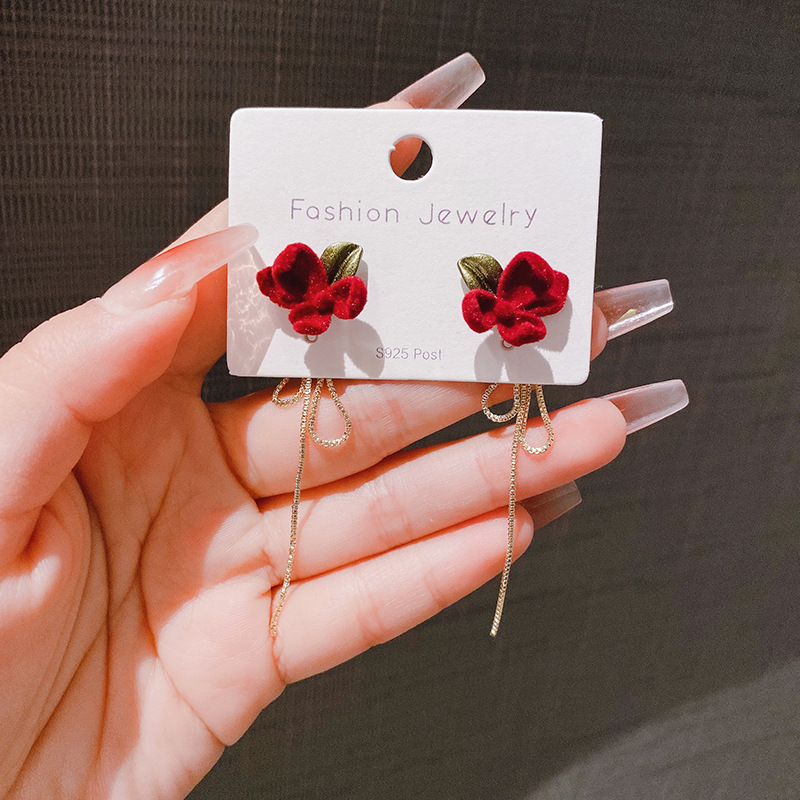 JME-484 复古酒红色设计感耳钉高级感中古丝绒栀子花耳环两戴流苏耳坠批发