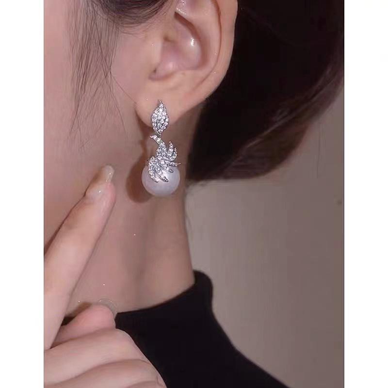 JME-485 2023新款抖音同款轻奢微镶锆石叶子珍珠耳环百搭女神淑女气质耳钉