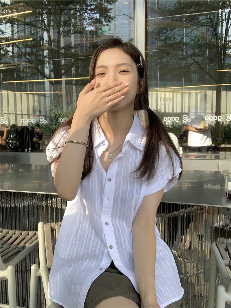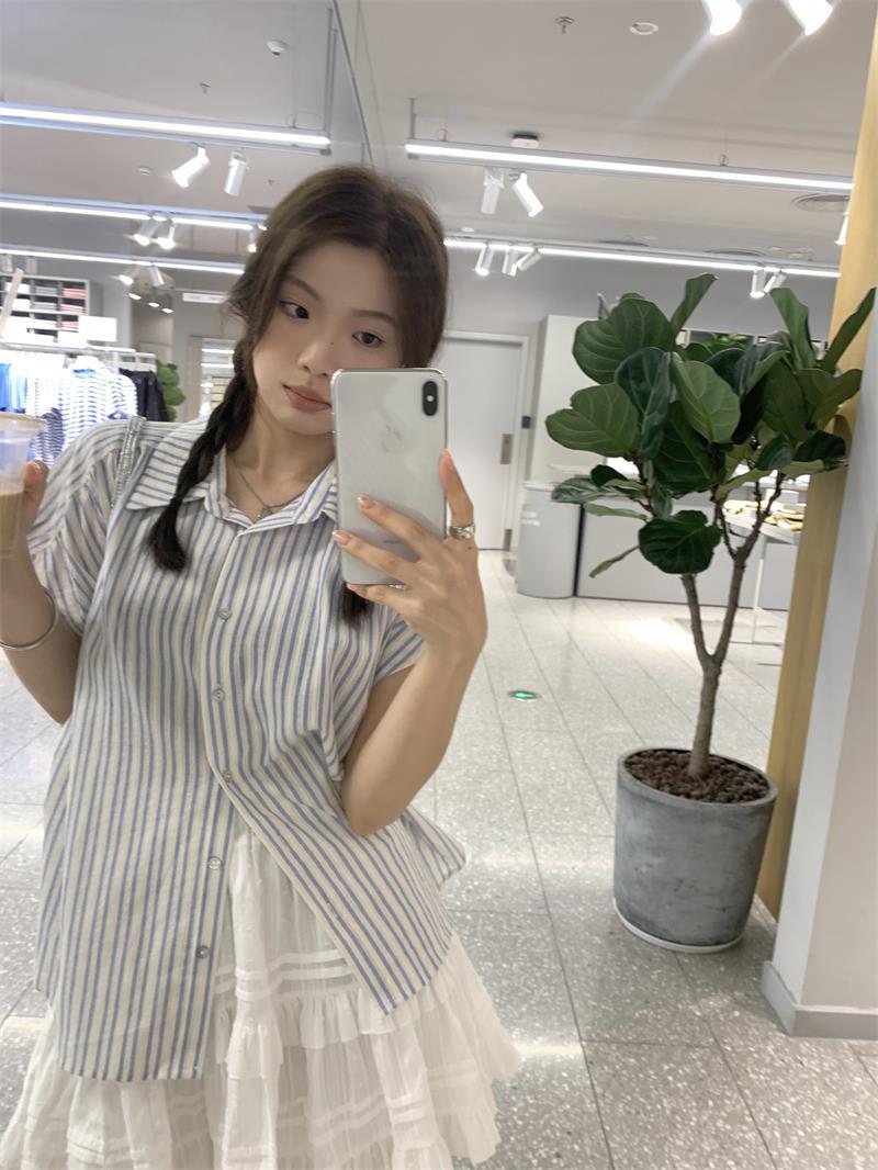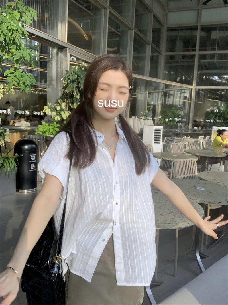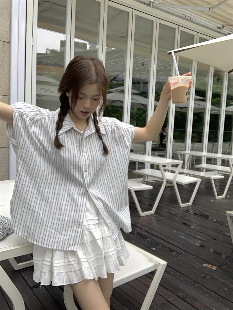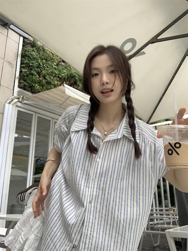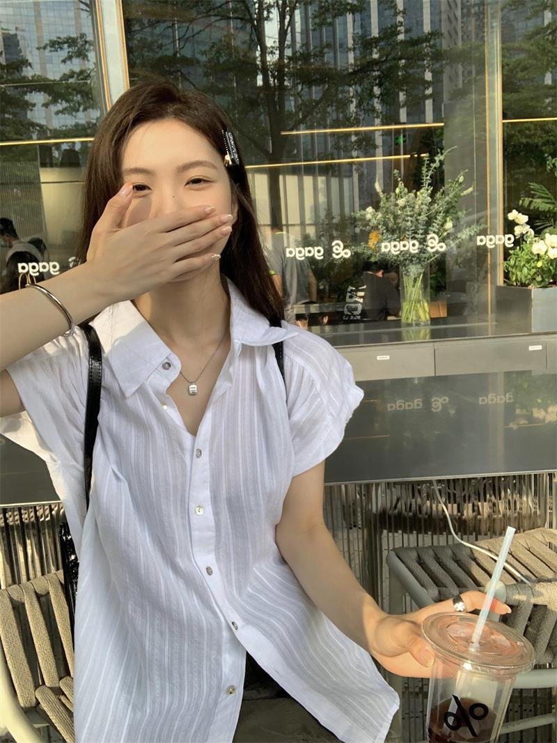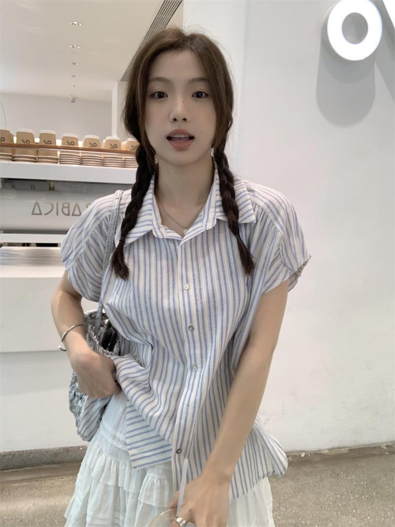 JMA-524 实拍翻领别致小众竖条纹衬衫女薄款2023夏季微落肩设计感抽褶上衣