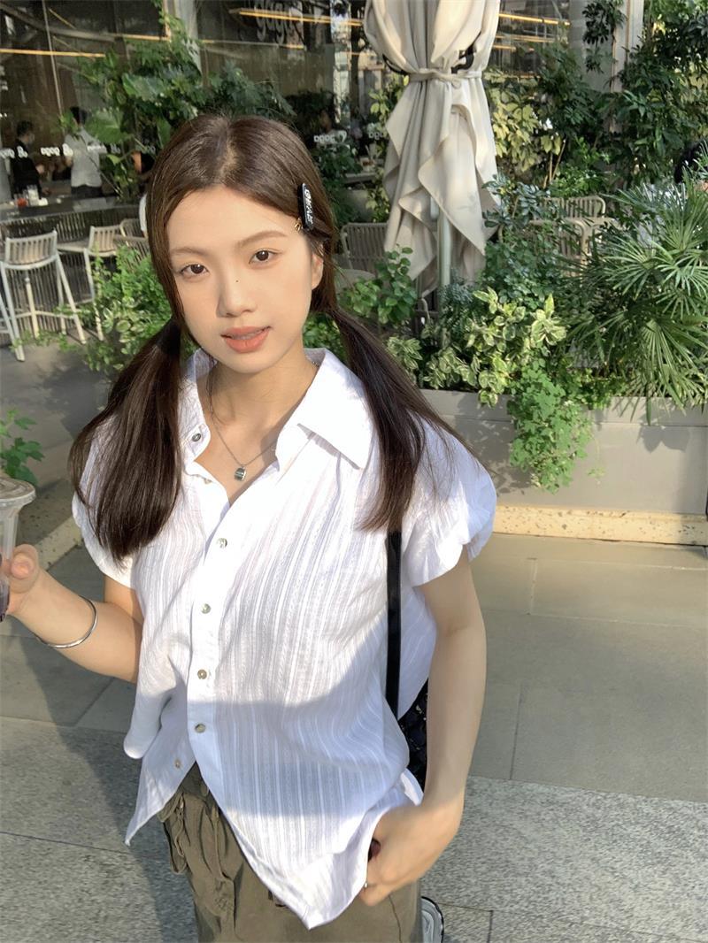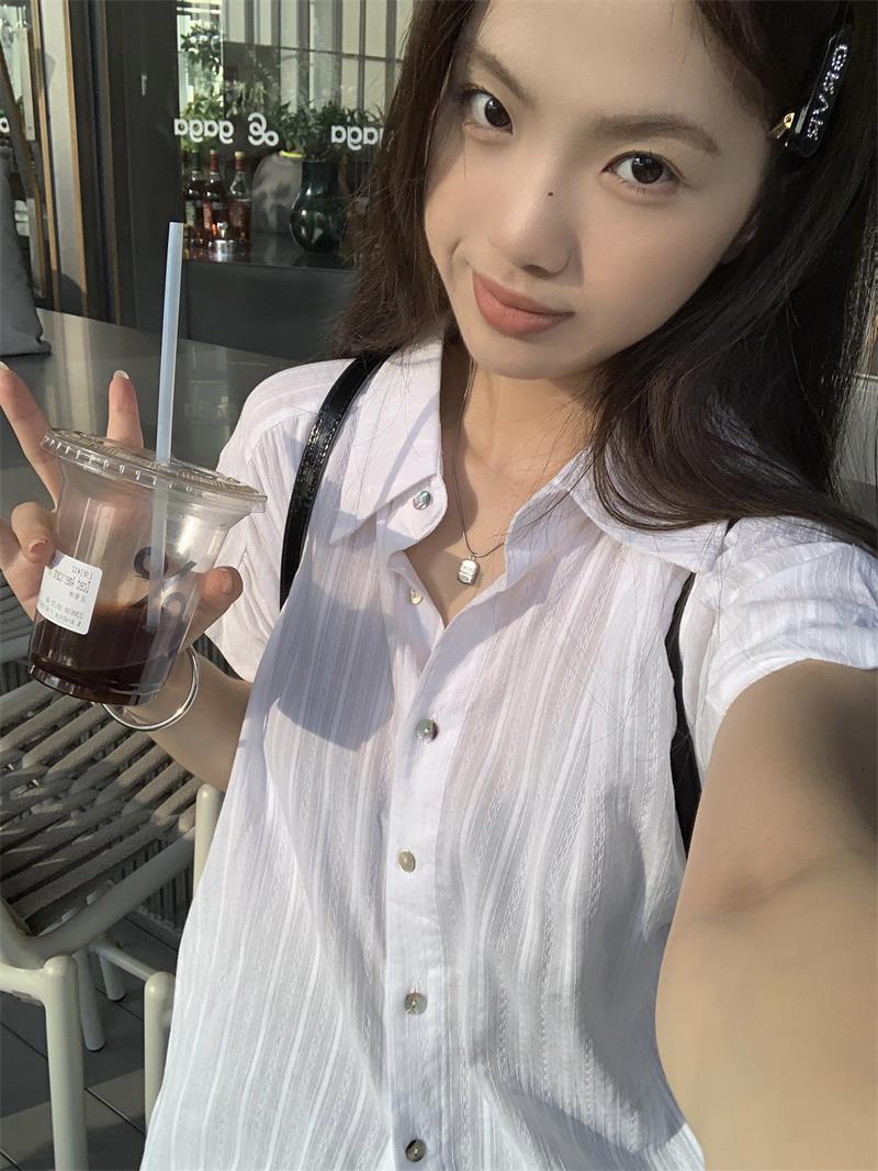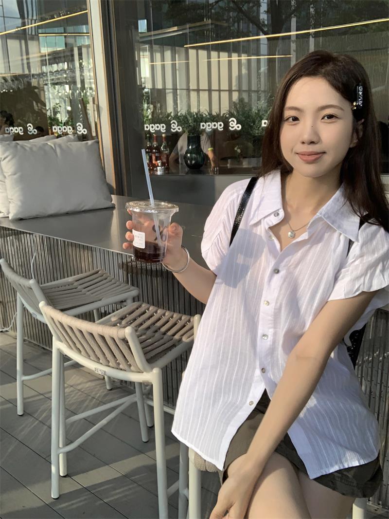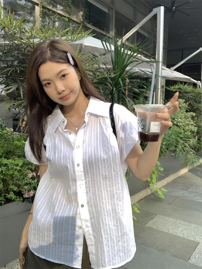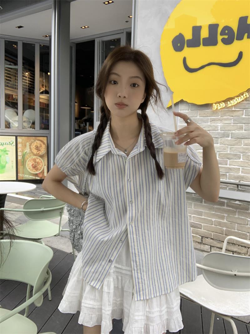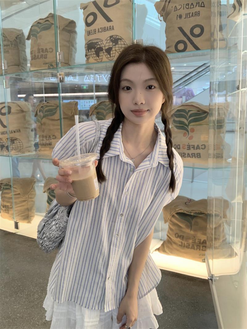 JMA-524 实拍翻领别致小众竖条纹衬衫女薄款2023夏季微落肩设计感抽褶上衣