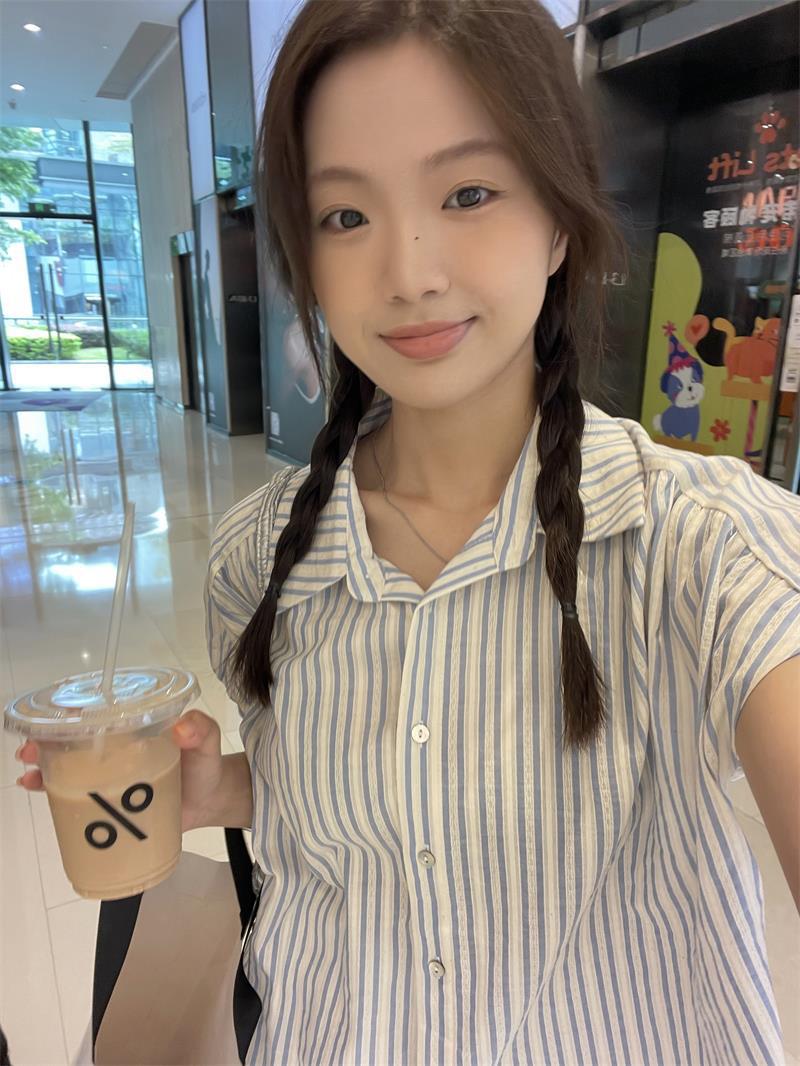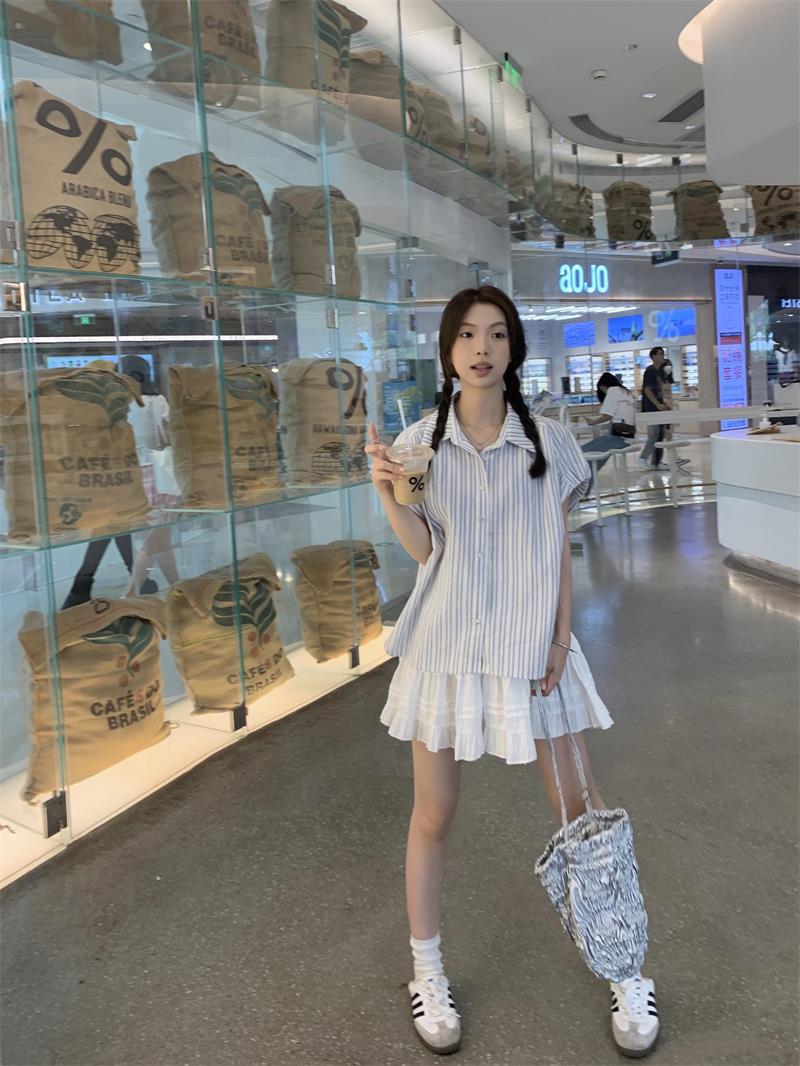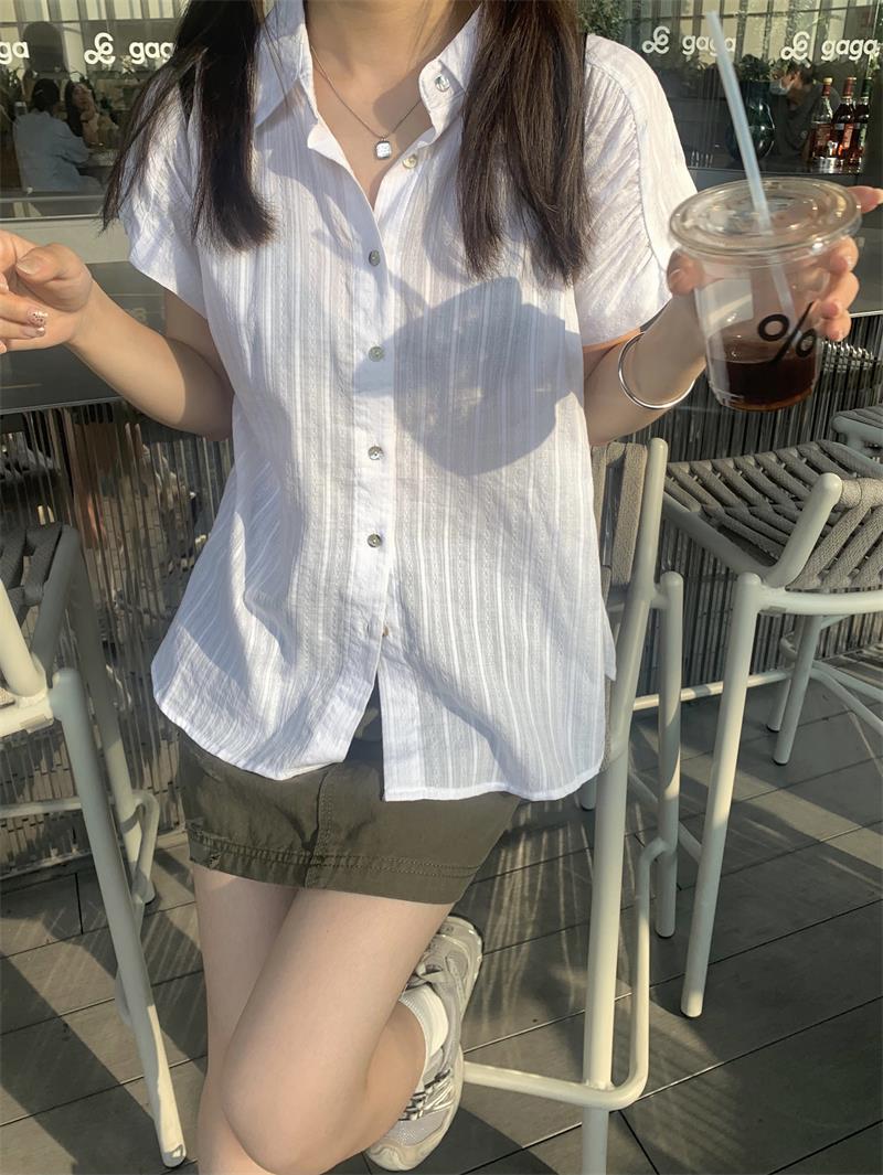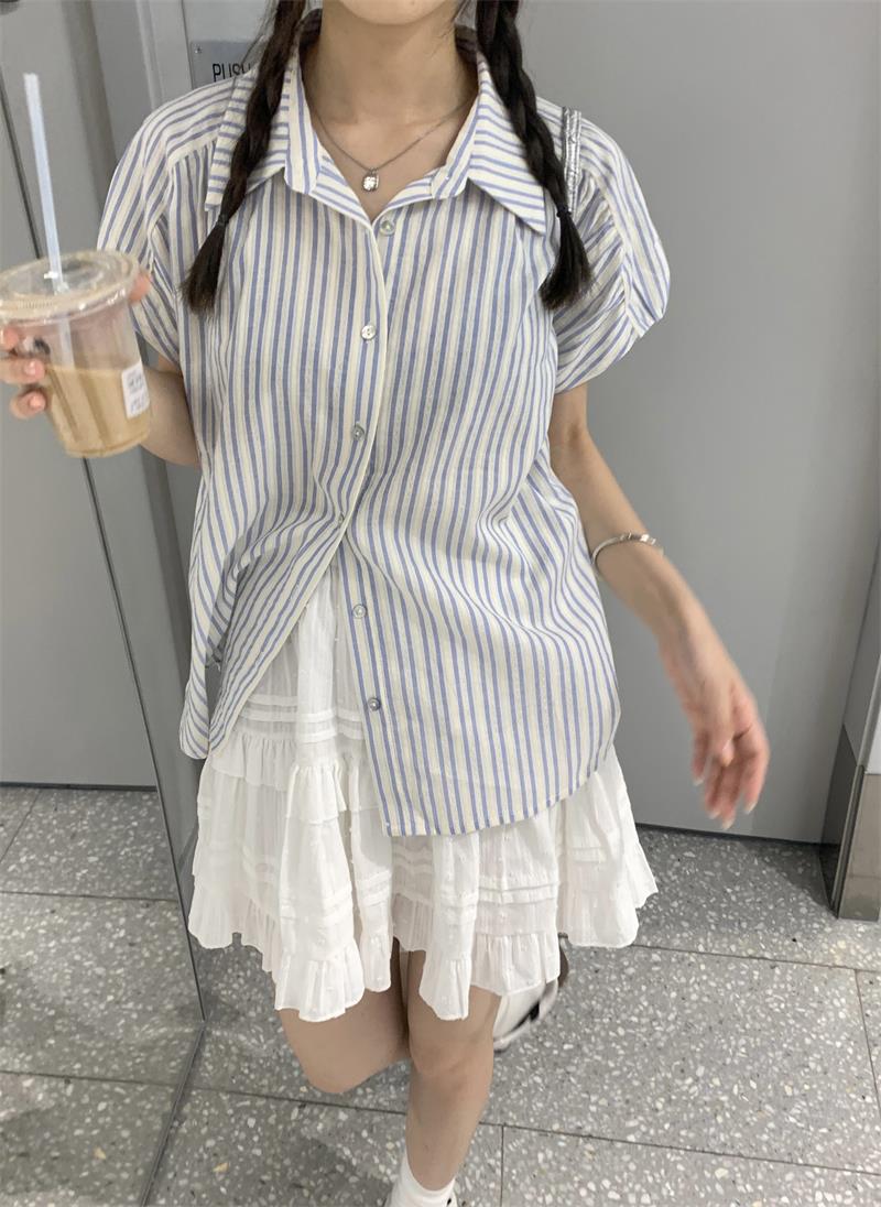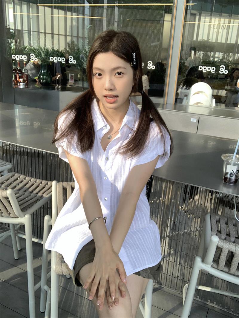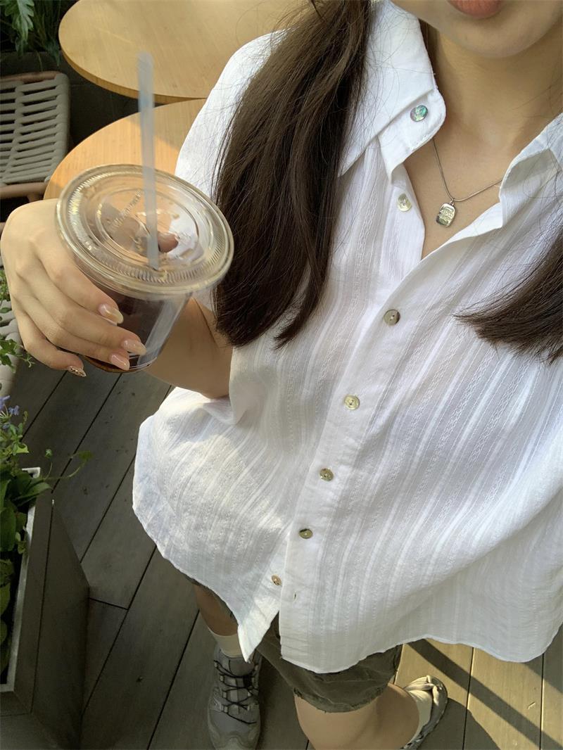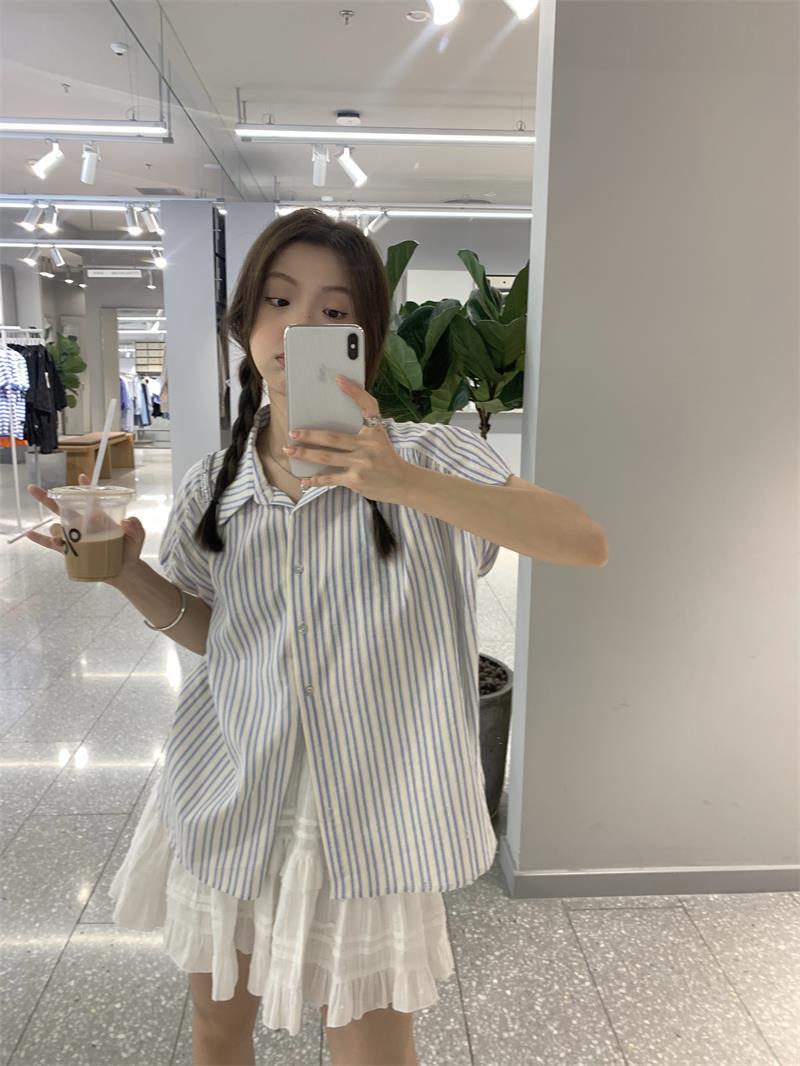 JMA-524 实拍翻领别致小众竖条纹衬衫女薄款2023夏季微落肩设计感抽褶上衣