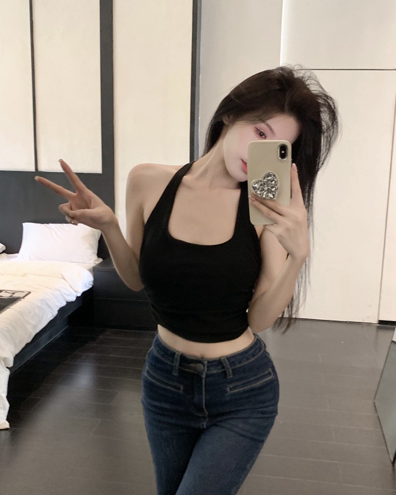 JMA-528 实拍 纯欲风辣妹挂脖大水滴领带胸垫吊带背心免穿bar无袖吊带上衣