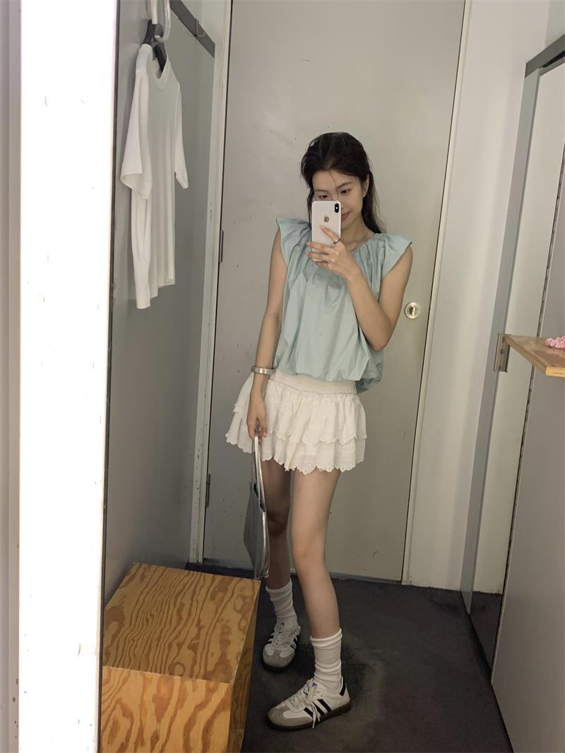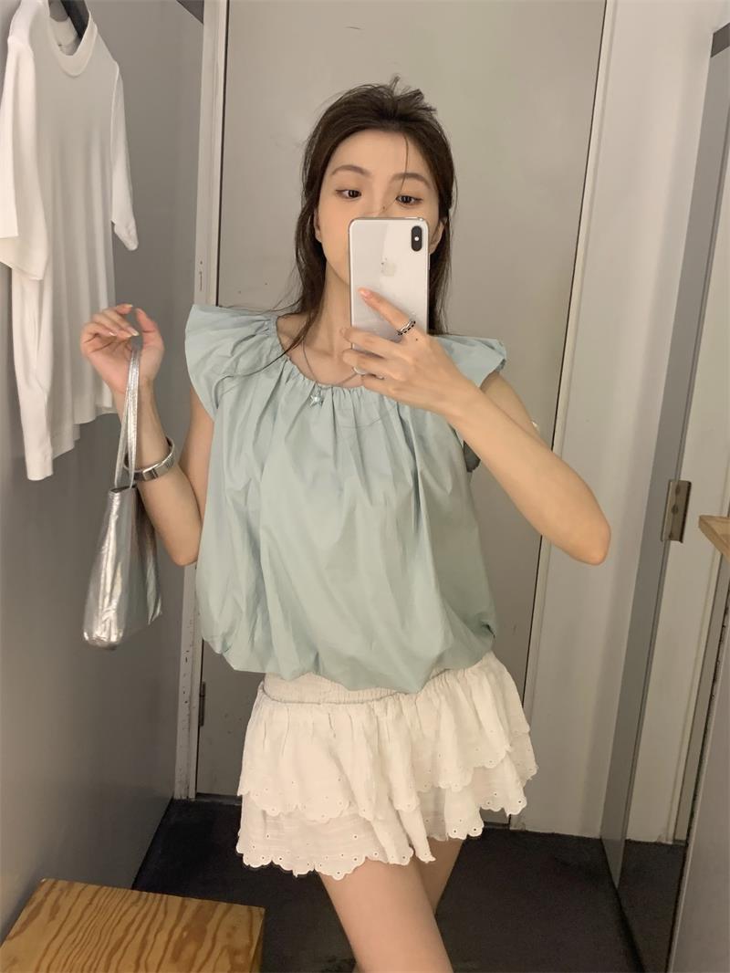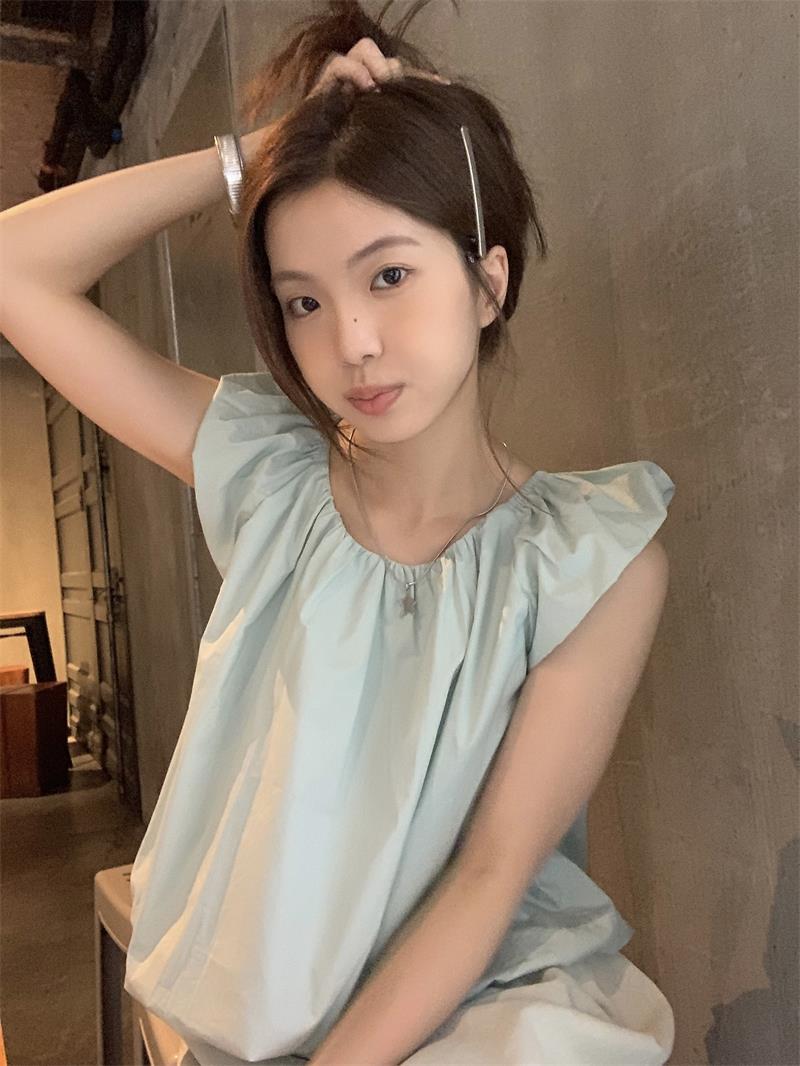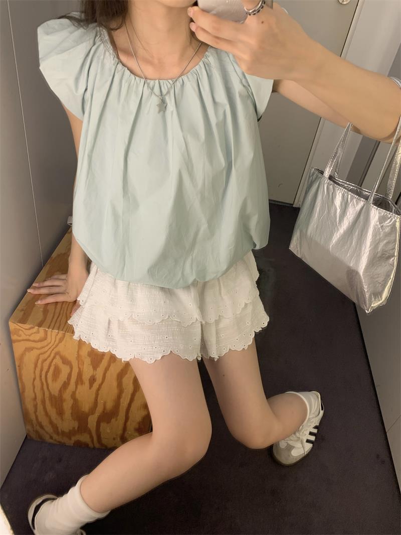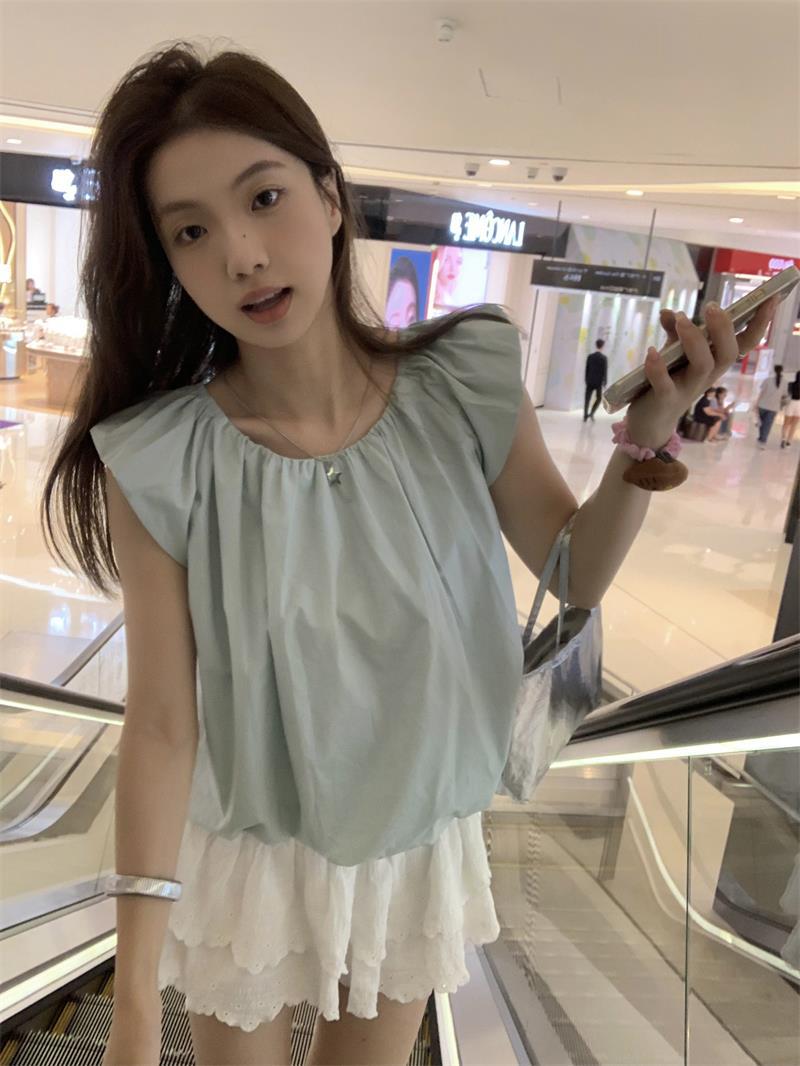 JMA-536 实拍 小飞袖系带衬衫女2023夏季新款韩版小个子短款甜美气质小衫